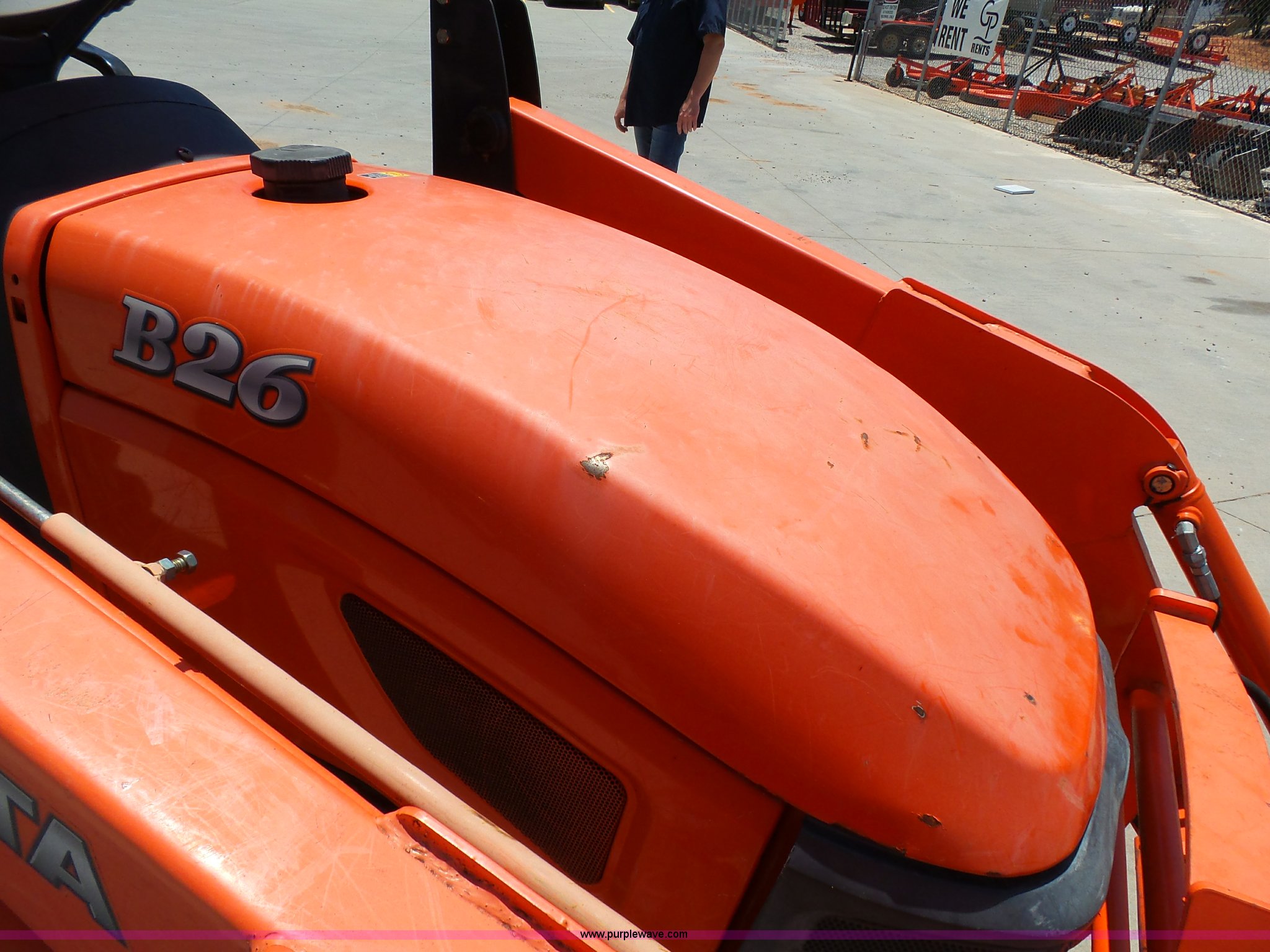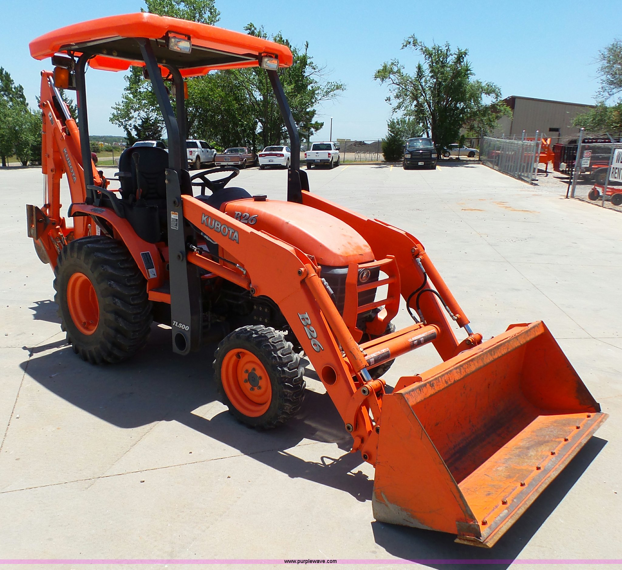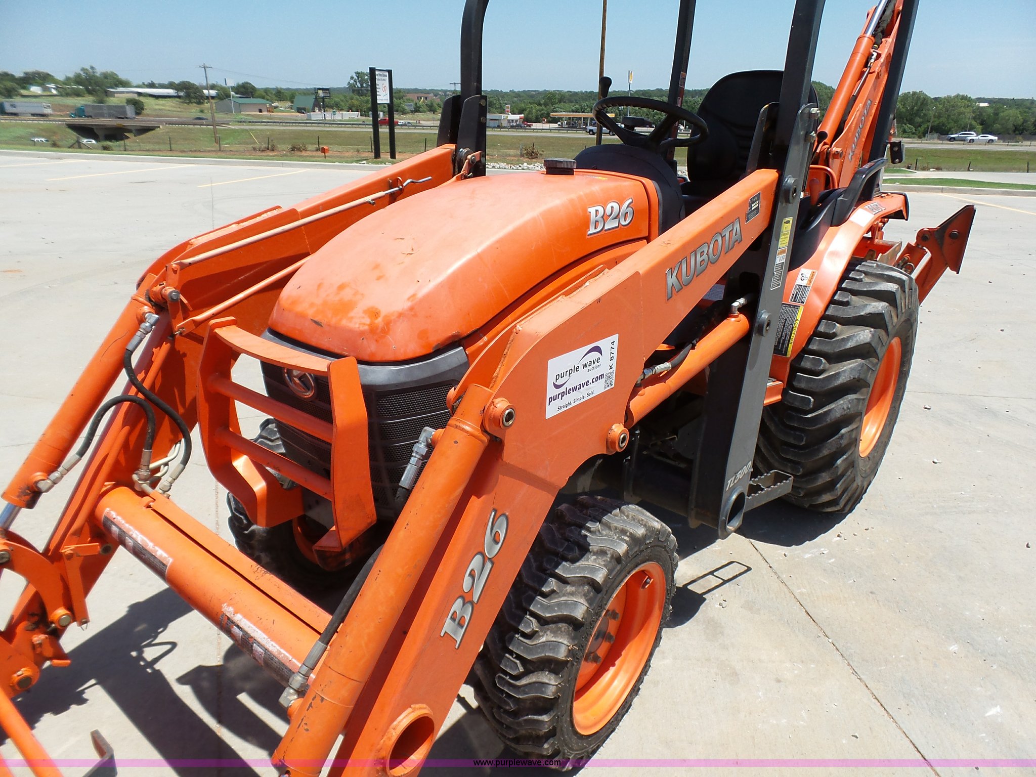 Purple Wave is selling a used Tractor Loader Backhoe in Oklahoma. This item is a 2010 Kubota B26 TLB backhoe with the following: 921 hours on meter, Kubota three cylinder diesel engine, Hydrostatic transmission, 3F-3R gears, Four wheel drive, Wobble stick backhoe controls, Front and rear work lights, Kubota TL500 loader, 59"W loader bucket, Kubota BT8L0 backhoe, 17"W backhoe bucket, Weld-on cutting edge, (4) teeth, Manual quick coupler, 23 x 8.50-14 front tires, 12.4-16 rear tires, Serial 52308