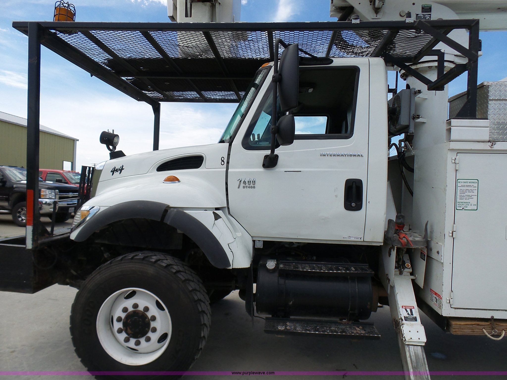 Purple Wave is selling a used Bucket Truck in Missouri. This item is a 2003 International 7400 bucket truck with the following: 105,031 miles on odometer, 9,504 hours on meter, International DT466 7.6L L6 turbo diesel engine, Eaton Fuller Road Ranger 10 speed manual transmission, Four wheel drive, Single axle, AC and heat, AM/FM, Air suspension seat, Brake controller, Backup alarm, Front tow hooks, Beacon light, Spotlight, Remote control, Block heater, PTO, Altec service bed, Shelving, Catwalk, Serial 277745011102, 2002 Altec LVR60 boom, 60' boom length, 350 lbs max lift capacity, Man basket, Platform and ground controls, 65' max lift height, Auxiliary hydraulic at man basket, Boom rotation, Articulating insulated boom, (2) hydraulic outriggers, Serial 1002CV1699, South Co. dump bed, 12 cu. yd. capacity, Hydraulic dump, Air controlled front winch, 25,000 lbs capacity, 3/4" thick cable, Auxiliary oil cooler, Single fuel tank, Pintle hitch, Trailer wiring, Trailer air brakes, Spring suspension, Air brakes, 213" wheelbase, 385/65R22.5 front tires, 12R22.5 rear tires, FAWR 14,500 lbs, Stored inside, Annual inspection valid through August 2016, Two-way radio will be removed prior to auction, Service records available upon request, Unit# 8