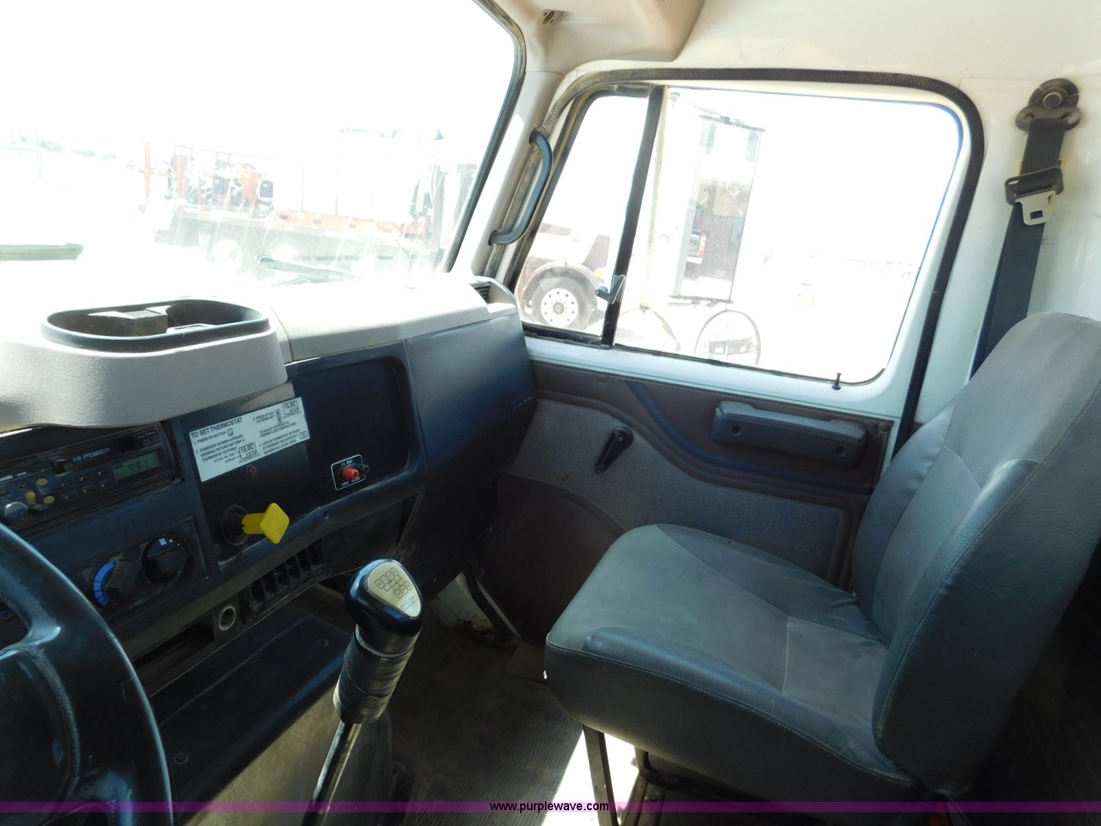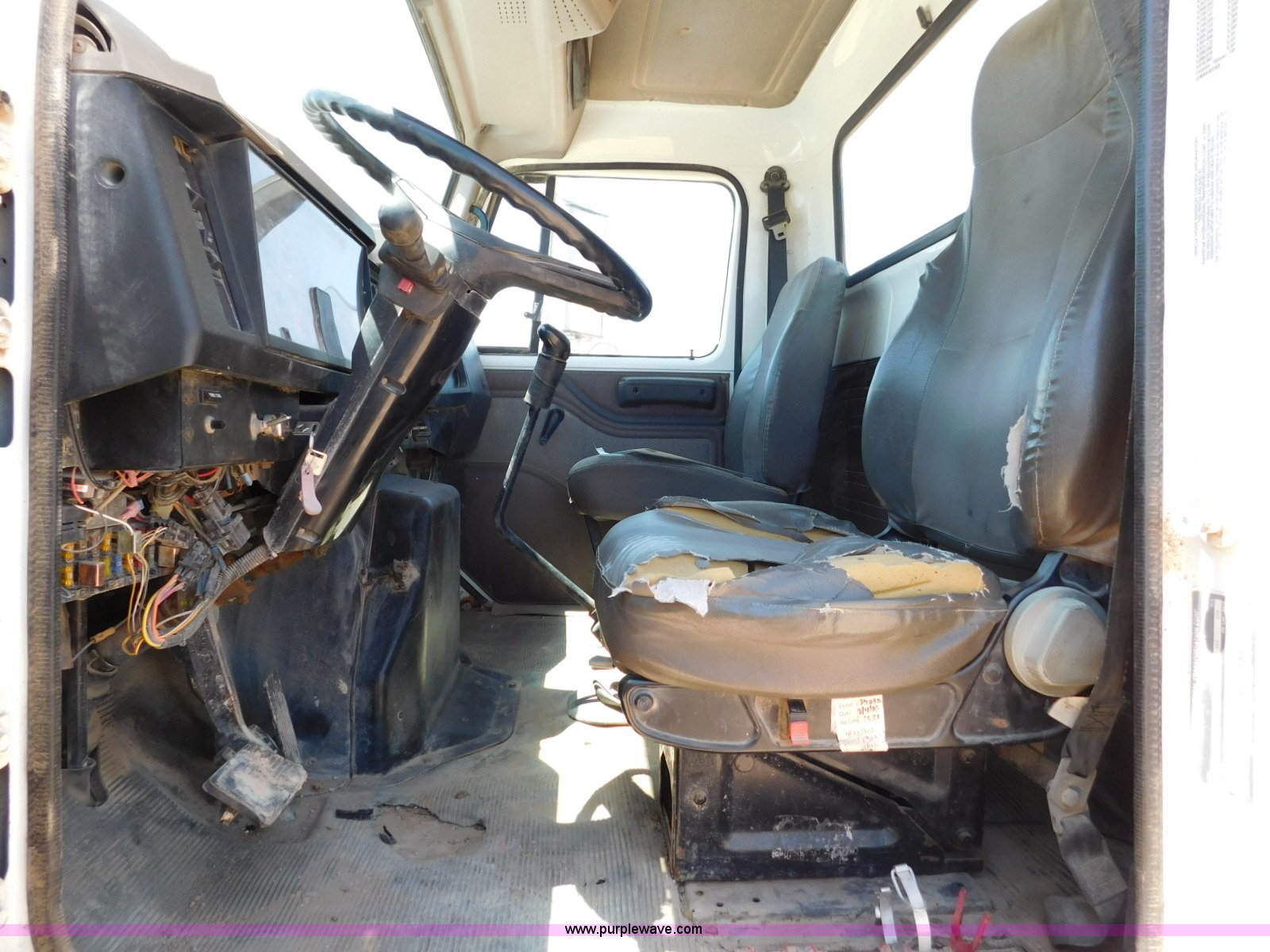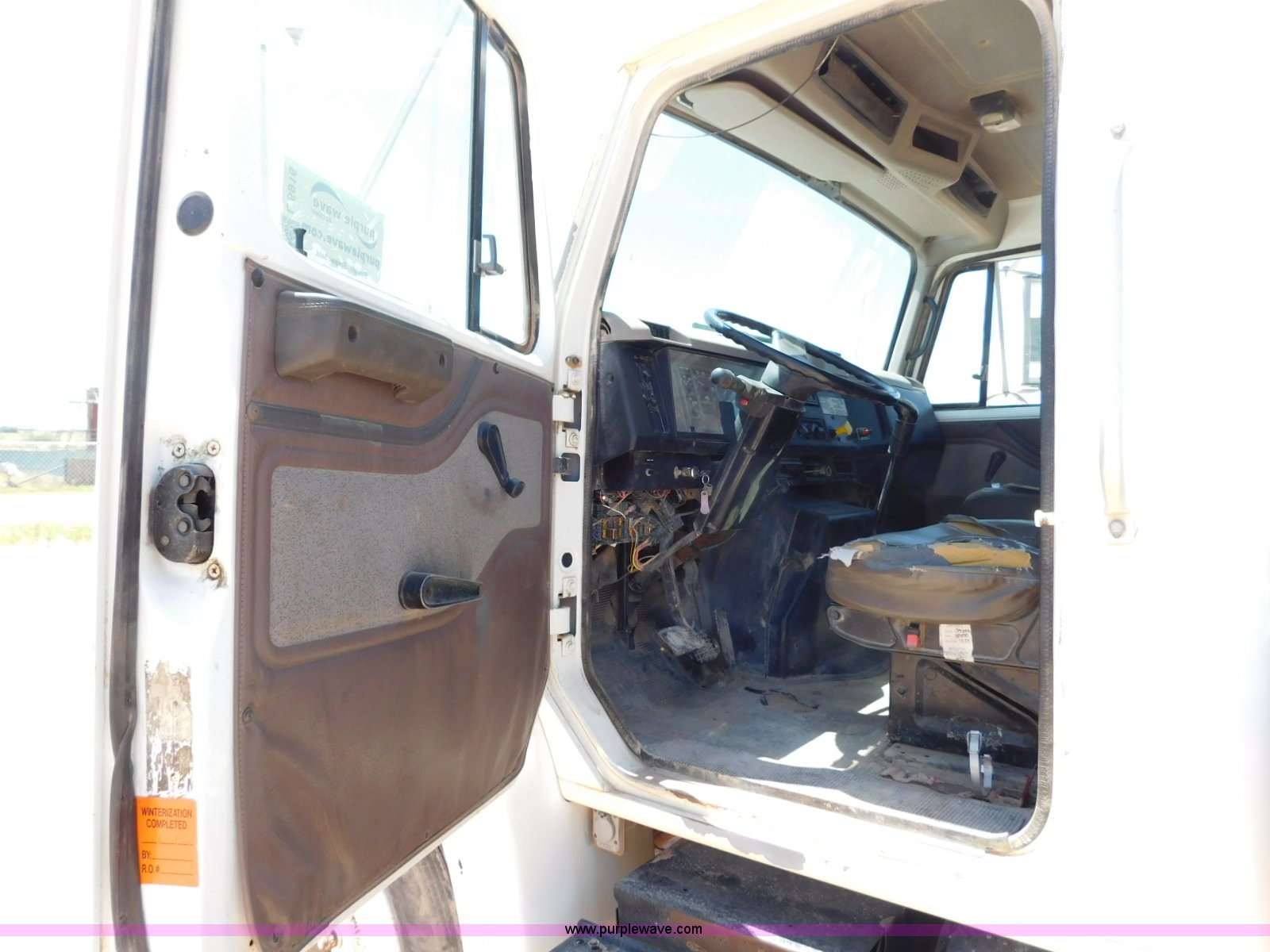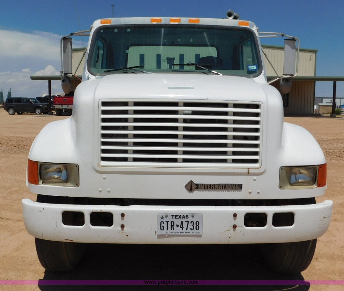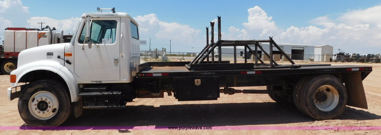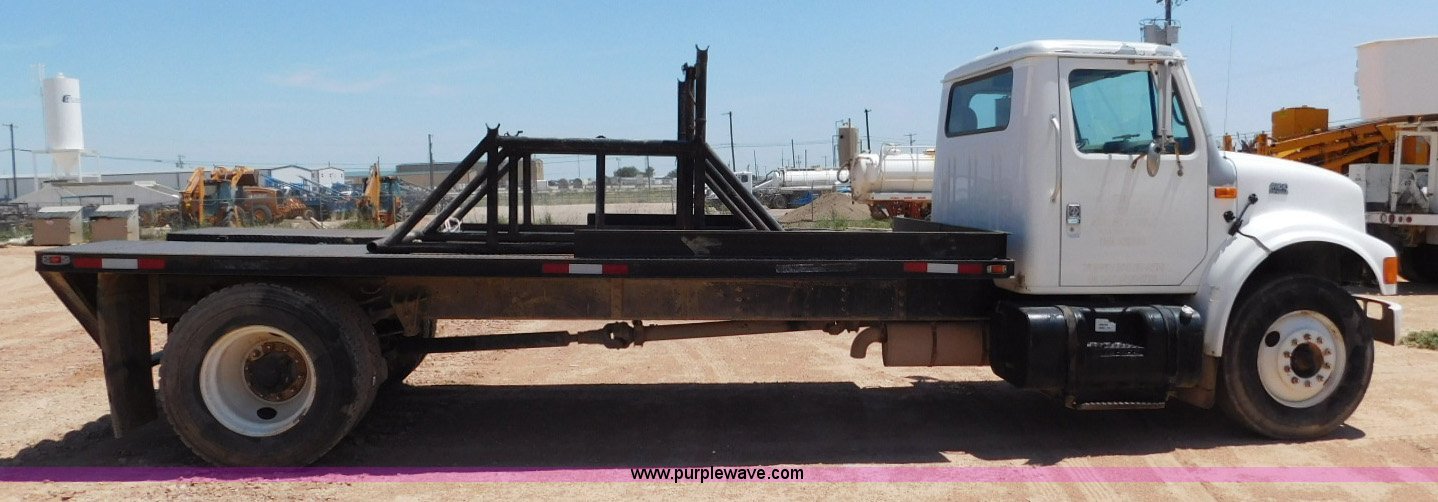 Purple Wave is selling a used Flat Bed Truck in Texas. This item is a 2001 International 4900 flatbed truck with the following: 296,922 miles on odometer, International DT466 7.6L L6 turbo diesel engine, Serial 183334101, Eaton Fuller six speed manual transmission, Single axle, AC and heat, Air suspension seat, Ether start, 11'L x 8'W flatbed, Toolbox, Single exhaust stack, Single fuel tank, 237" wheelbase, Spring suspension, Air brakes, 11R22.5 tires, GVWR 32,900 lbs, Windshield chipped, Unit# 9707