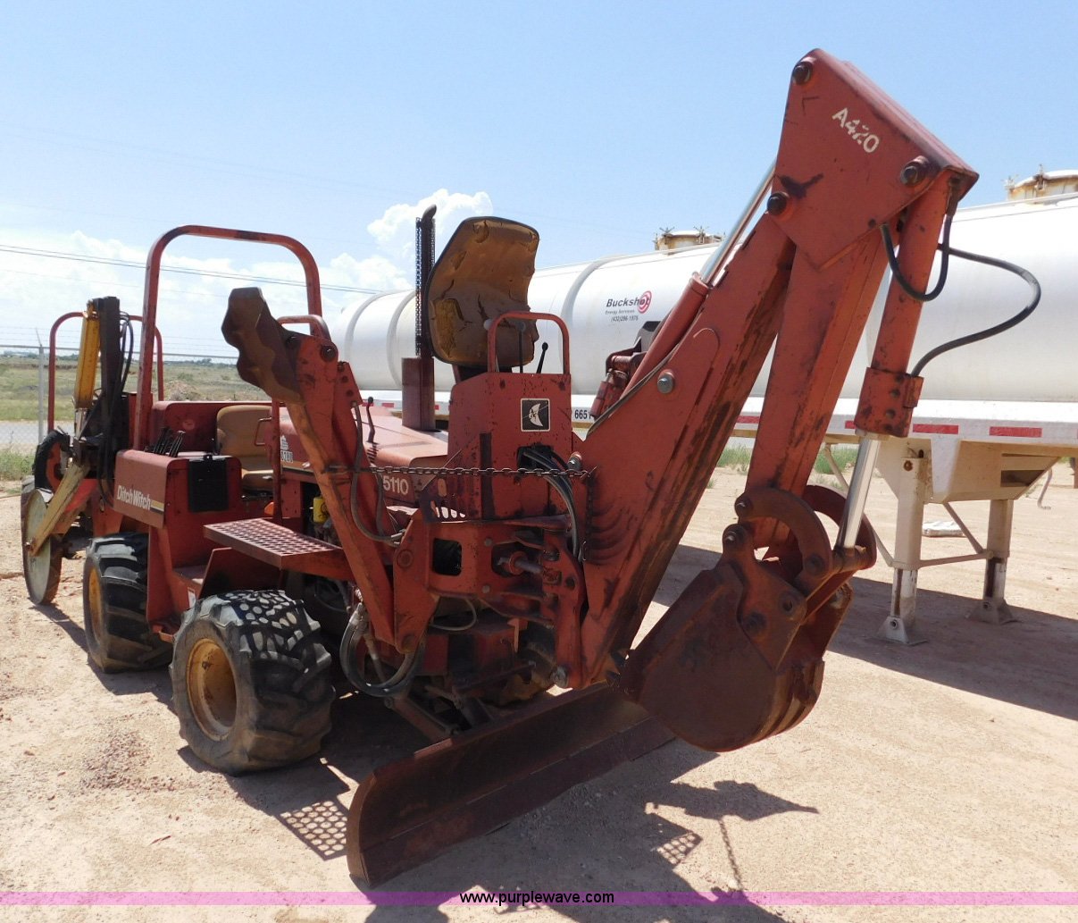 1995 Ditch Witch 5110 trencher. 708 hours on meter, Deutz 1FN four cylinder diesel engine Serial 8420870, Hydrostatic transmission, OROPS, 6'W two-way back fill blade, Trencher model M-710 Serial 2M0321, 6' maximum digging depth, 6" cutting width, Backhoe model A420 Serial 110310, 11"W bucket (4) teeth, Hydraulic outriggers, 31 x 15.5-15 tires, Serial 5M0280. Brush Country Electric. 3008 Elkins. Midland, TX 79705
