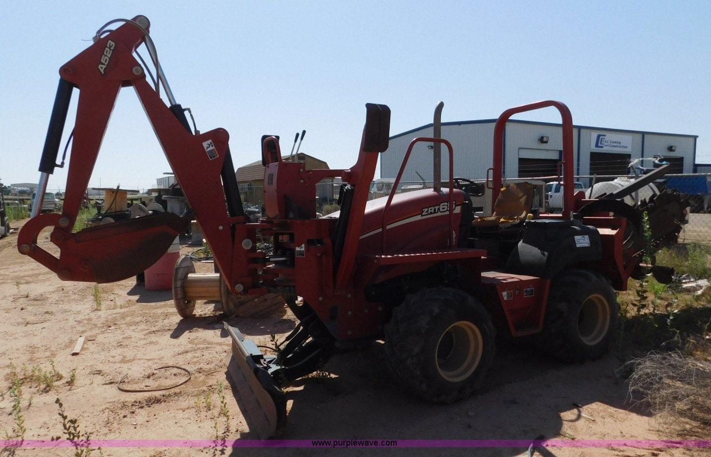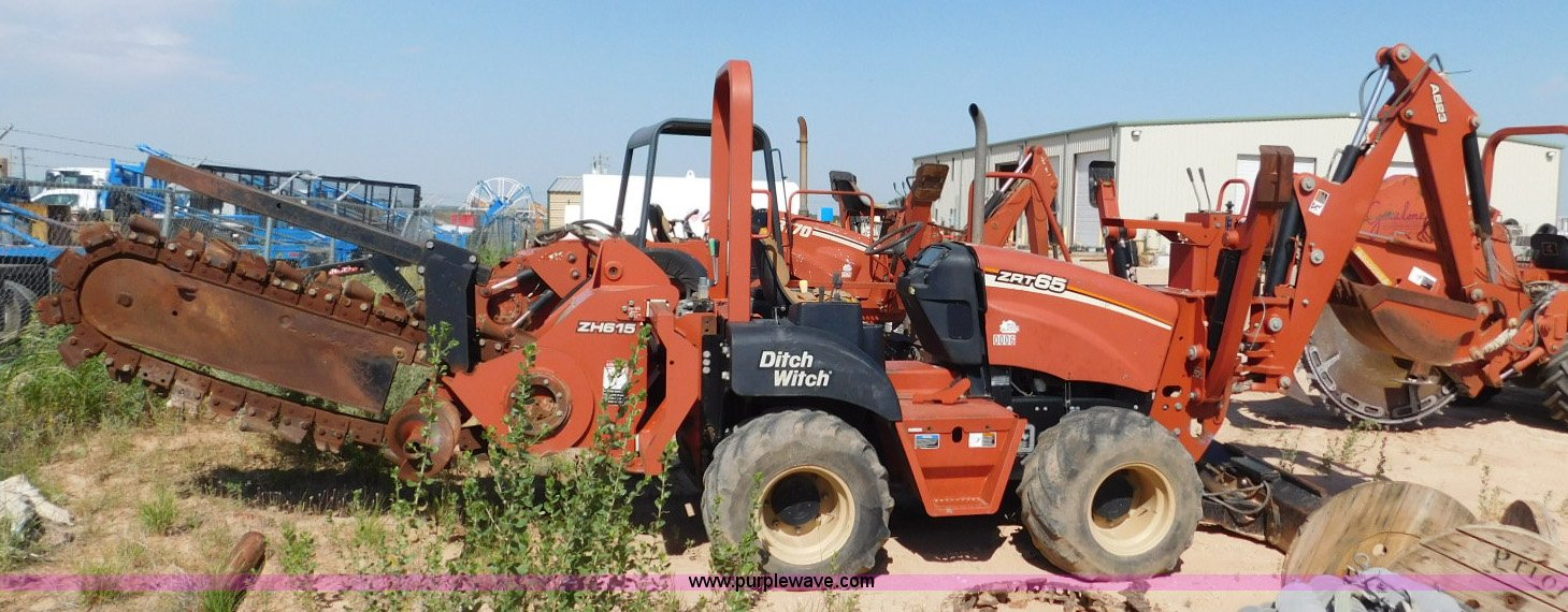 Purple Wave is selling a used Trencher or Rock Saw in Texas. This item is a 2007 Ditch Witch ZRT65 trencher with the following: 249 hours on meter, Four cylinder diesel engine, Hydrostatic transmission, 6'W two-way back fill blade, Trencher model 7H415, 6' maximum digging depth, 6"W cutting capacity, Backhoe, Model A523, 4' stick length, Stick controls, 18"W bucket, (5) teeth, Hydraulic outriggers, 35.19-16.1 tires, Serial CMWZRT65K70000006