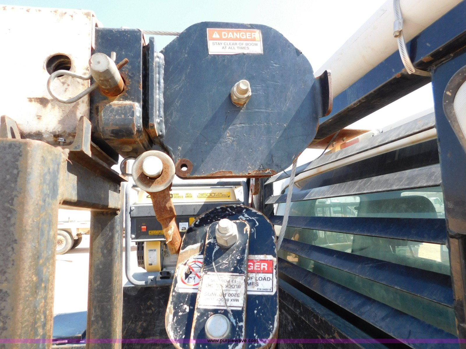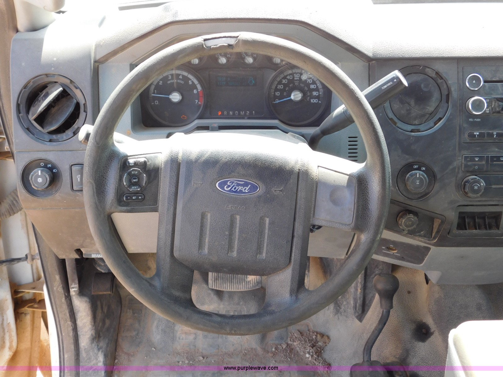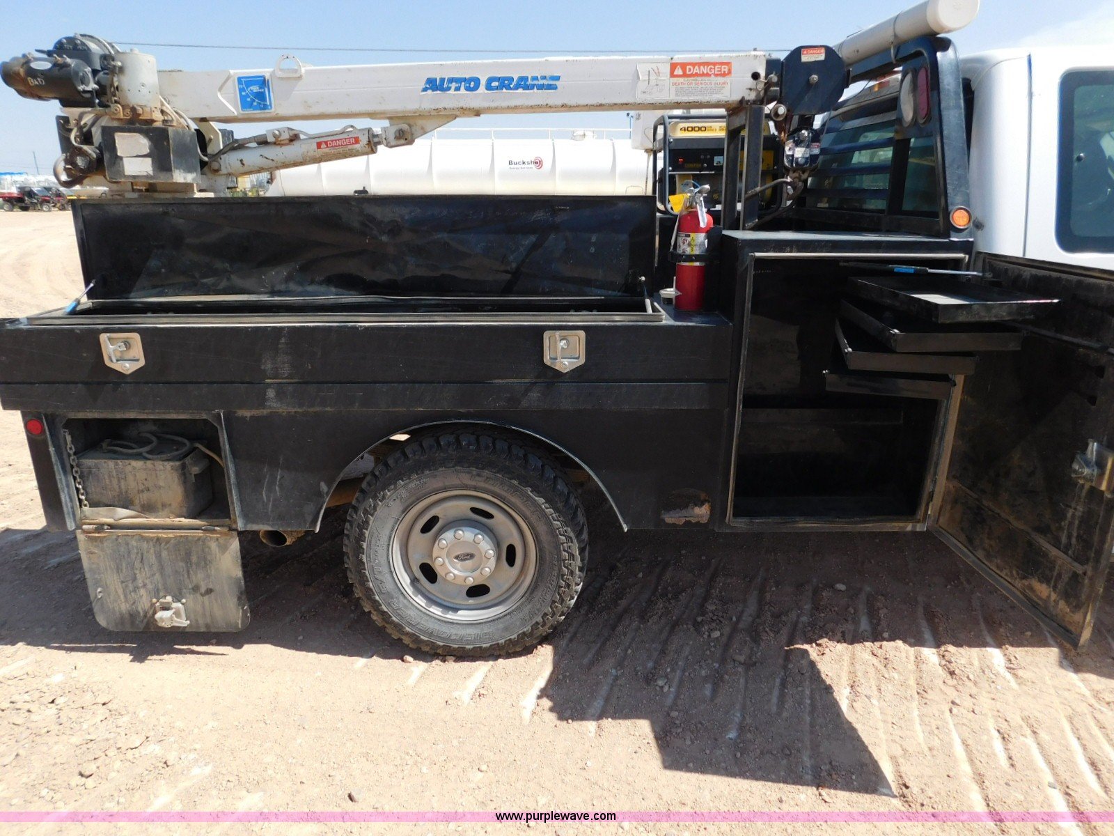 Purple Wave is selling a used Service Truck in Texas. This item is a 2013 Ford F350 Super Duty SuperCab service truck with crane with the following: 104,260 miles on odometer, 6.2L V8 OHV 16V gas engine, Automatic transmission, Four wheel drive, AC, AM/FM/CD, Power windows and locks, Service bed, 116"L, Shelving, Slide-out drawers, Champion 4000 generator, Gas engine, 240V outlet, 120V outlet, Auto Crane crane, 3,200 lbs max lift capacity, Single fuel tank, Receiver hitch, Spring suspension, Hydraulic brakes, 265/70R17 tires, Unit# 2348