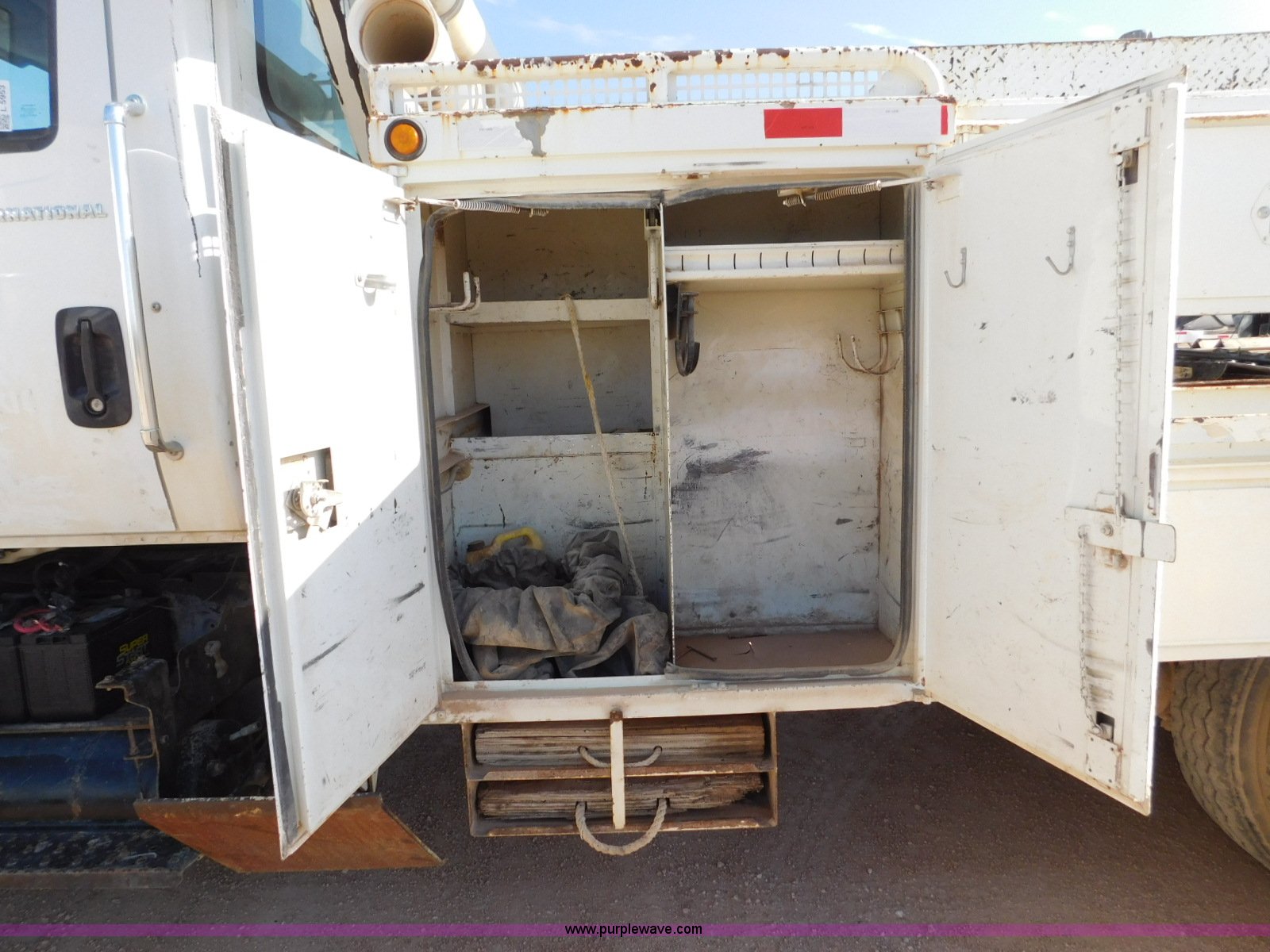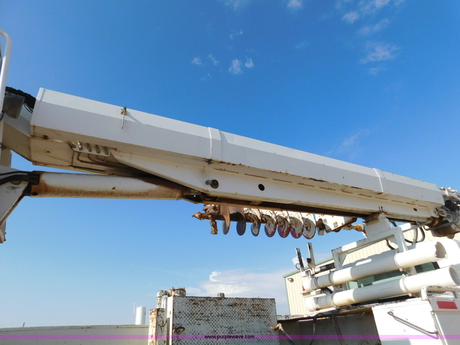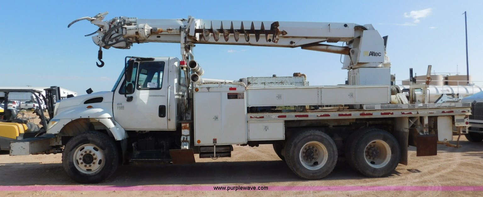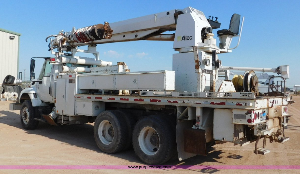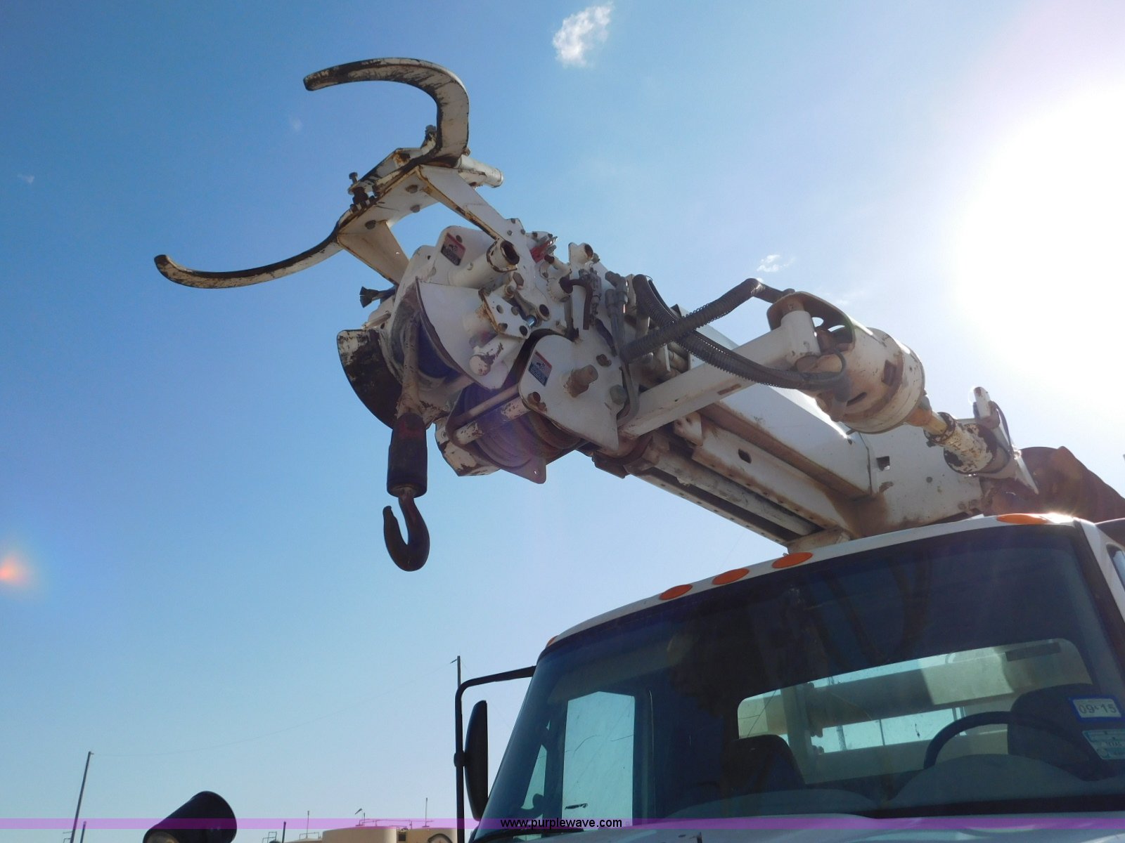 Purple Wave is selling a used Digger Derrick Truck in Texas. This item is a 2004 International 7400 digger derrick truck with the following: 20,006 miles on odometer, 1,101 hours on meter, International DT530/CH275 8.7L L6 turbo diesel engine, Eaton Fuller seven speed manual transmission, Tandem axle, AC and heat, Air suspension seat, Front tow hooks, Beacon light, PTO, Service bed, Shelving, Slide-out drawers, Pintle hitch, Altec 12205CBR digger derrick, 2,660 lbs max lift capacity, Man basket, 40' max lift height, Platform boom controls, Boom rotation, Pole guide, Telescopic boom, 18" diameter auger, (4) outriggers, Serial 1203-Y0874, Front bumper winch, Single fuel tank, Air suspension, Air brakes, 206" wheelbase, 315/80R22.5 front tires, 11R22.5 rear tires, Cracked windshield, Unit# 4846