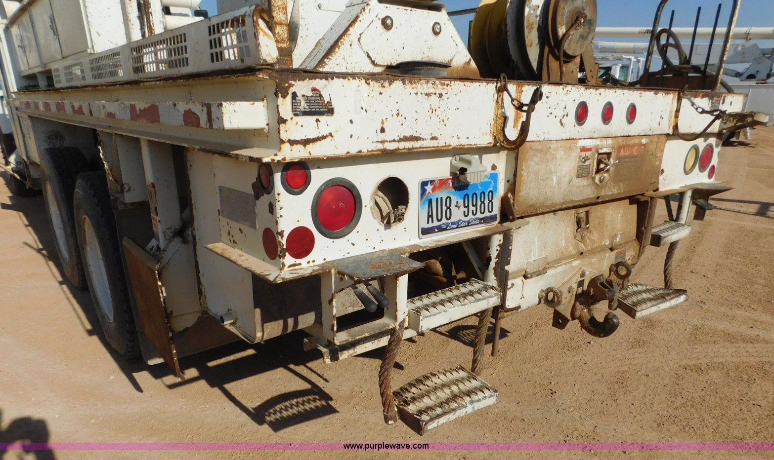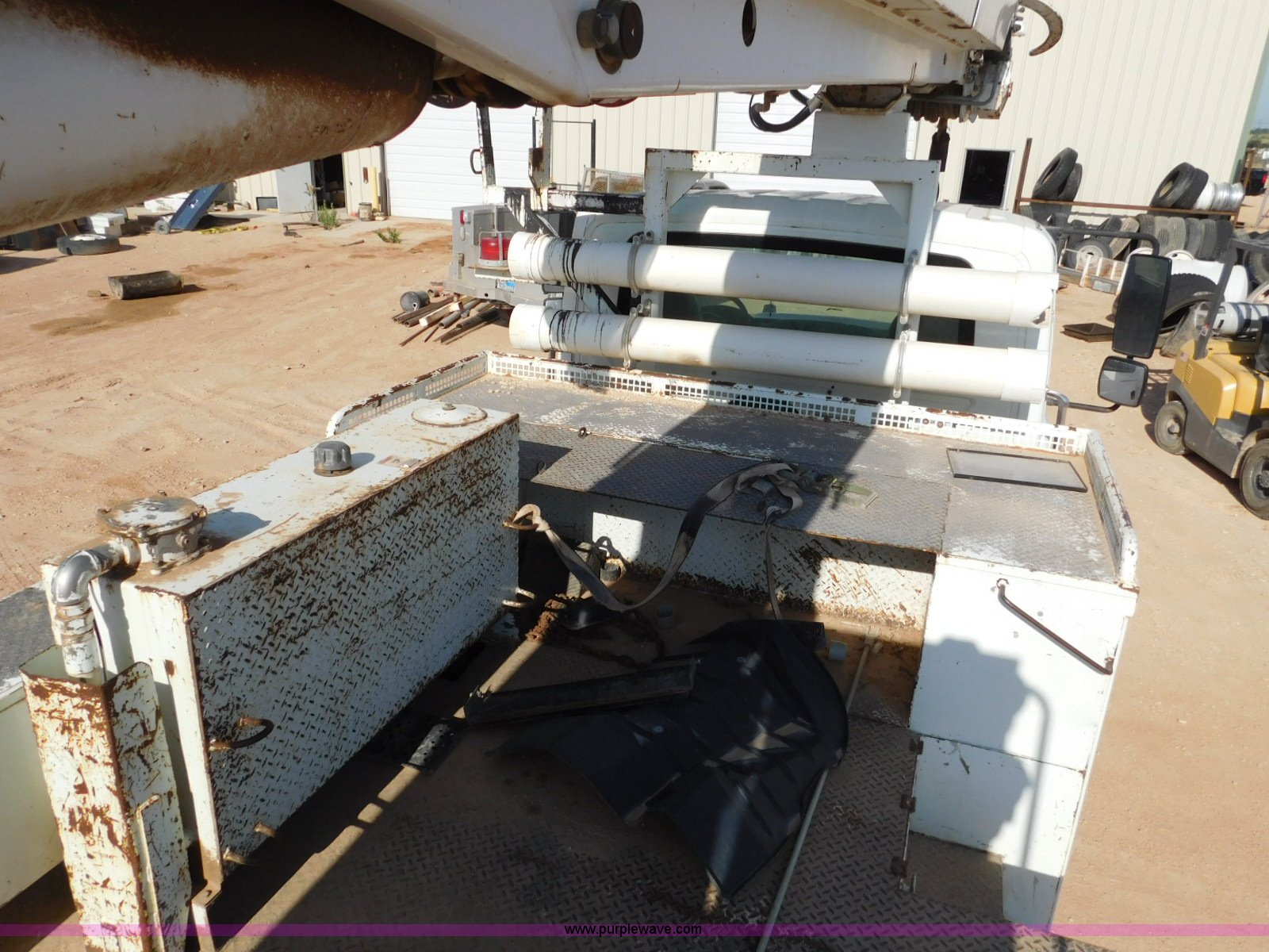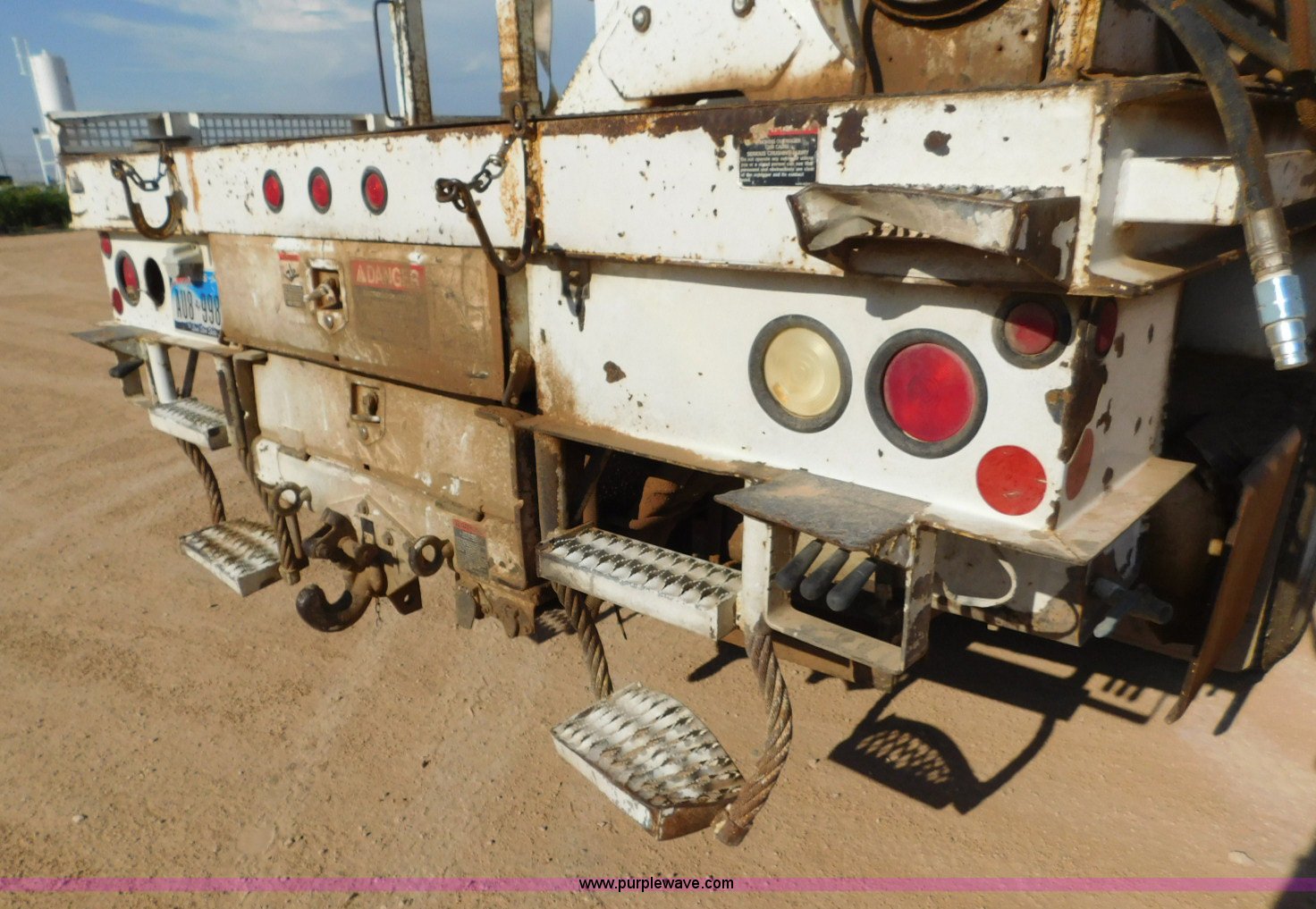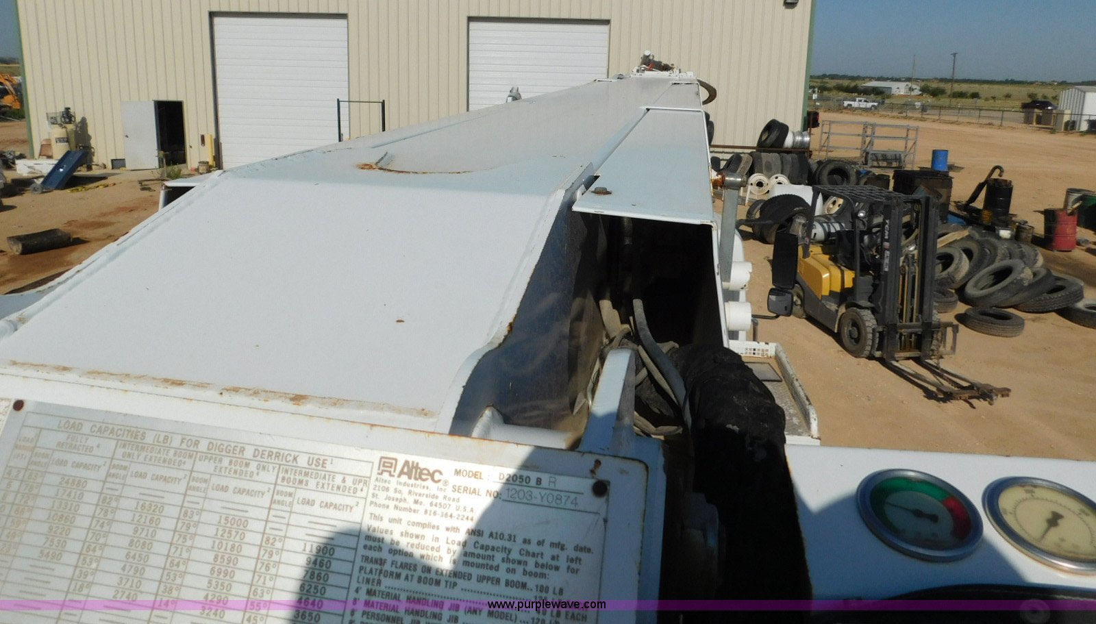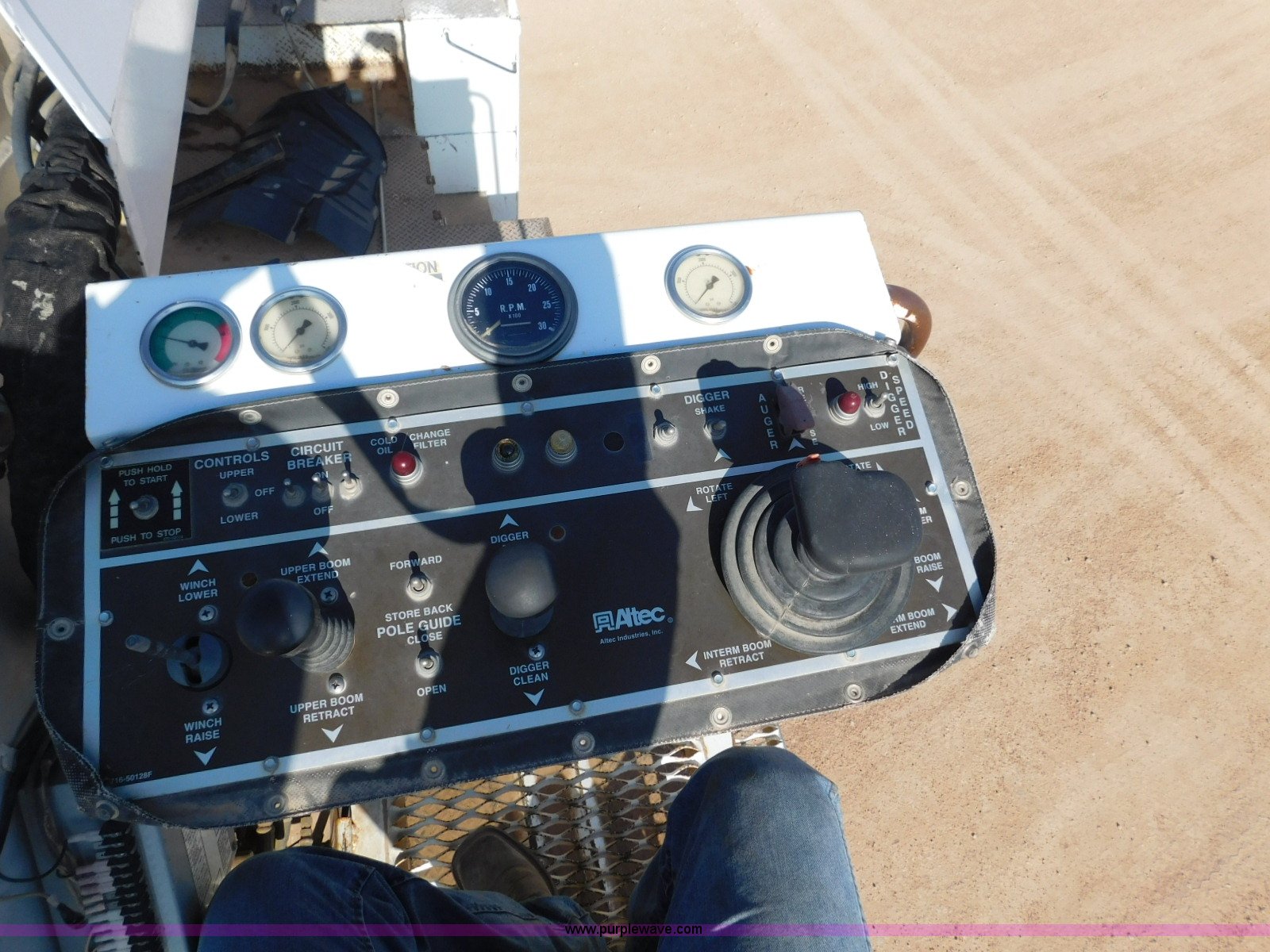Purple Wave is selling a used Digger Derrick Truck in Texas. This item is a 2004 International 7400 digger derrick truck with the following: 20,006 miles on odometer, 1,101 hours on meter, International DT530/CH275 8.7L L6 turbo diesel engine, Eaton Fuller seven speed manual transmission, Tandem axle, AC and heat, Air suspension seat, Front tow hooks, Beacon light, PTO, Service bed, Shelving, Slide-out drawers, Pintle hitch, Altec 12205CBR digger derrick, 2,660 lbs max lift capacity, Man basket, 40' max lift height, Platform boom controls, Boom rotation, Pole guide, Telescopic boom, 18" diameter auger, (4) outriggers, Serial 1203-Y0874, Front bumper winch, Single fuel tank, Air suspension, Air brakes, 206" wheelbase, 315/80R22.5 front tires, 11R22.5 rear tires, Cracked windshield, Unit# 4846