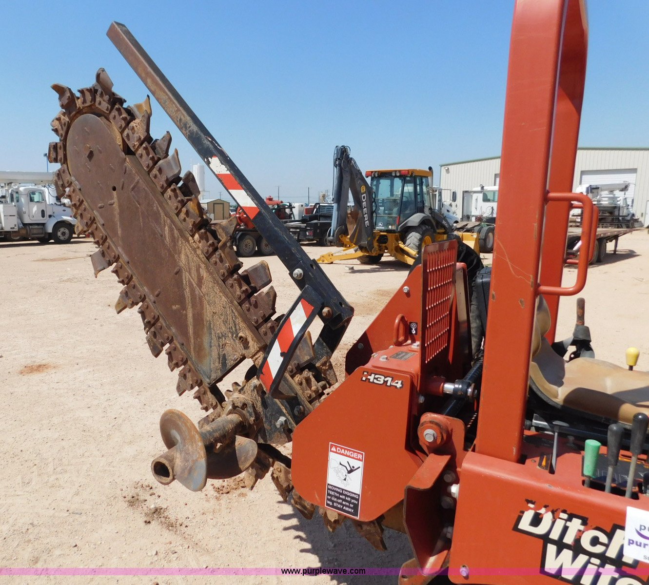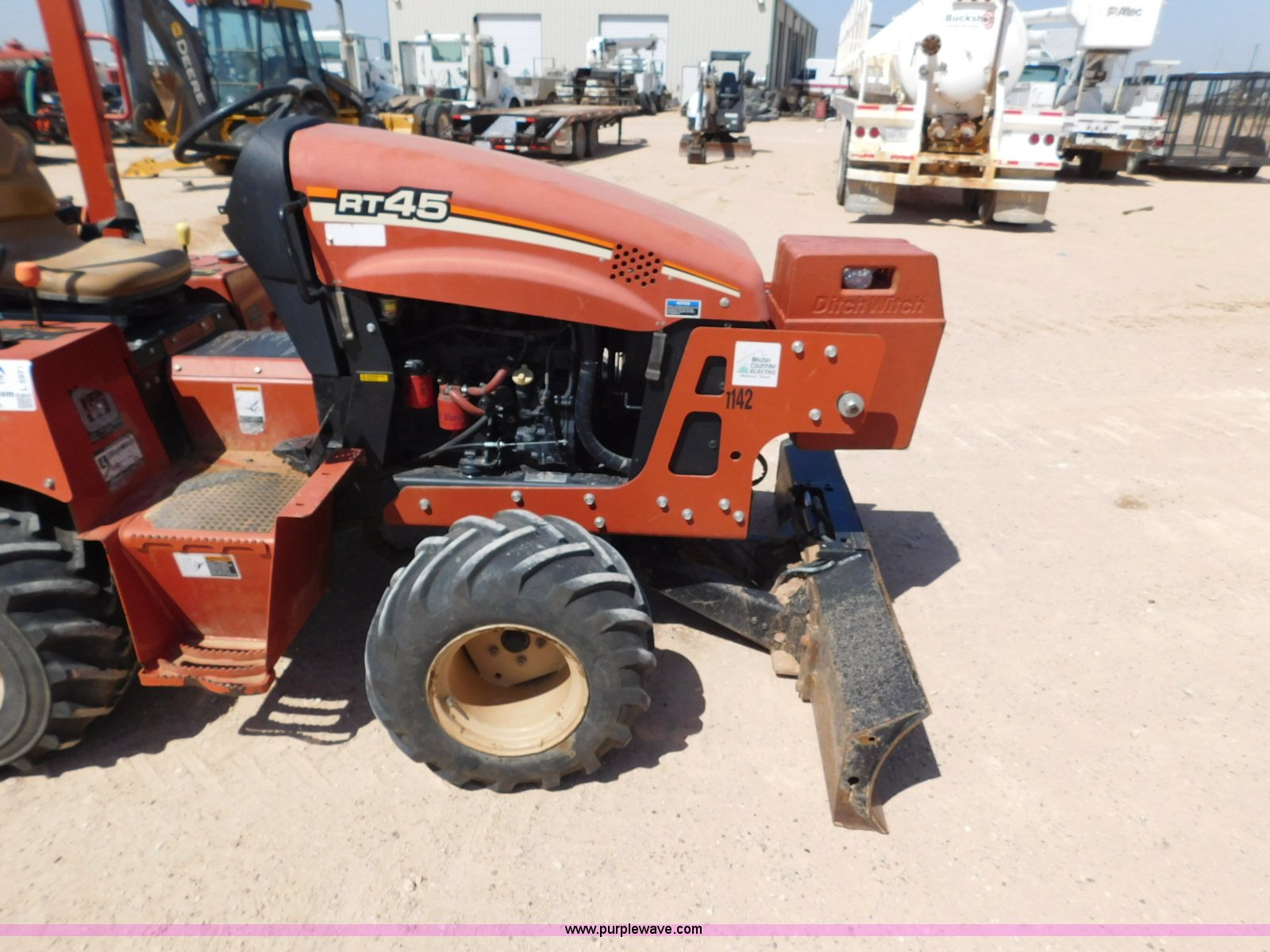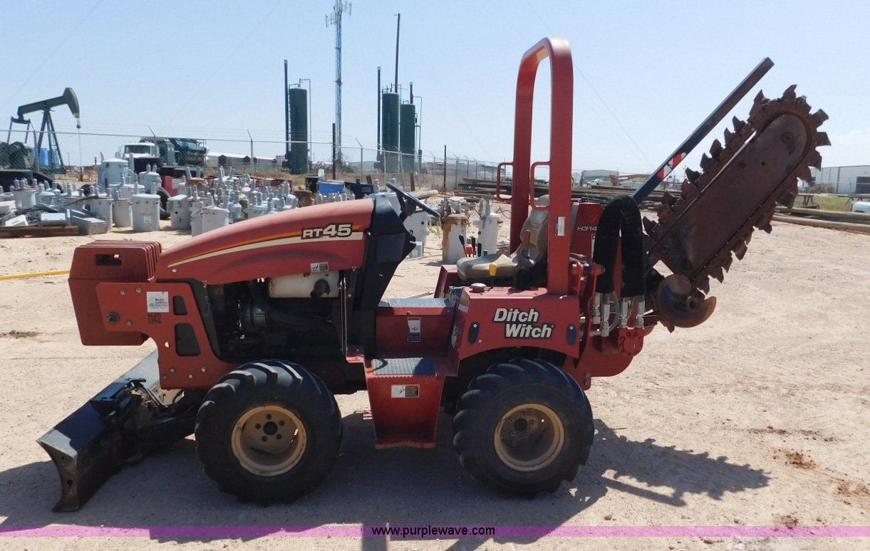 Purple Wave is selling a used Trencher or Rock Saw in Texas. This item is a 2012 Ditch Witch RT45 trencher with the following: 884 hours on meter, Deutz three cylinder diesel engine, Model D-2011-L-03, Serial 1164954, Hydrostatic transmission, OROPS, Front weights, 6'W two way backfill blade, Trencher model H314, Serial CMW11314XCC002365, Hydraulic side shift, 5" cutting width, 4' maximum digging depth, 26xx12-12 tires, Serial CMWRT45XTC0001142