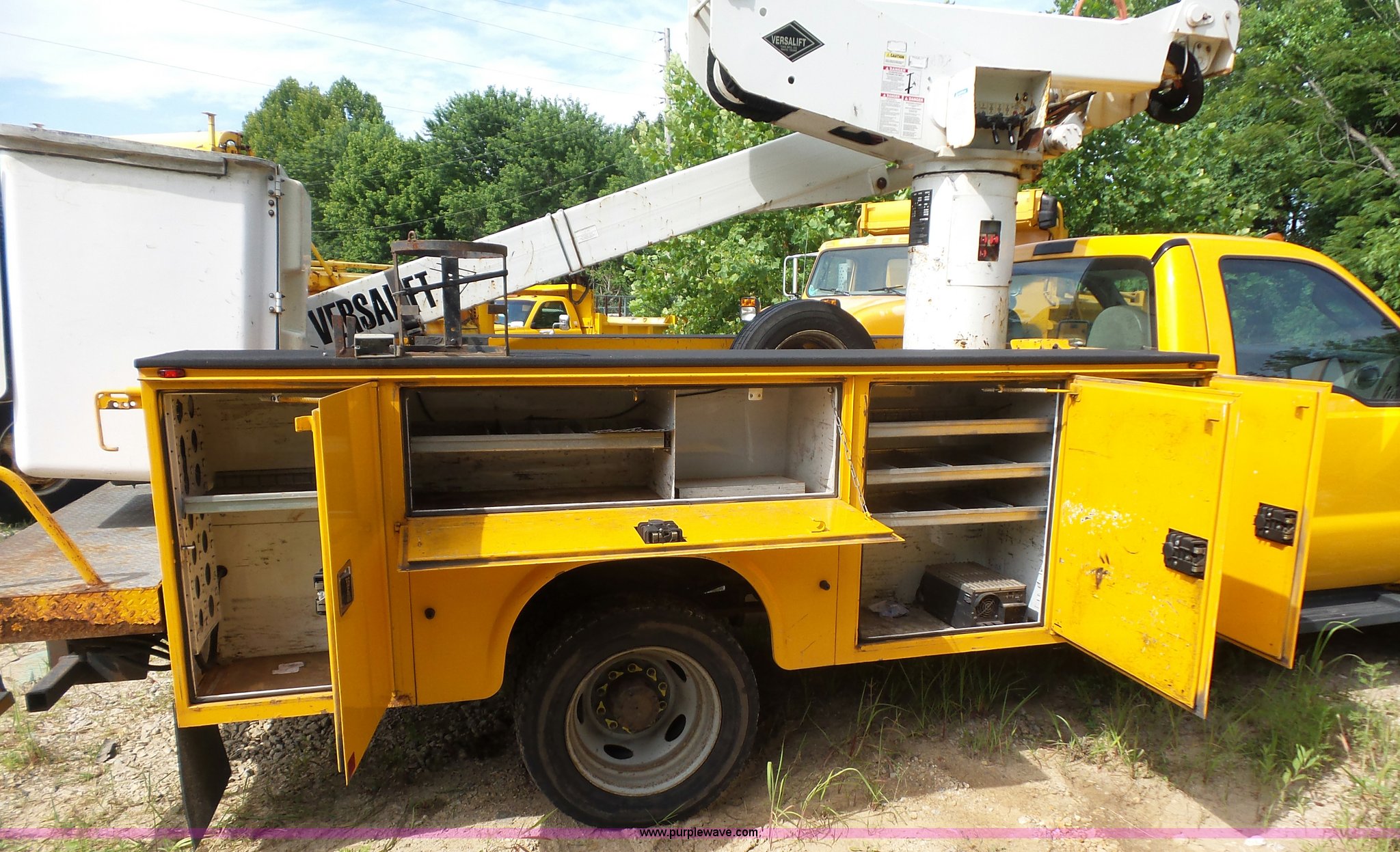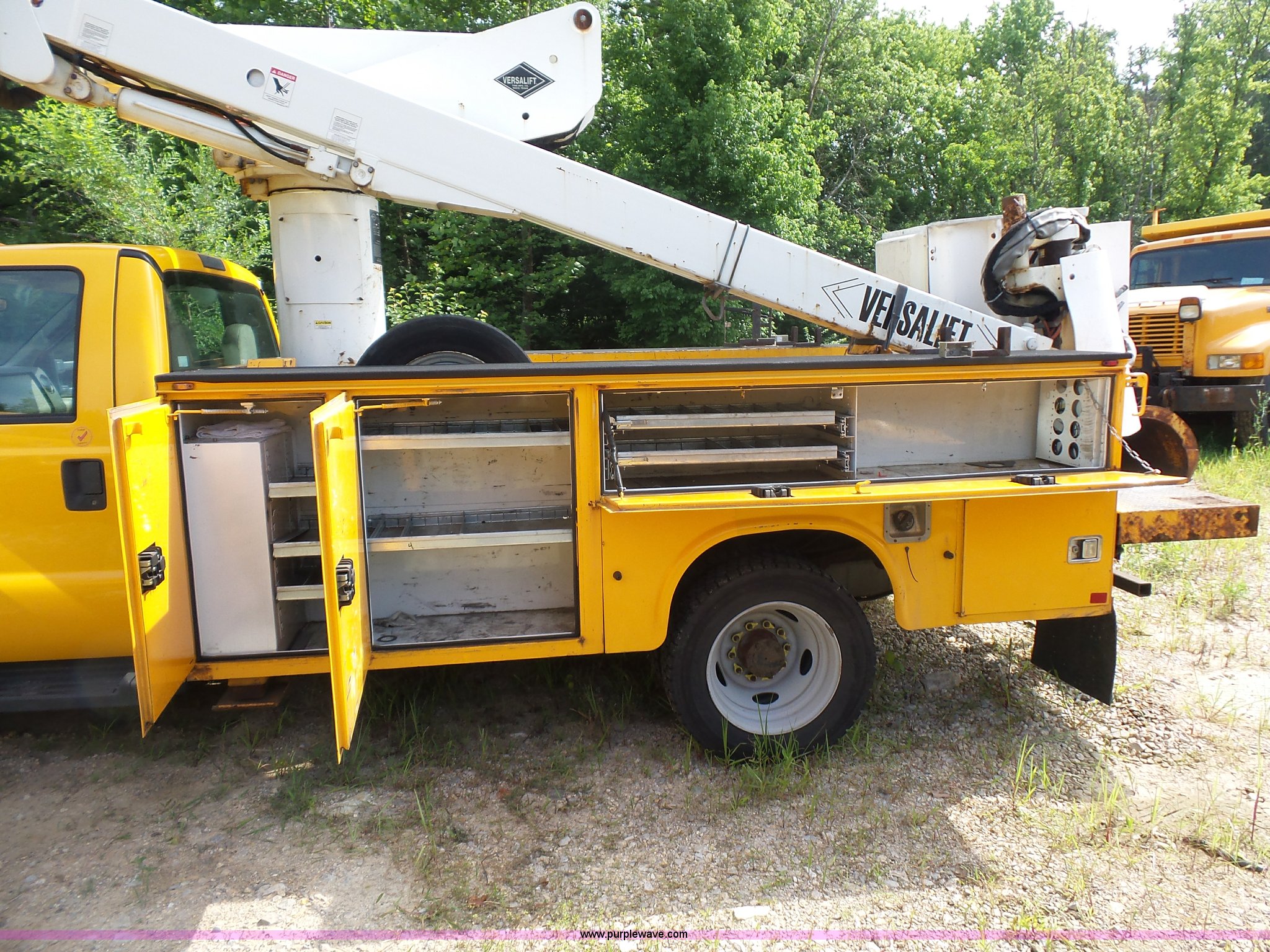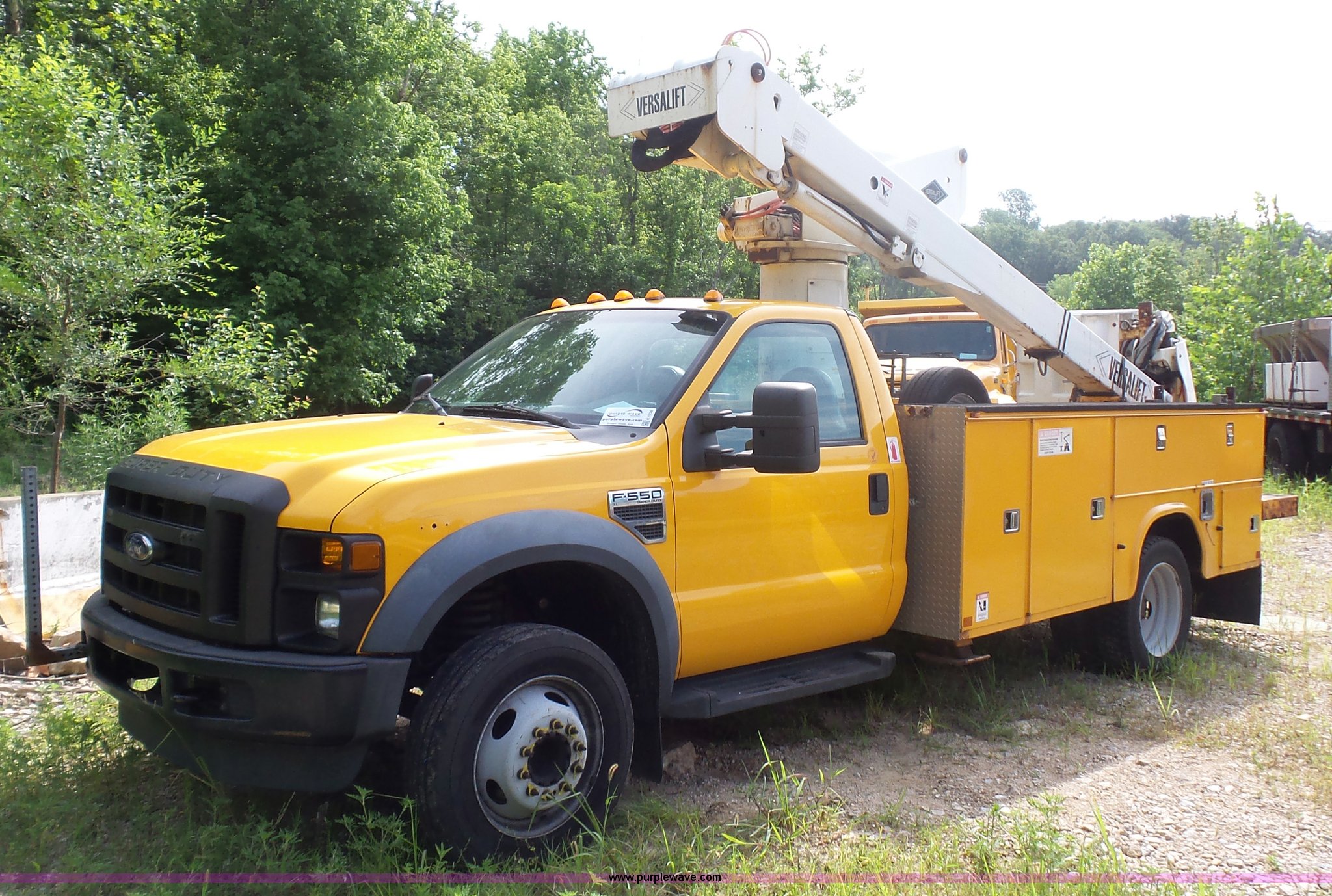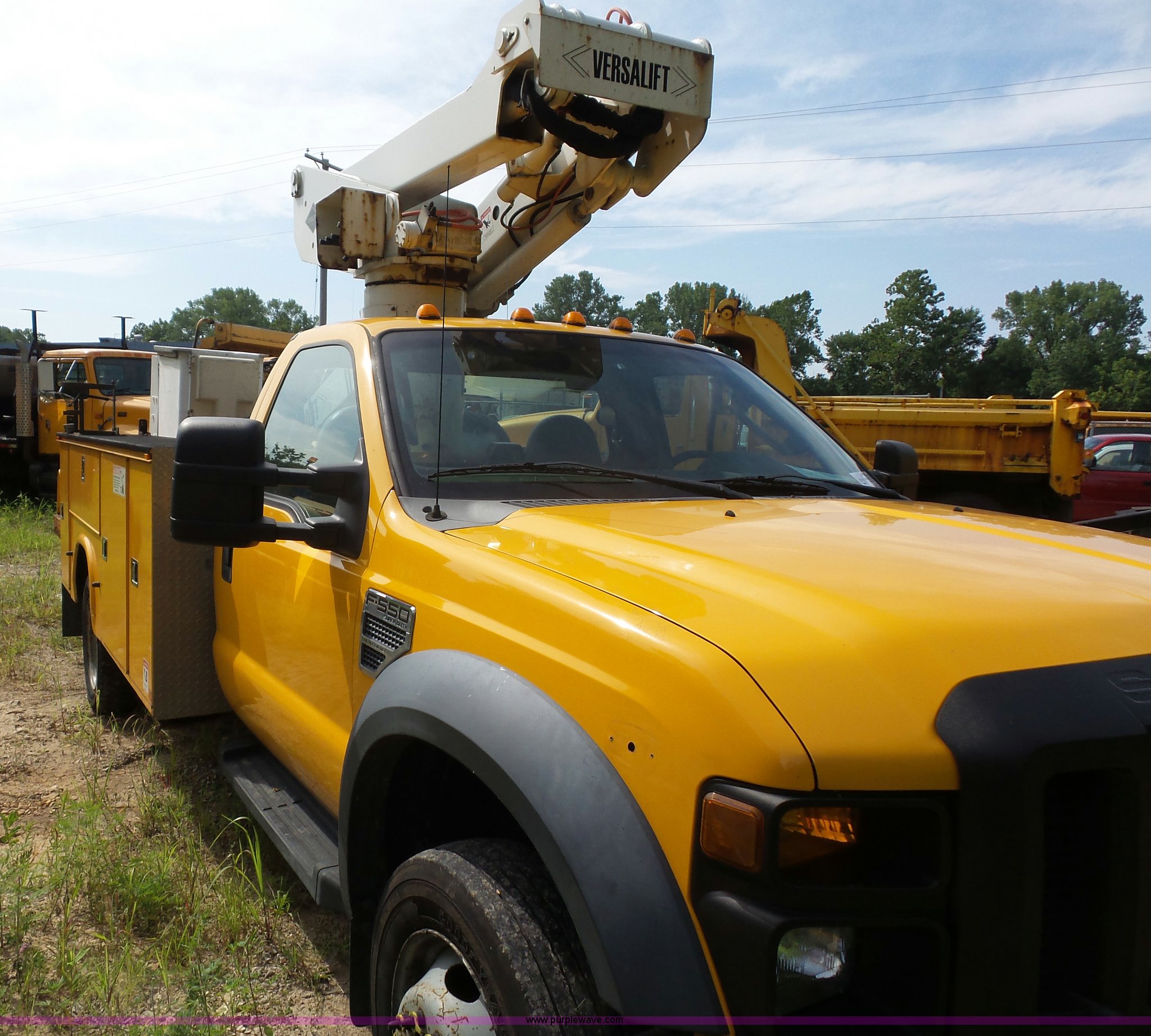 Purple Wave is selling a used Bucket Truck in Missouri. This item is a 2008 Ford F550 Super Duty bucket truck with the following: 238,423 miles on odometer, 6.8L V10 SOHC 30V gas engine, Automatic transmission, AC and heat, AM/FM, Versalift VST-240NGZ boom, Ground and platform controls, Serial GF080004, (2) outriggers, Power inverter, Receiver hitch, Pintle hitch, Spring suspension, Hydraulic brakes, 225/70R19.5 front tires, MODOT ID G9386