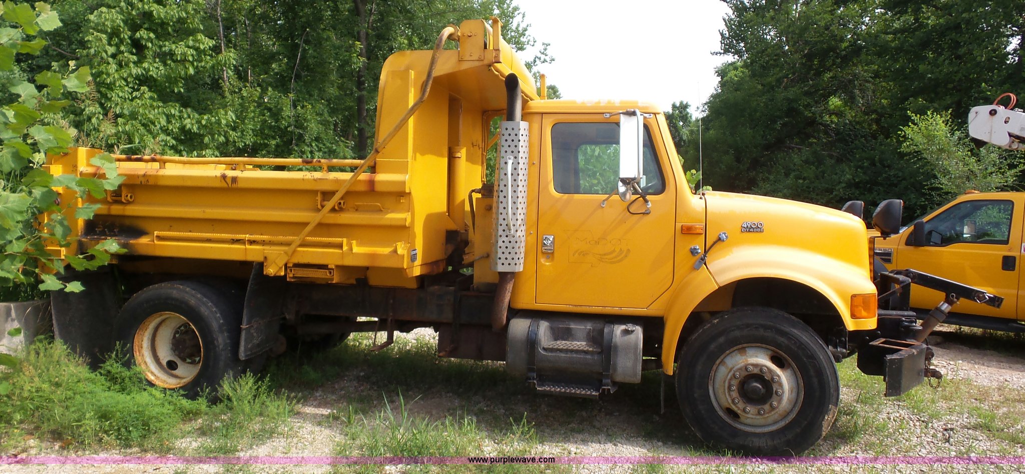 Purple Wave is selling a used Construction Dump Truck in Missouri. This item is a 2000 International 4900 dump truck with the following: 184,130 miles on odometer, 11,957 hours on meter, International DT466 7.6L L6 turbo diesel engine, Seven speed manual transmission, Single axle, Heat, Cruise, AM/FM, Heated mirrors, Air suspension seat, Front mounted PTO, Steel dump bed, 10'L x 8'W, 24" side height, Single ram hoist, Rollover tarp, 170" wheelbase, Spring suspension, Air brakes, 11R22.5 tires, Battery dead, Unknown operating condition, MODOT ID 6219
