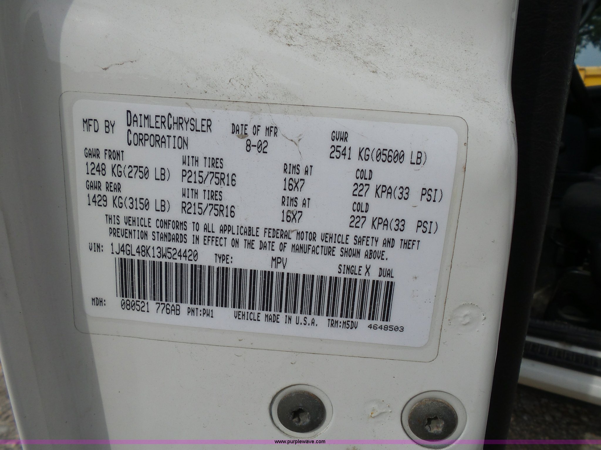 2003 Jeep Liberty SUV. 148,807 miles on odometer, 3.7L V6 SOHC 12V gas engine, Automatic transmission, Four wheel drive, AC and heat, AM/FM, Manual windows and locks, Cloth interior, Receiver hitch, 215/75R16 tires, MODOT ID B5427. Missouri title. 1J4GL48K13W524420. Missouri Department of Transportation (MODOT). 2309 Barret Station Road. Ballwin, MO 63021