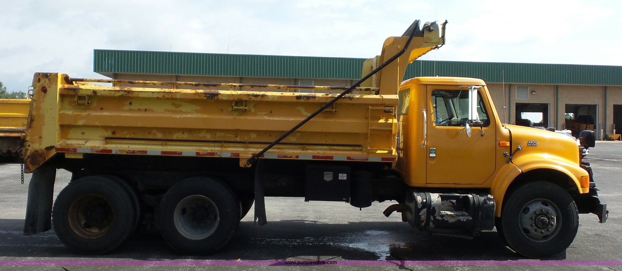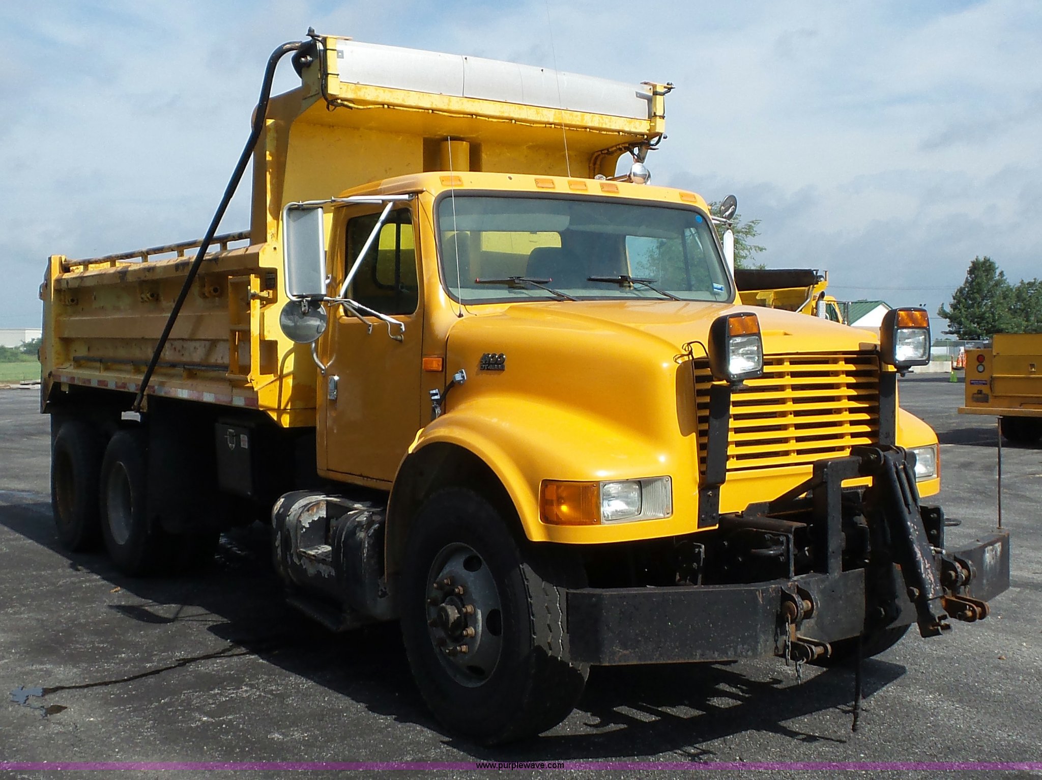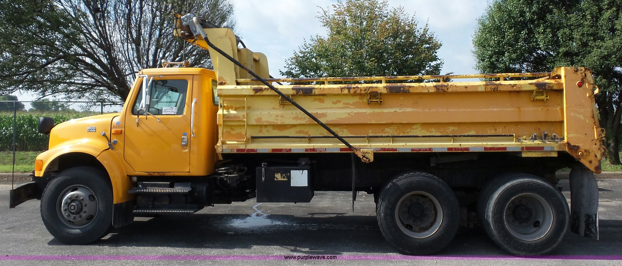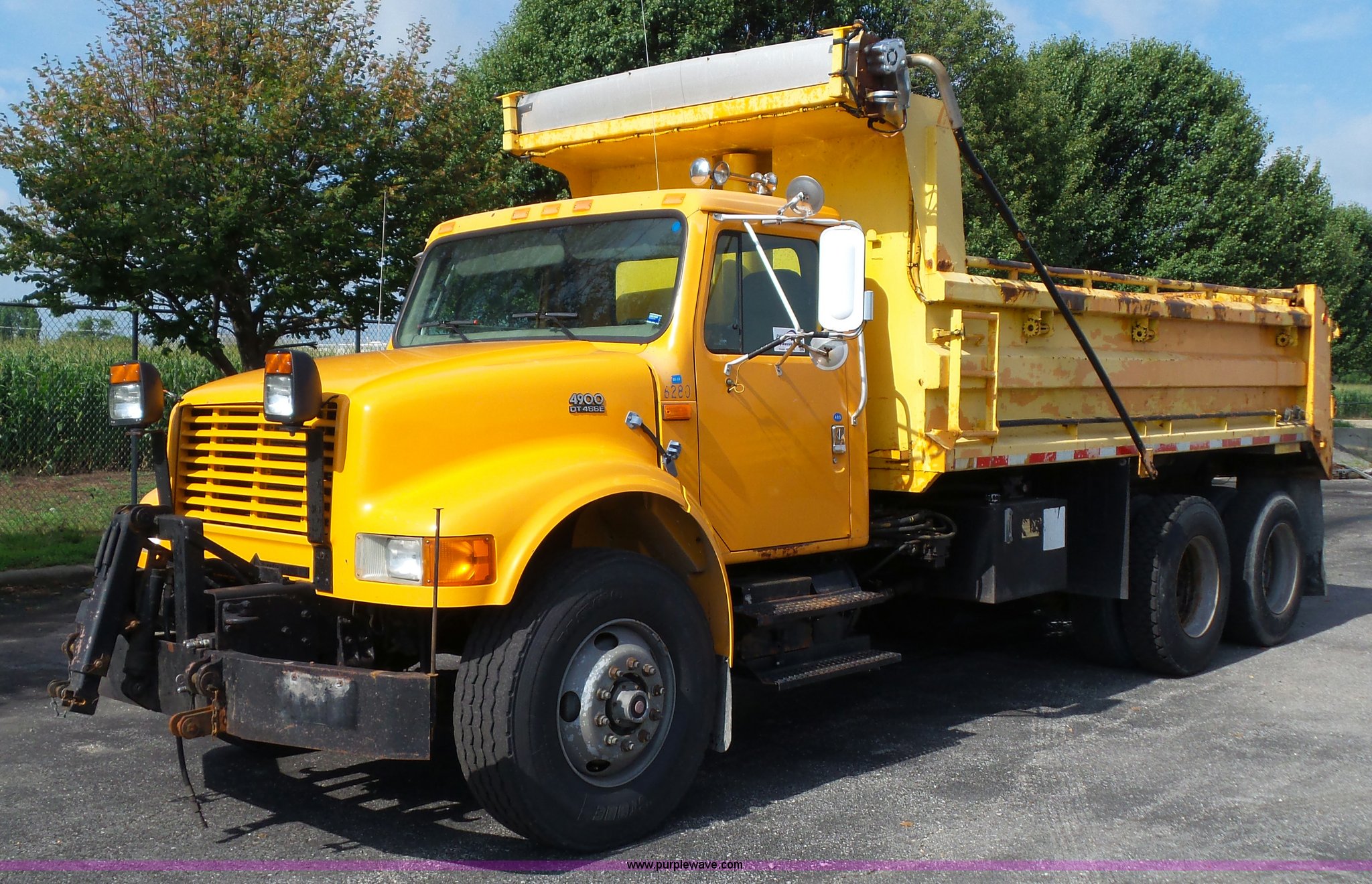 Purple Wave is selling a used Construction Dump Truck in Missouri. This item is a 2000 International F4900 dump truck with the following: 195,745 miles on odometer, 9,733 hours on meter, International DT530 8.7L L6 turbo diesel engine, Eaton Fuller eight speed manual transmission, Inter-axle differential lock, AC and heat, AM/FM, Front mount PTO, Steel dump bed, 16'L x 87"W, 36" side height, Single ram hoist, Air operated end gate, Rollover tarp, Toolboxes, Pintle hitch, 206" wheelbase, Walking beam suspension, Air brakes, 315/80R22.5 front tires, 11R22.5 rear tires, MODOT ID 6280