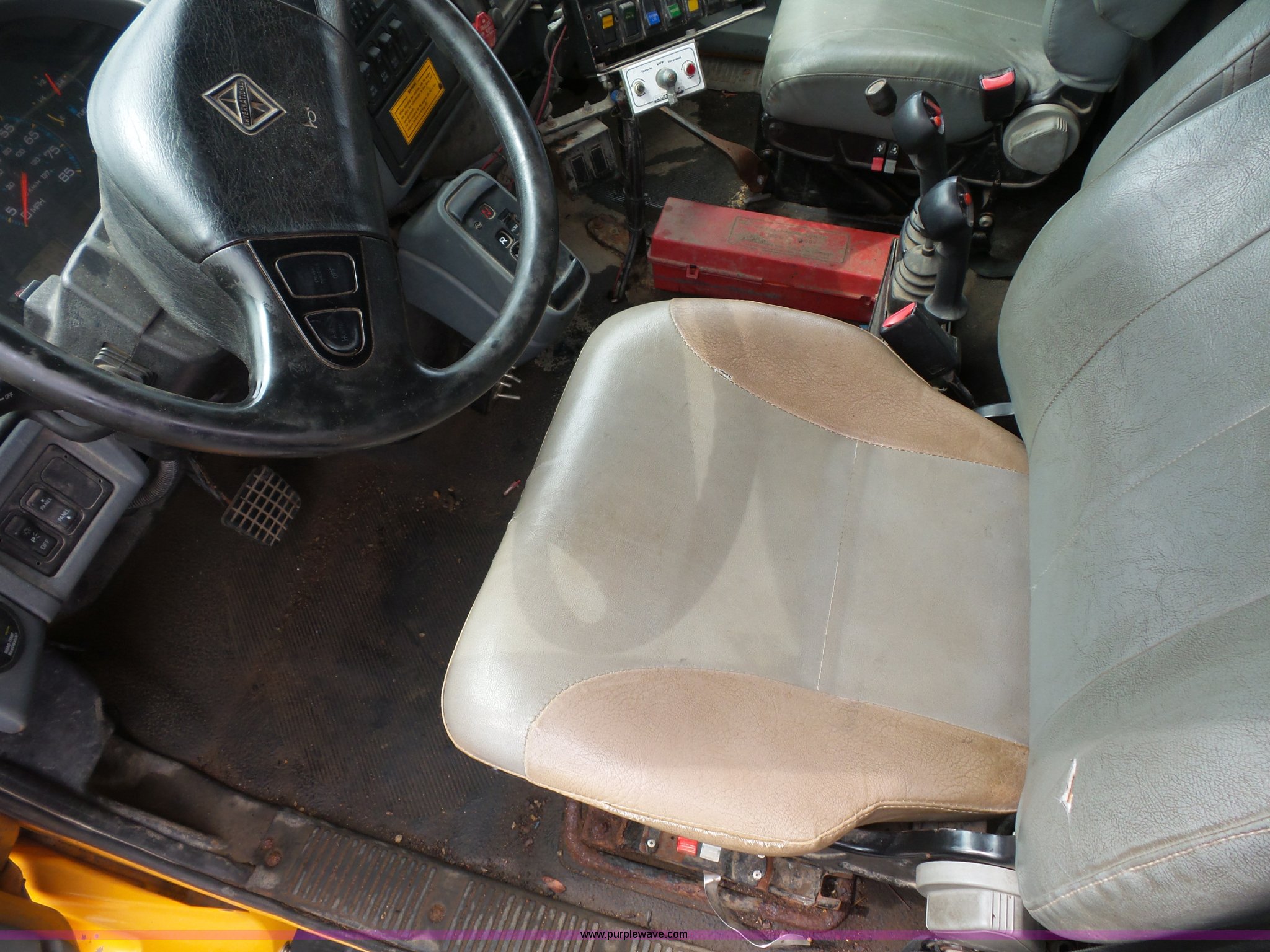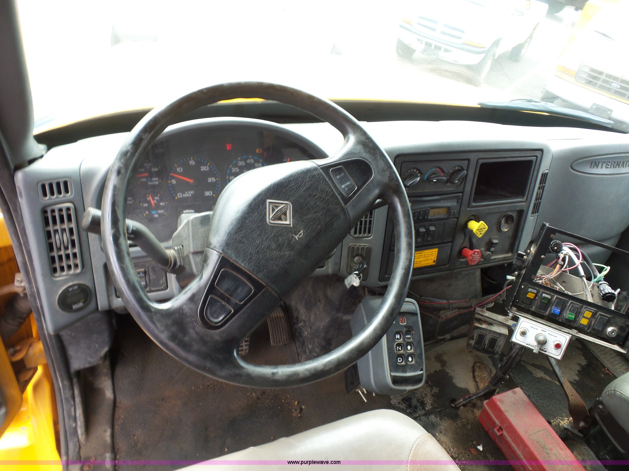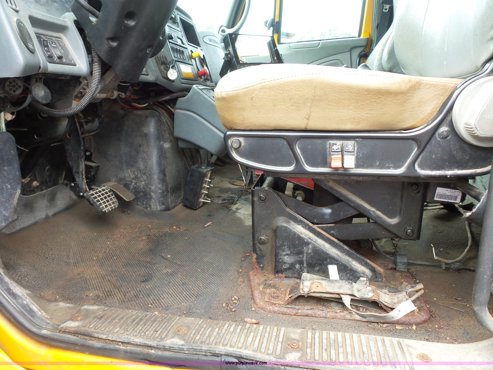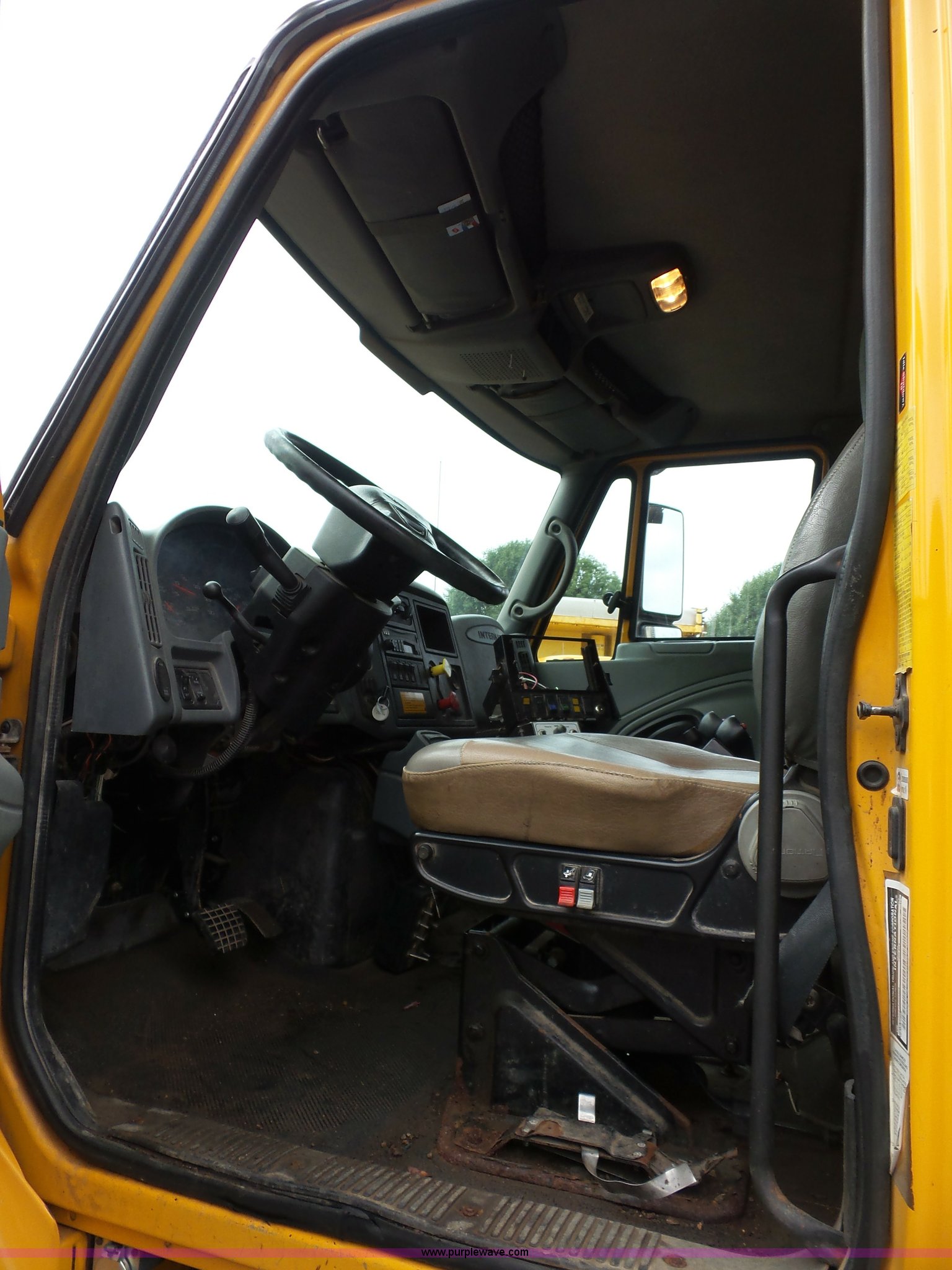 Purple Wave is selling a used Construction Dump Truck in Missouri. This item is a 2003 International 7400 dump truck with the following: 178,338 miles on odometer, 10,808 hours on meter, International DT530 8.7L L6 turbo diesel engine, Automatic transmission, Tandem axle, AC and heat, AM/FM, Power windows, Power mirrors, Air suspension seat, Block heater, Wheeler steel dump bed, 16'L x 87"W, 36" side height, Single ram hoist, Air operated end gate, Rollover tarp, Pintle hitch, Trailer wiring, Double frame, 213" wheelbase, Walking beam suspension, Air brakes, 315/80R22.5 front tires, 11R22.5 rear tires, Gvwr 58,000 lbs, FAWR 18,000 lbs, IAWR 20,000 lbs, RAWR 20,000 lbs, Possible electrical issues, MODOT ID 3096