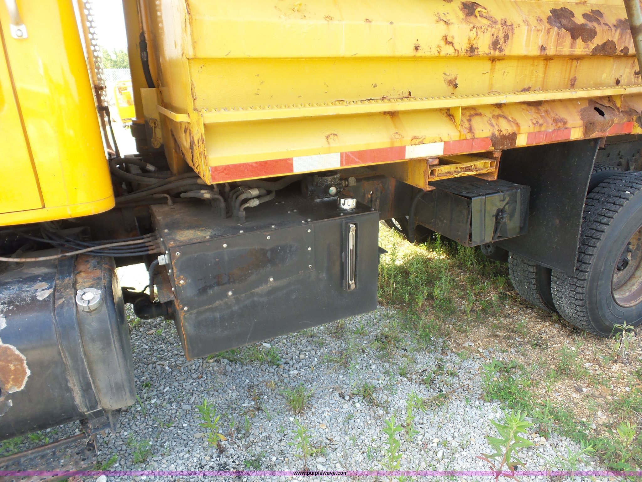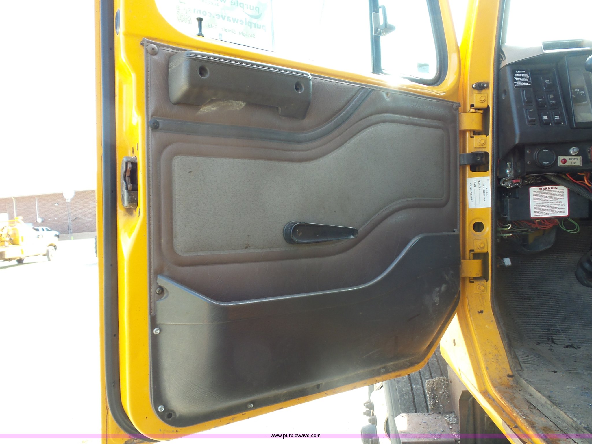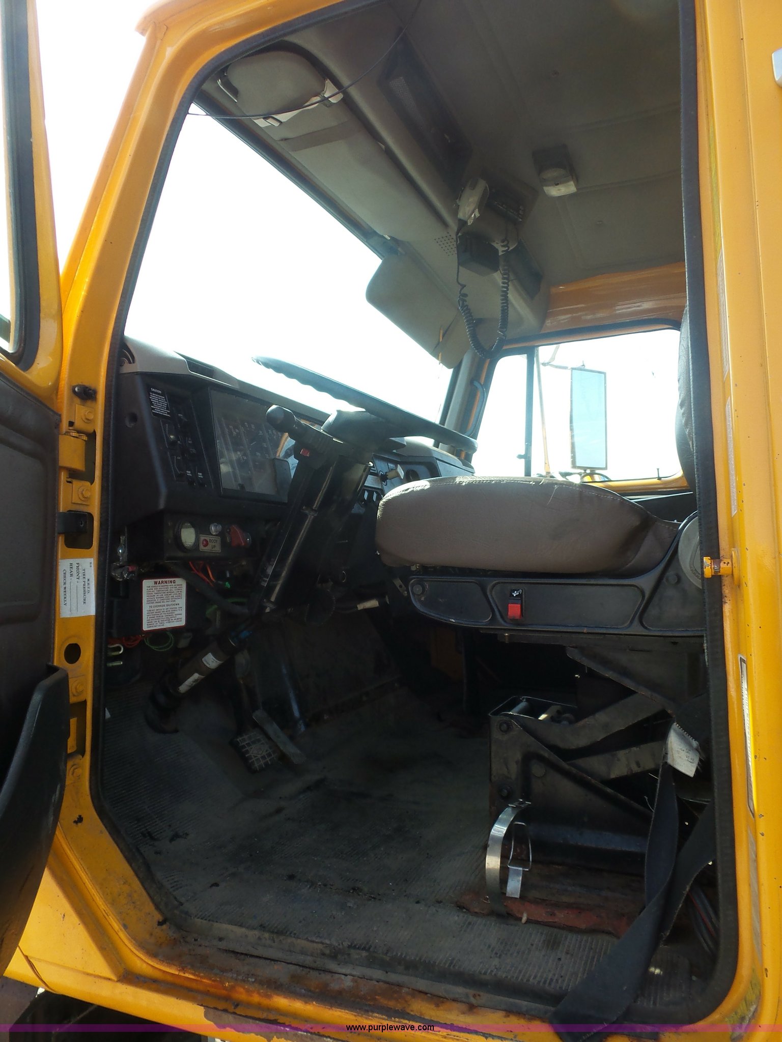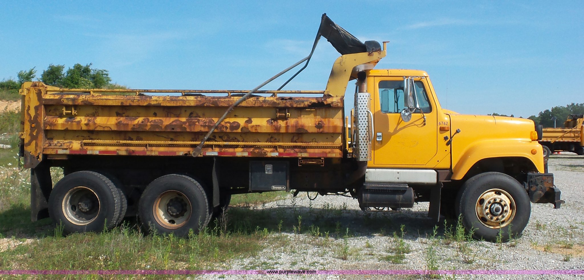 Purple Wave is selling a used Construction Dump Truck in Missouri. This item is a 2002 International F2554 dump truck with the following: 169,933 miles on odometer, 8,883 hours on meter, International DT530 8.7L L6 turbo diesel engine, Allison automatic transmission, Heat, Cruise, Power windows, Heated mirrors, Air suspension seat, Front mounted PTO, 16'L x 8'W steel dump bed, 3'H sides, Rollover tarp, Air operated end gate, Single ram hoist, Walking beam suspension, Air brakes, 216" wheelbase, 315/80R22.5 front tires, 11R22.5 rear tires, Two-way radio not included, Passenger cab mount missing, Possible engine issues, engine blow-by, MODOT ID 6762