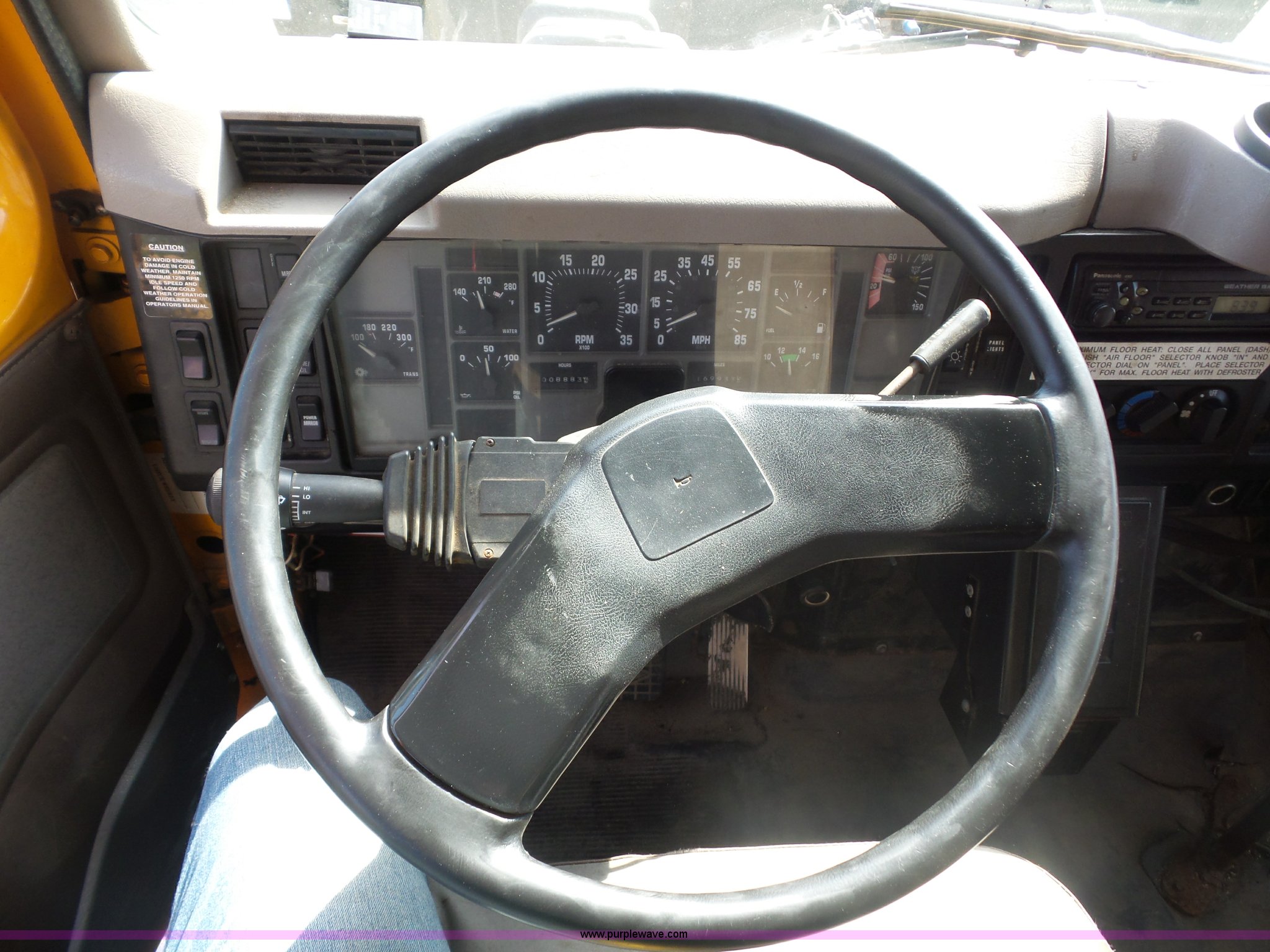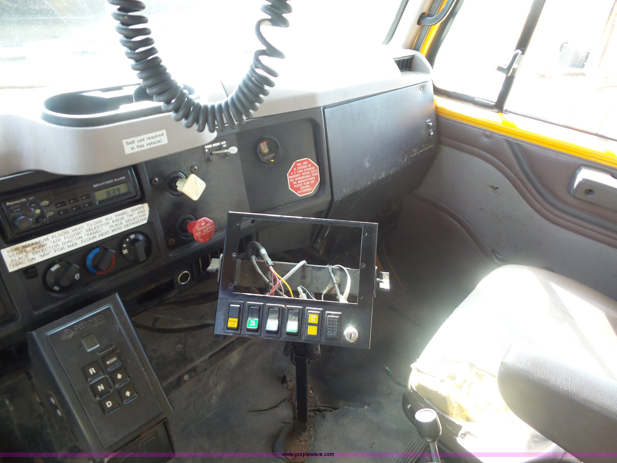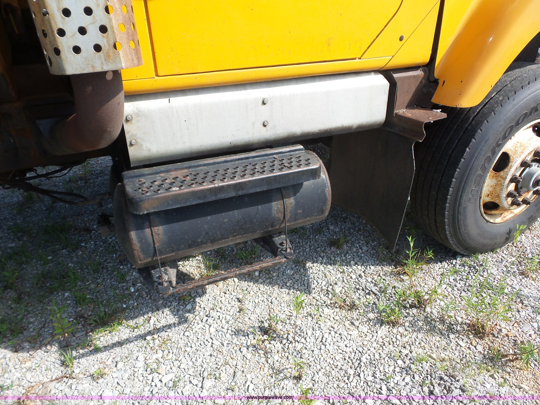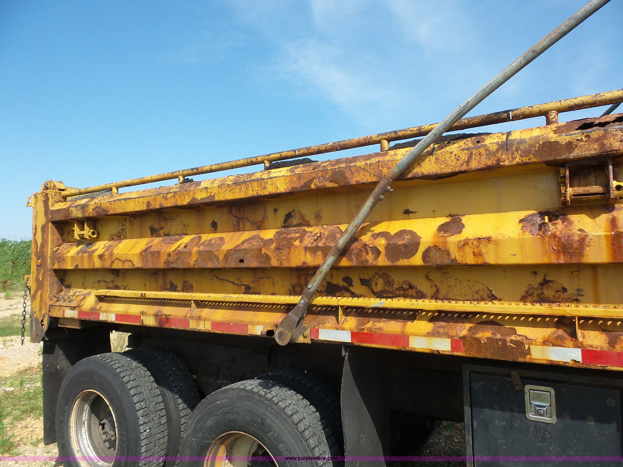 Purple Wave is selling a used Construction Dump Truck in Missouri. This item is a 2002 International F2554 dump truck with the following: 169,933 miles on odometer, 8,883 hours on meter, International DT530 8.7L L6 turbo diesel engine, Allison automatic transmission, Heat, Cruise, Power windows, Heated mirrors, Air suspension seat, Front mounted PTO, 16'L x 8'W steel dump bed, 3'H sides, Rollover tarp, Air operated end gate, Single ram hoist, Walking beam suspension, Air brakes, 216" wheelbase, 315/80R22.5 front tires, 11R22.5 rear tires, Two-way radio not included, Passenger cab mount missing, Possible engine issues, engine blow-by, MODOT ID 6762