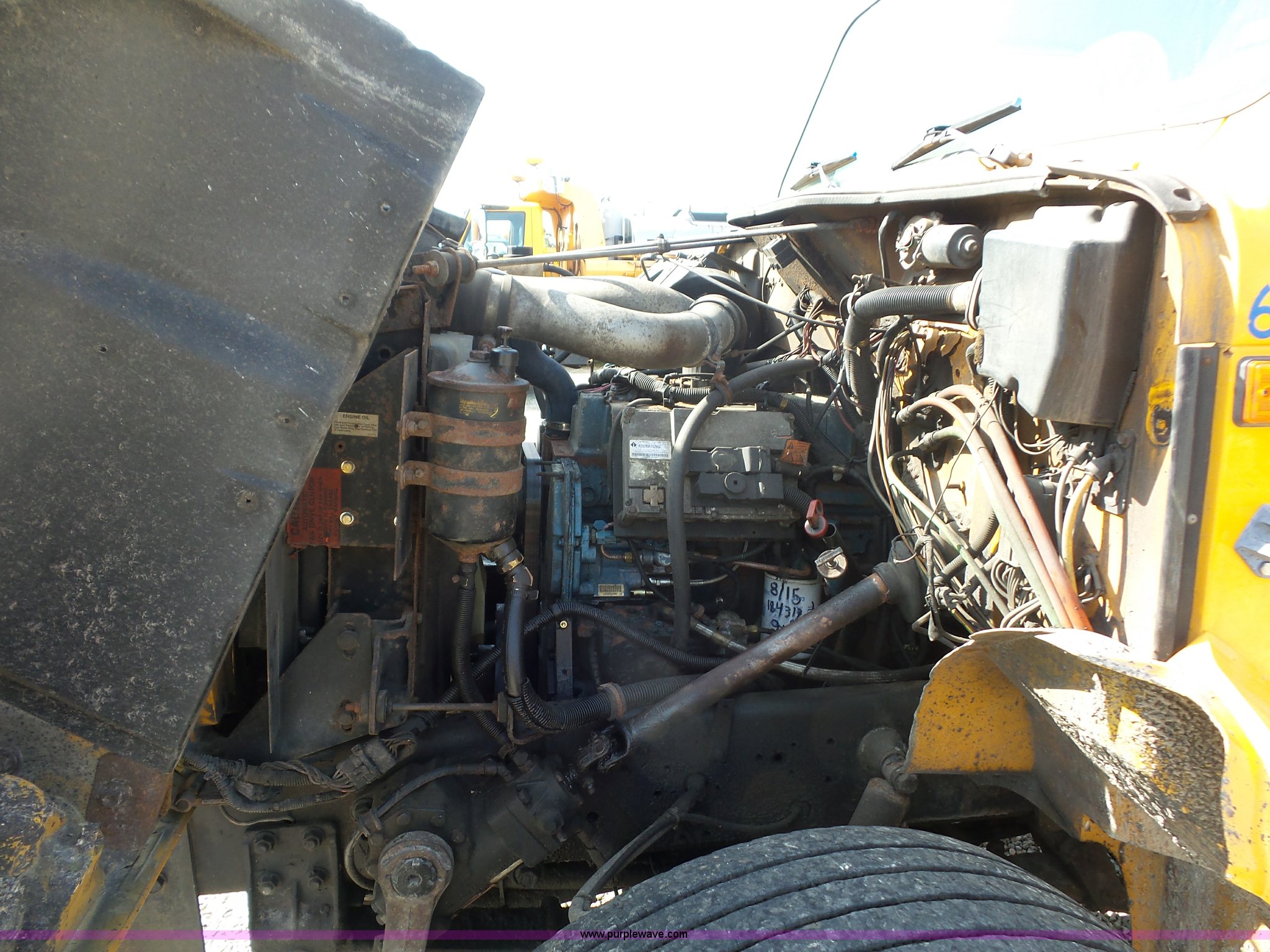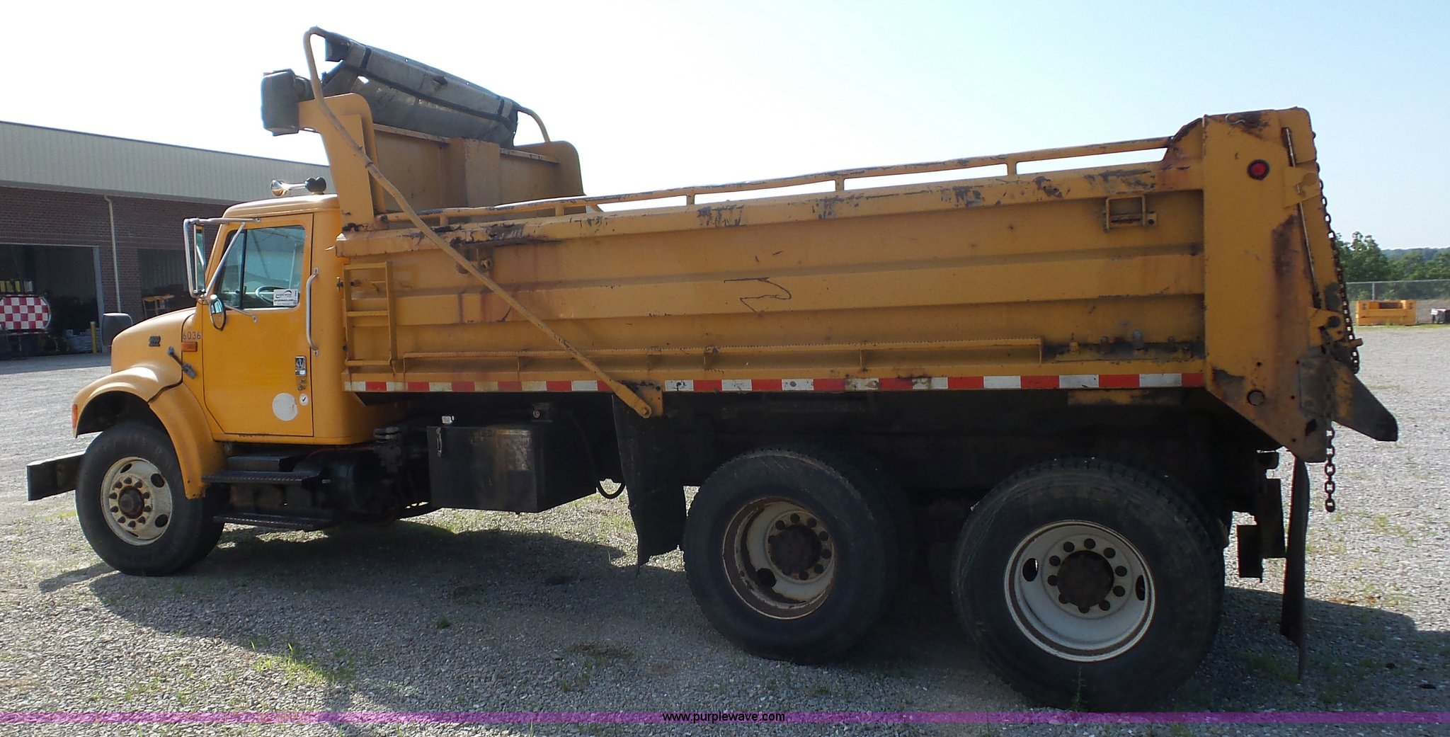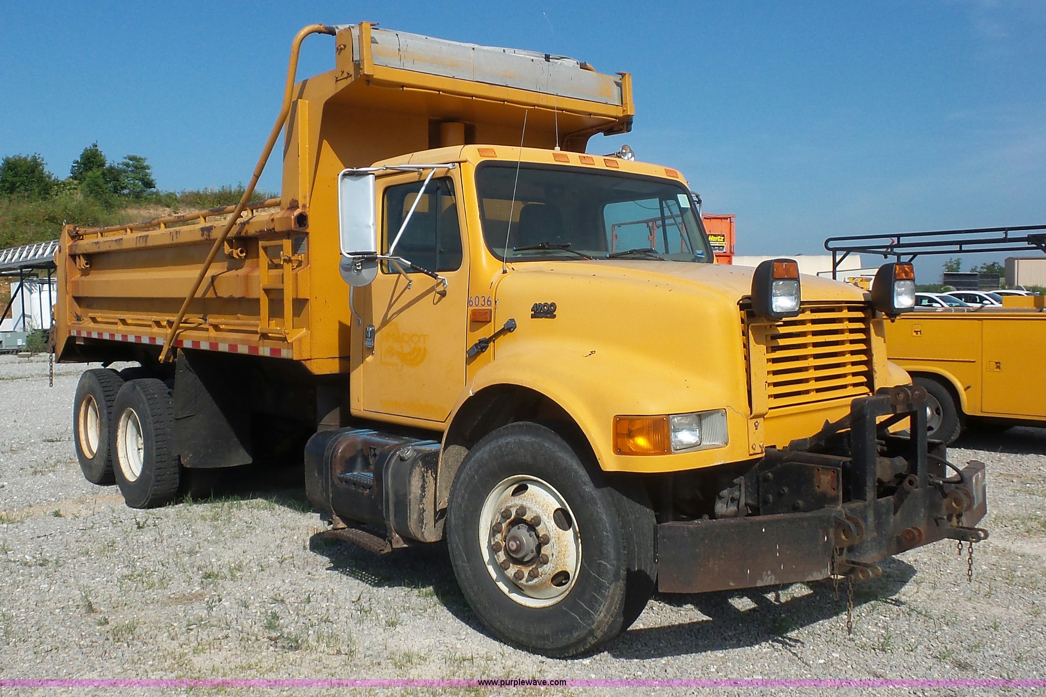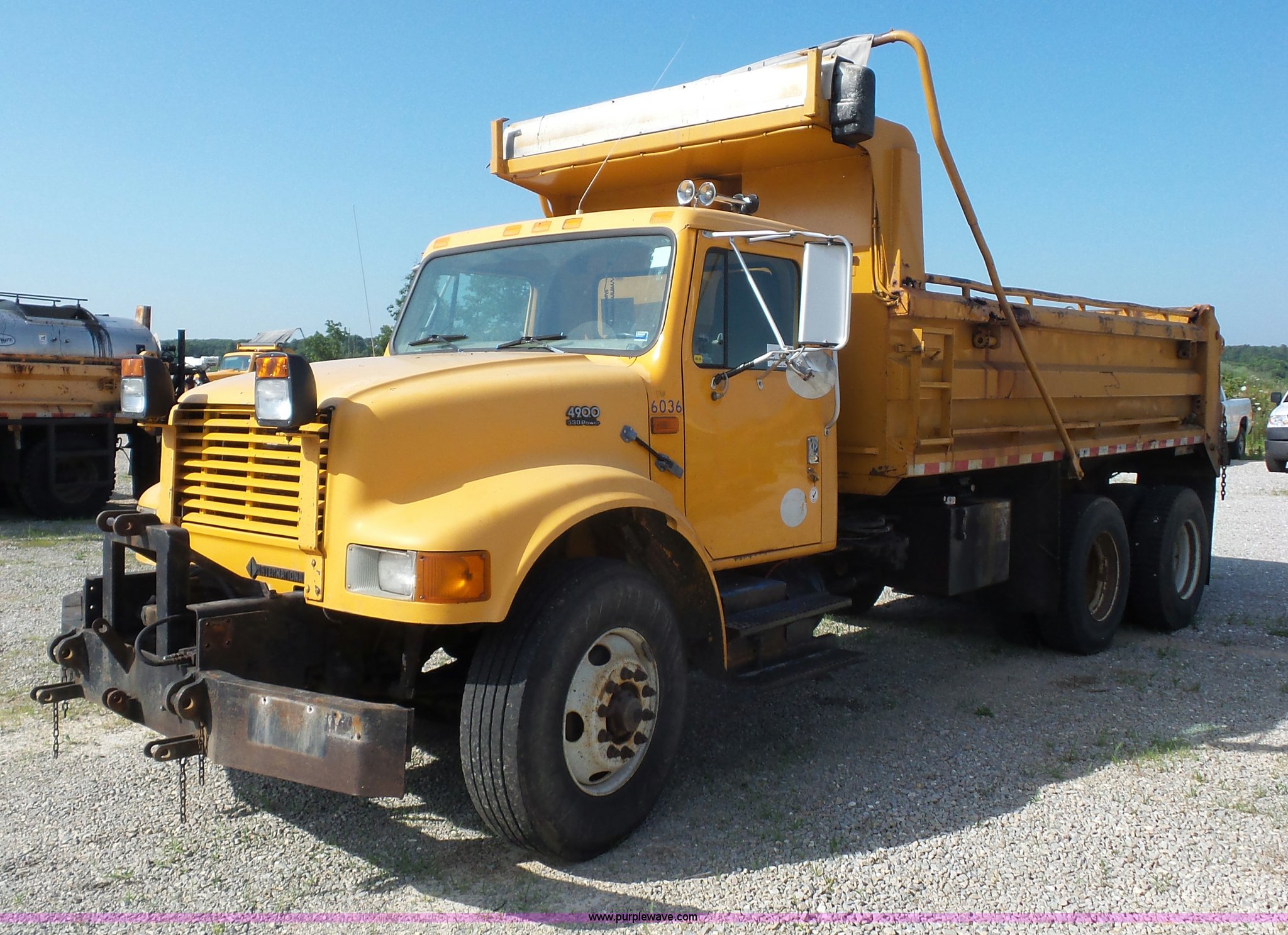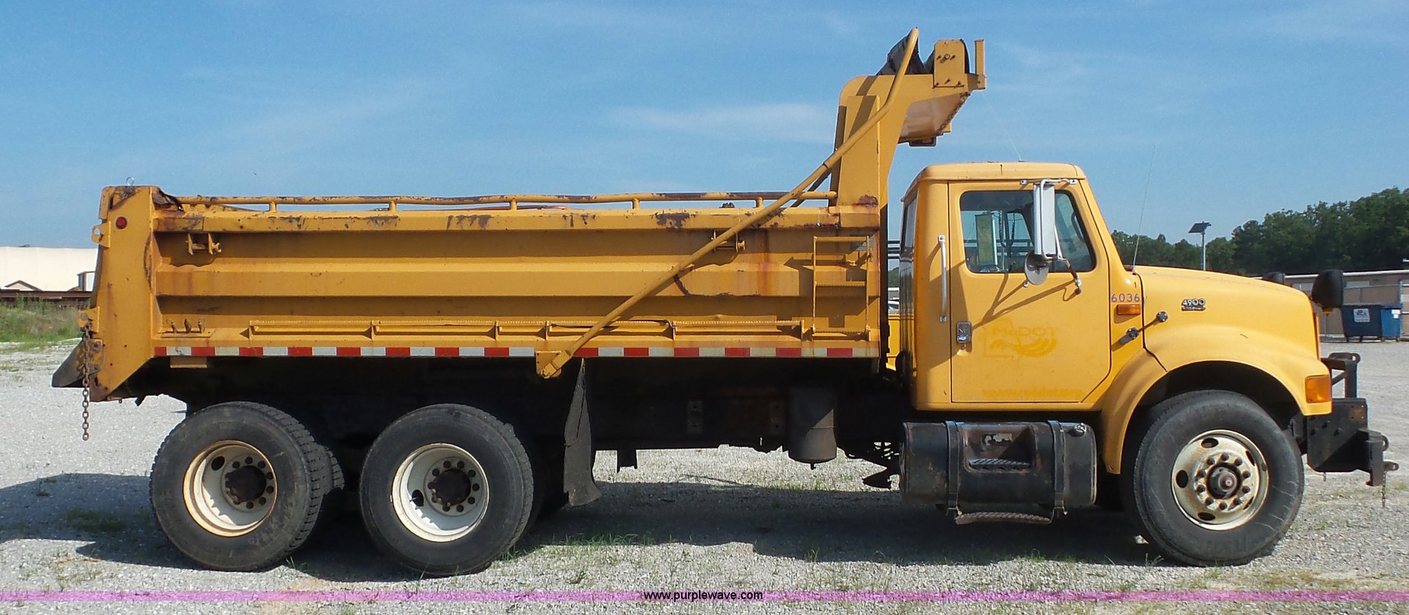 Purple Wave is selling a used Construction Dump Truck in Missouri. This item is a 1999 International 4900 dump truck with the following: 186,394 miles on odometer, 9,145 hours on meter, International DT530 8.7L L6 turbo diesel engine, Allison automatic transmission, Heat, Cruise, AM/FM, Heated mirrors, Air suspension seat, Front mounted PTO, 16'L x 8'W steel dump bed, 3' side height, Rollover tarp, Air operated end gate, Single ram hoist, Spring over walking beam suspension, Air brakes, 206" wheelbase, 315/80R22.5 front tires, 11R22.5 rear tires, Rust, Walking beam bushings need replaced, MODOT ID 6036