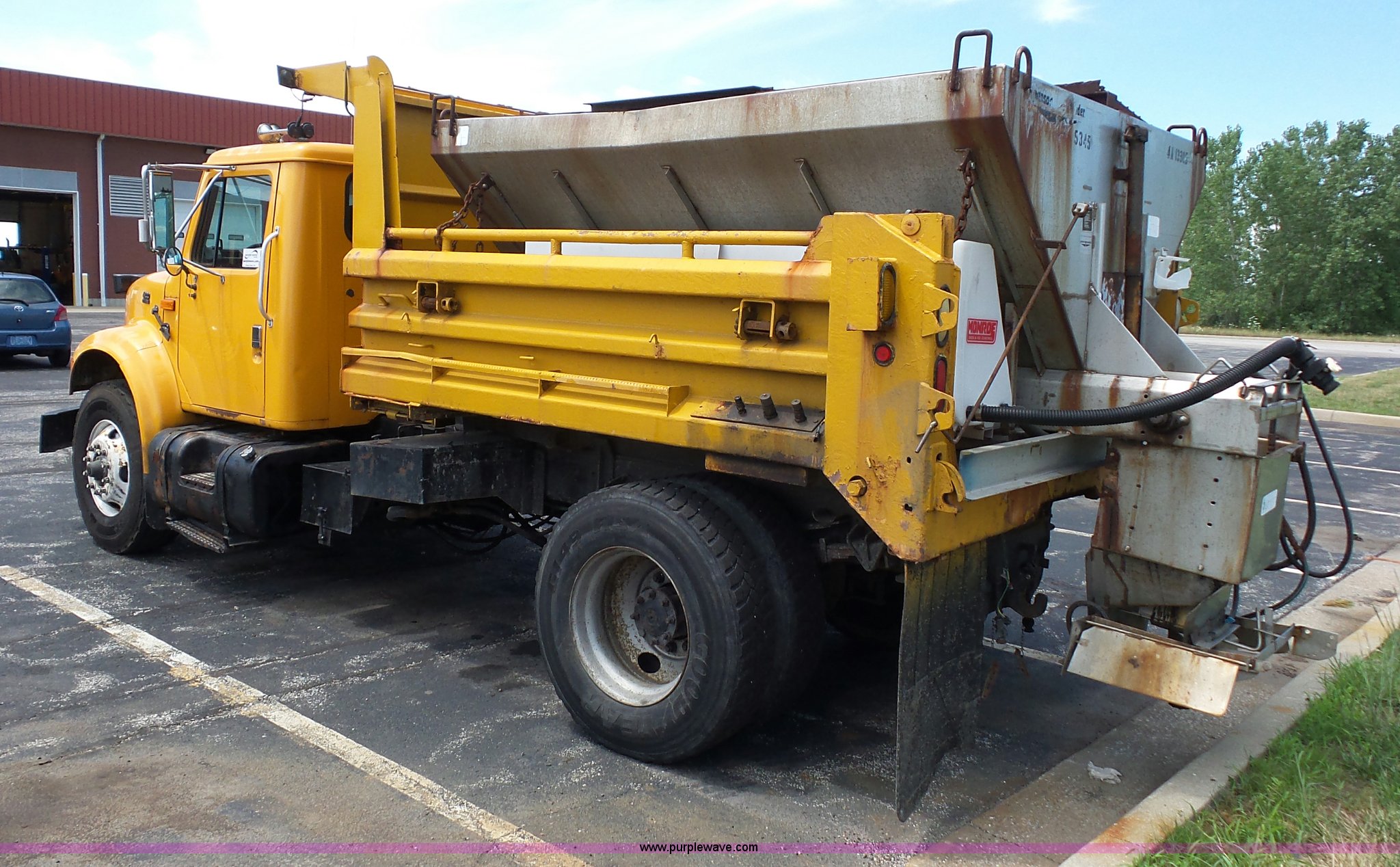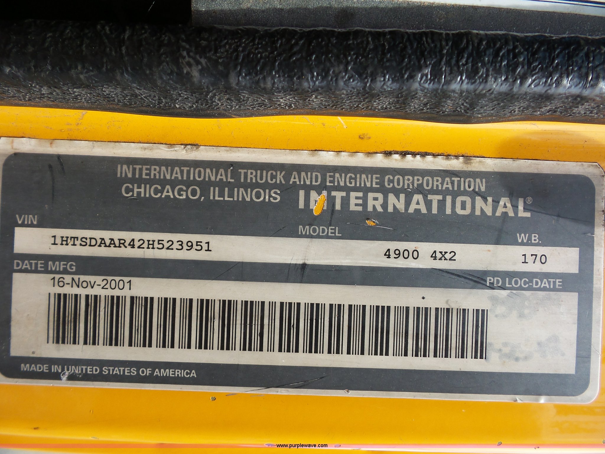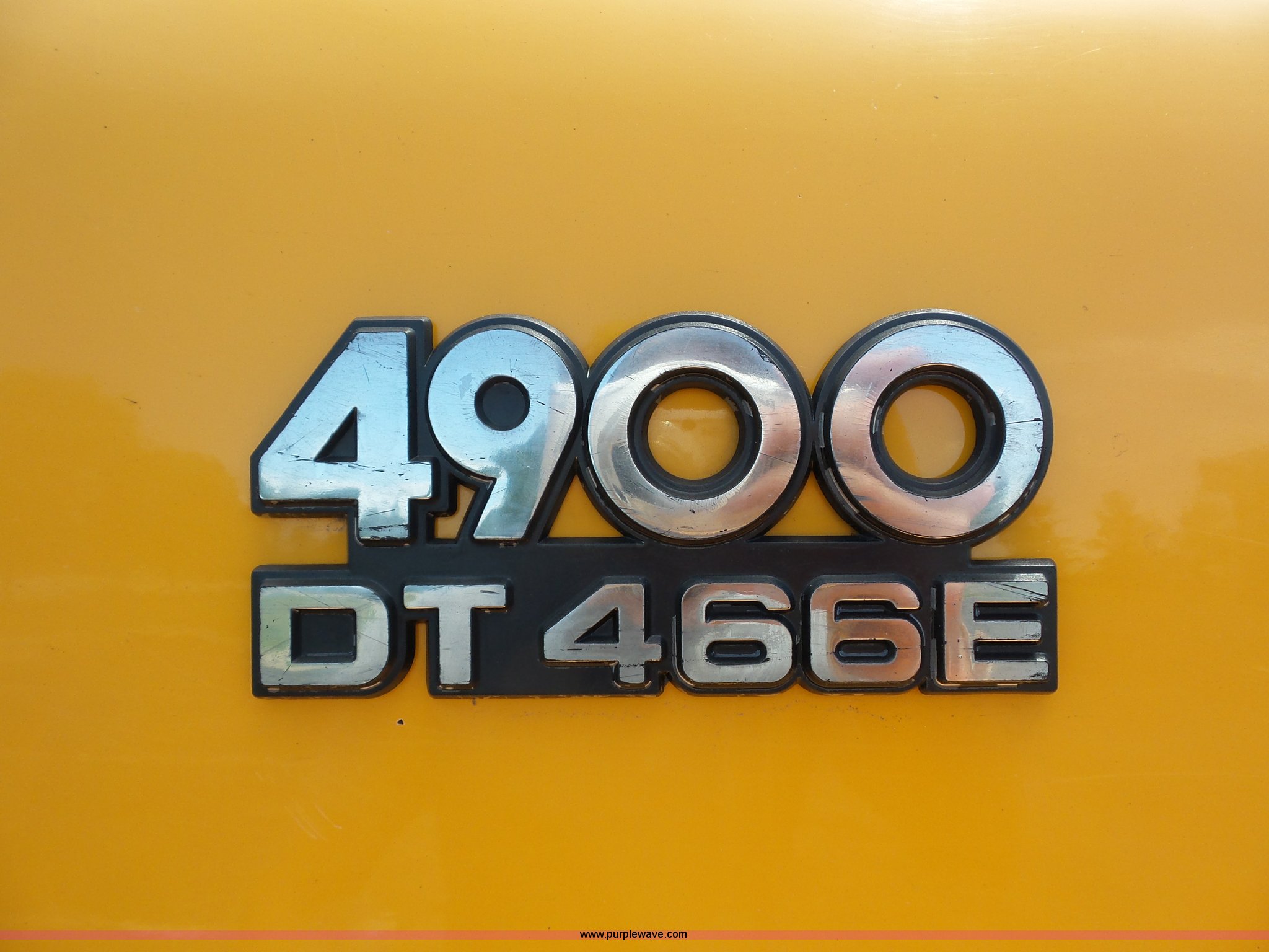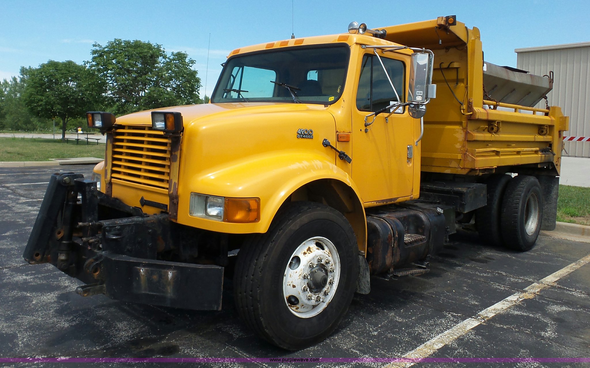 Purple Wave is selling a used Construction Dump Truck in Missouri. This item is a 2002 International 4900 dump truck with the following: 156,615 miles on odometer, 13,215 hours on meter, International DT466 7.6L L6 turbo diesel engine, Automatic transmission, Heat, Cruise, AM/FM, Heated mirrors, Air suspension seat, PTO, Steel dump bed, 10'L x 8'W, 24" side height, Single ram hoist, Stainless steel spreader, Snow plow, 15'W, 170" wheelbase, Spring suspension, Air brakes, 315/80R22.5 front tires, 11R22.5 rear tires, Frame rails broken, Fuel tank leaks, Floor boards rusted, Vehicle must be towed, MODOT ID 6890