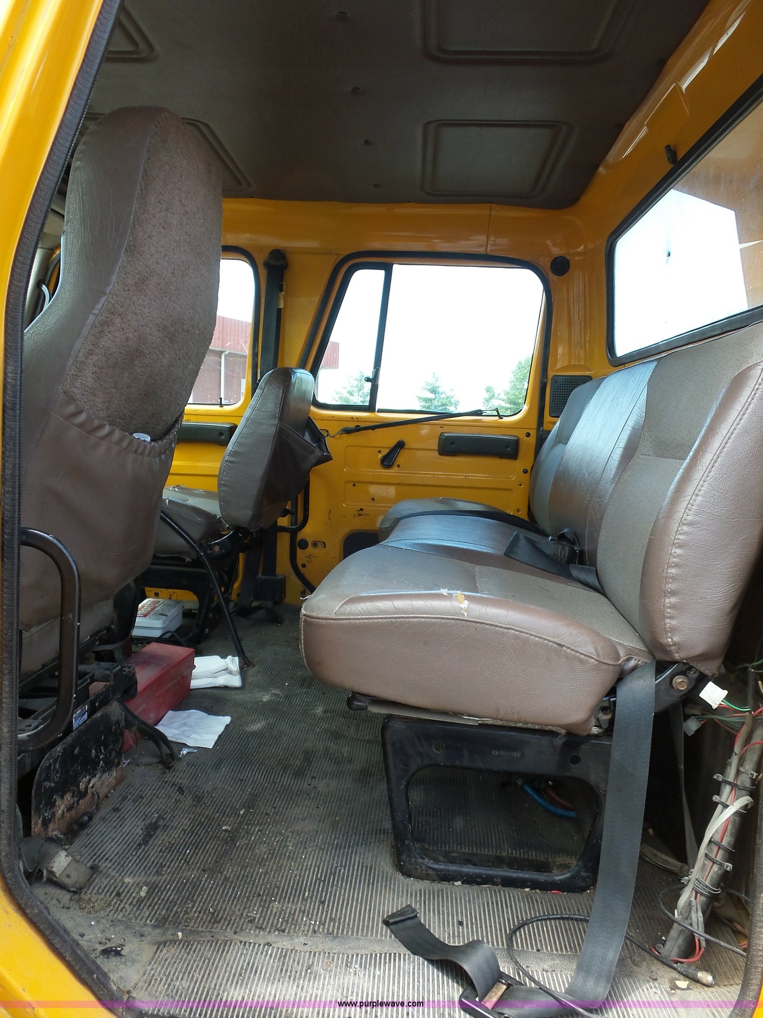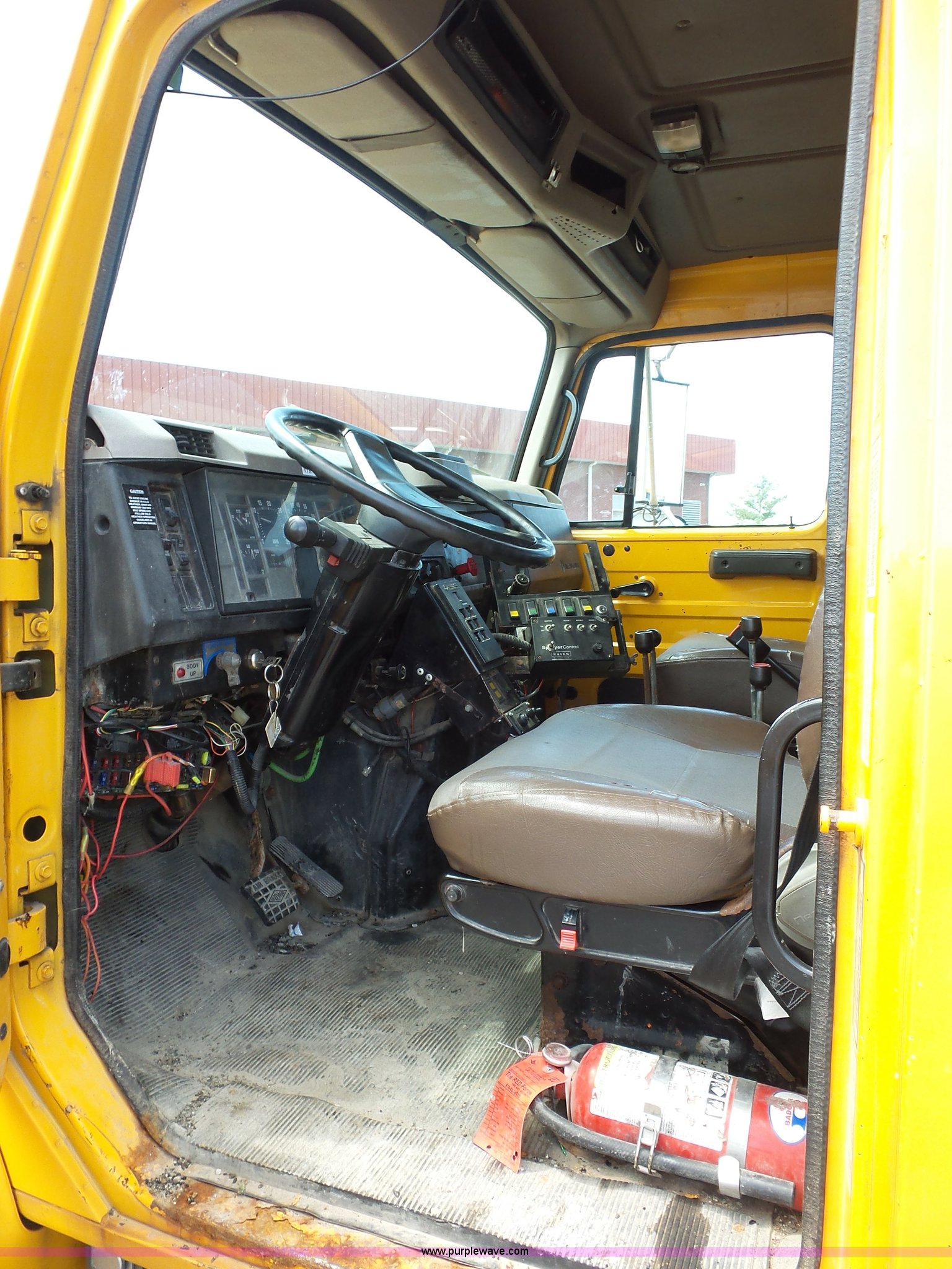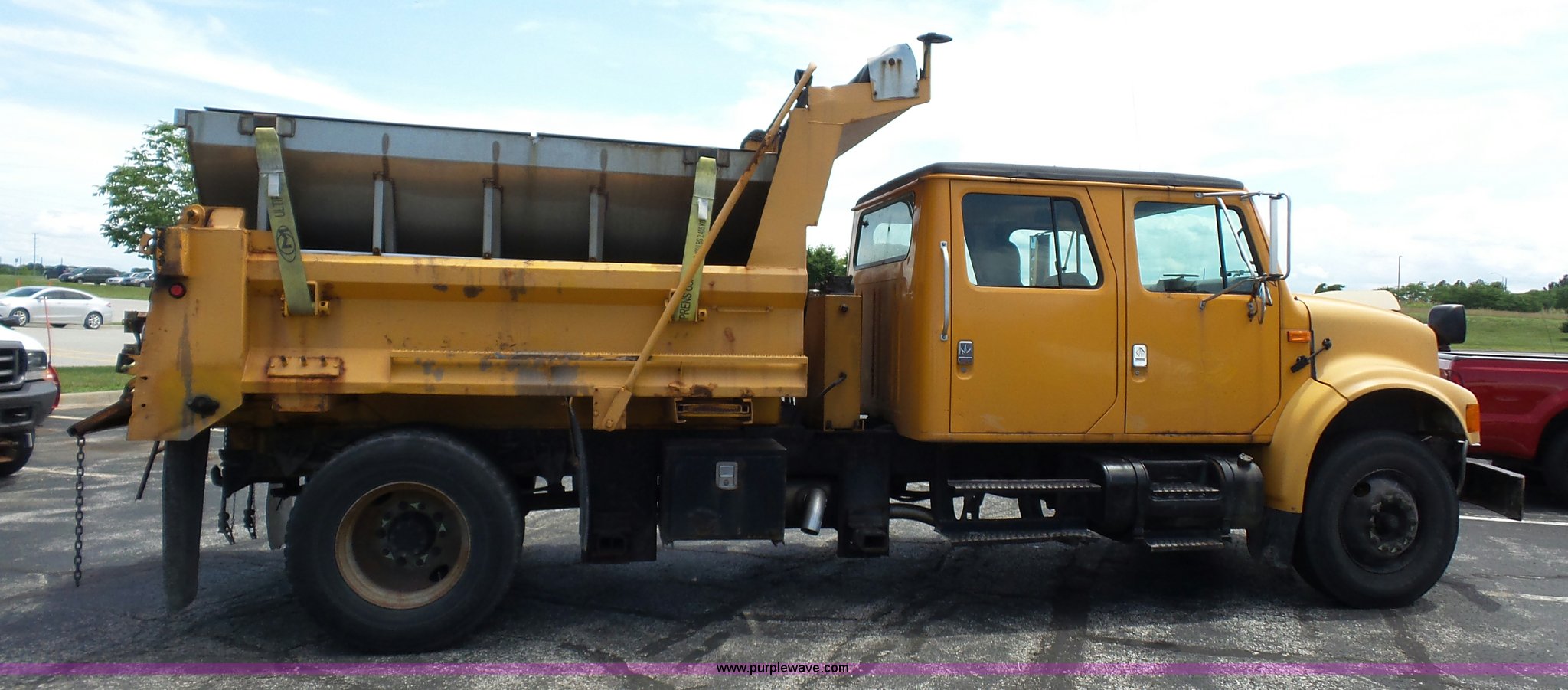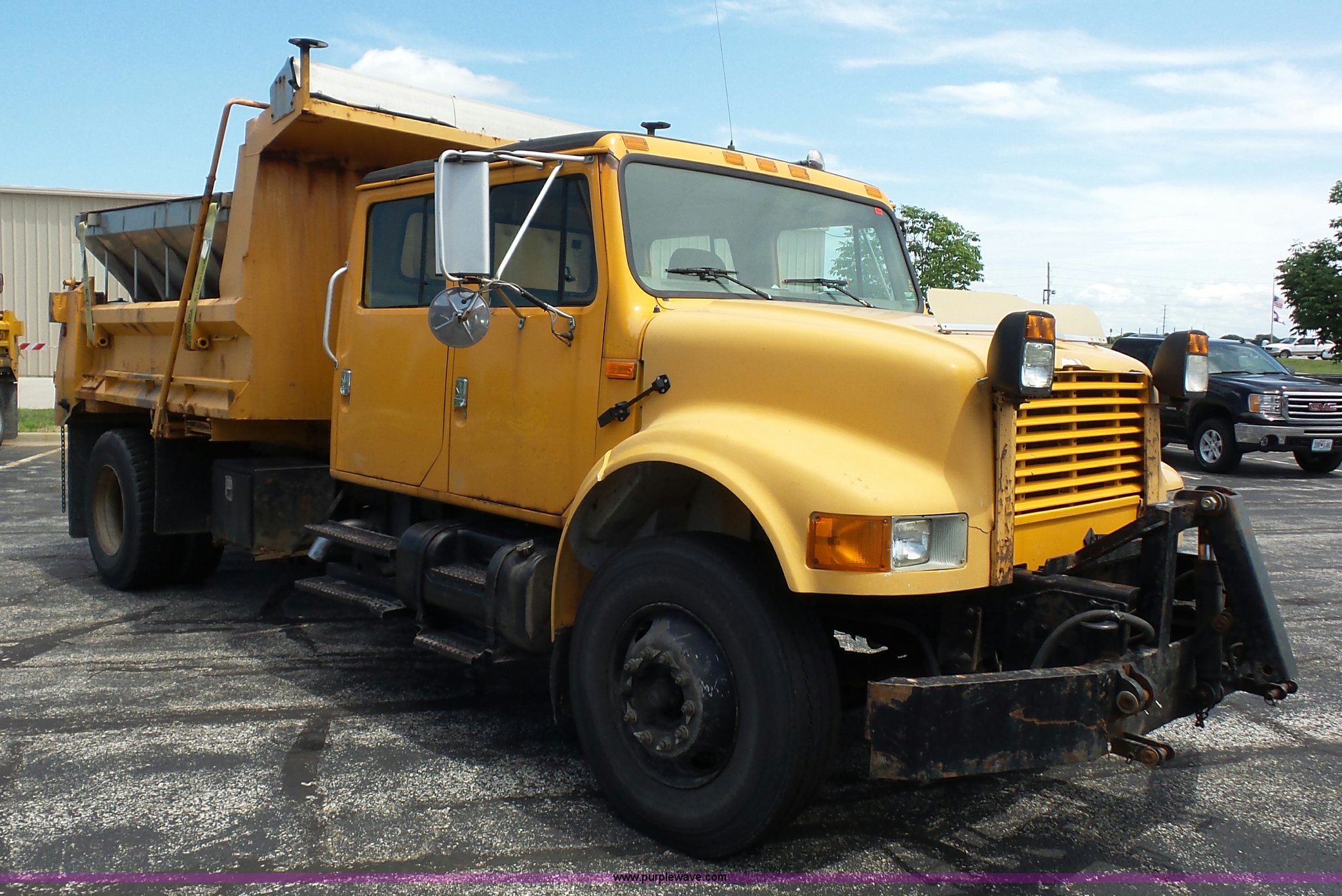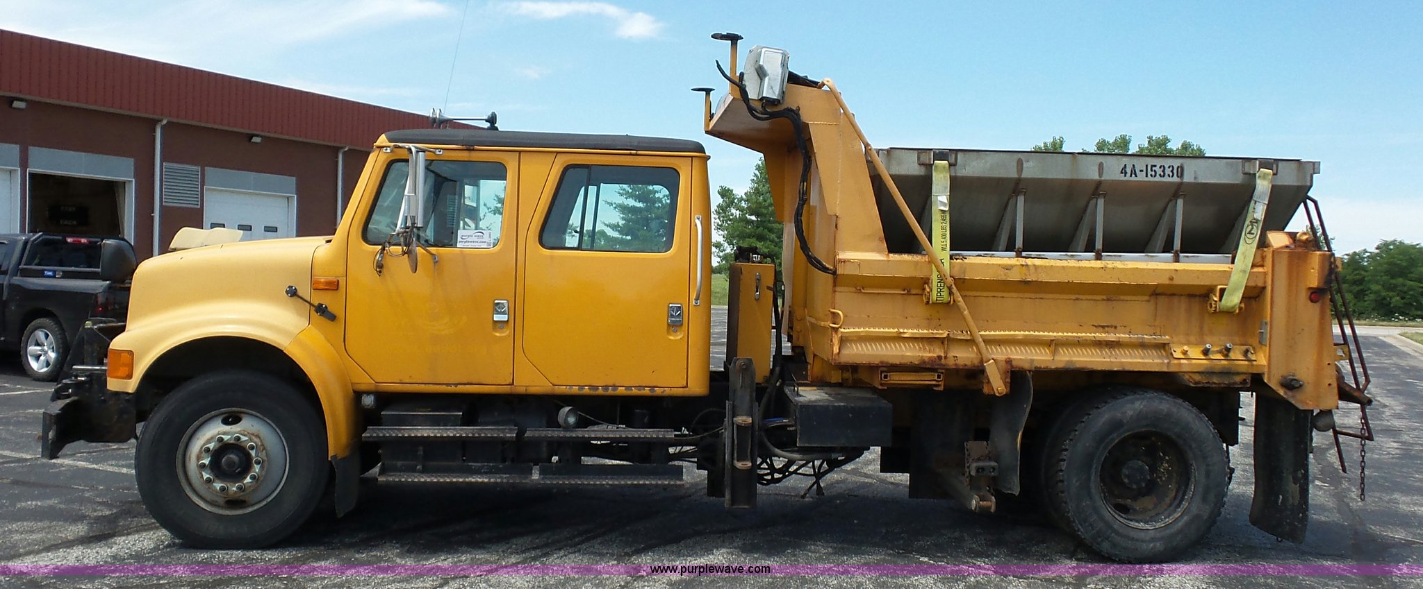 Purple Wave is selling a used Construction Dump Truck in Missouri. This item is a 2001 International 4900 dump truck with the following: 168,866 miles on odometer, 11,550 hours on meter, International DT466 7.6L L6 turbo diesel engine, Automatic transmission, Heat, Cruise, AM/FM, Heated mirrors, Air suspension seat, PTO, Steel dump bed, 10'L x 8'W, 24" side height, Single ram hoist, Rollover tarp, Flink stainless steel spreader, Four door, Snow plow 12'W, Wing plow, 8'W, 206" wheelbase, Spring suspension, Air brakes, 11R22.5 tires, Power steering leak, Cab supports rusted, Carrier bearings and pinon seal bad, Bed rusted, Tie rods bent, MODOT ID 6378