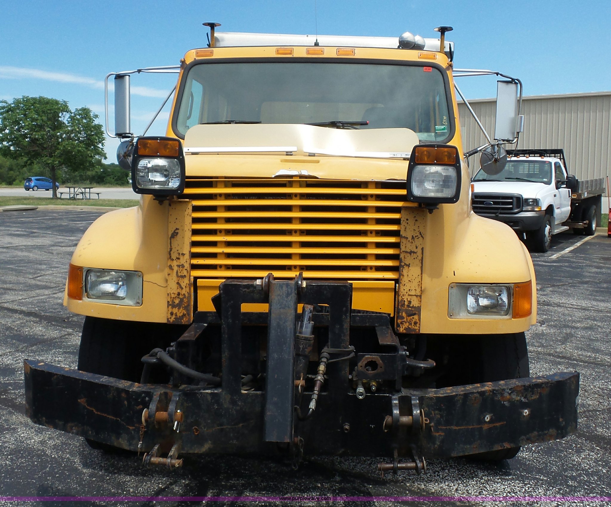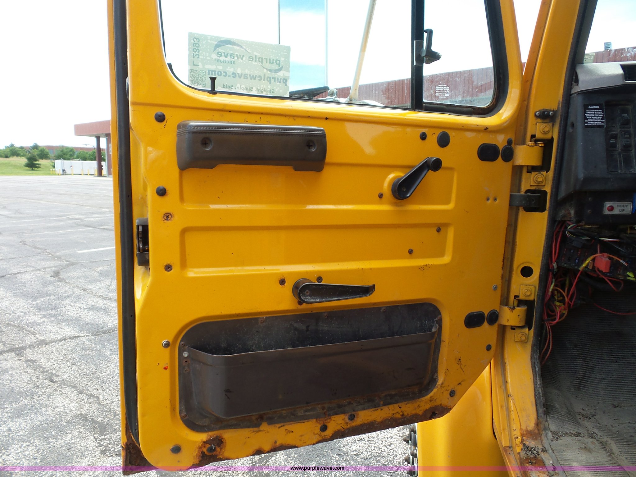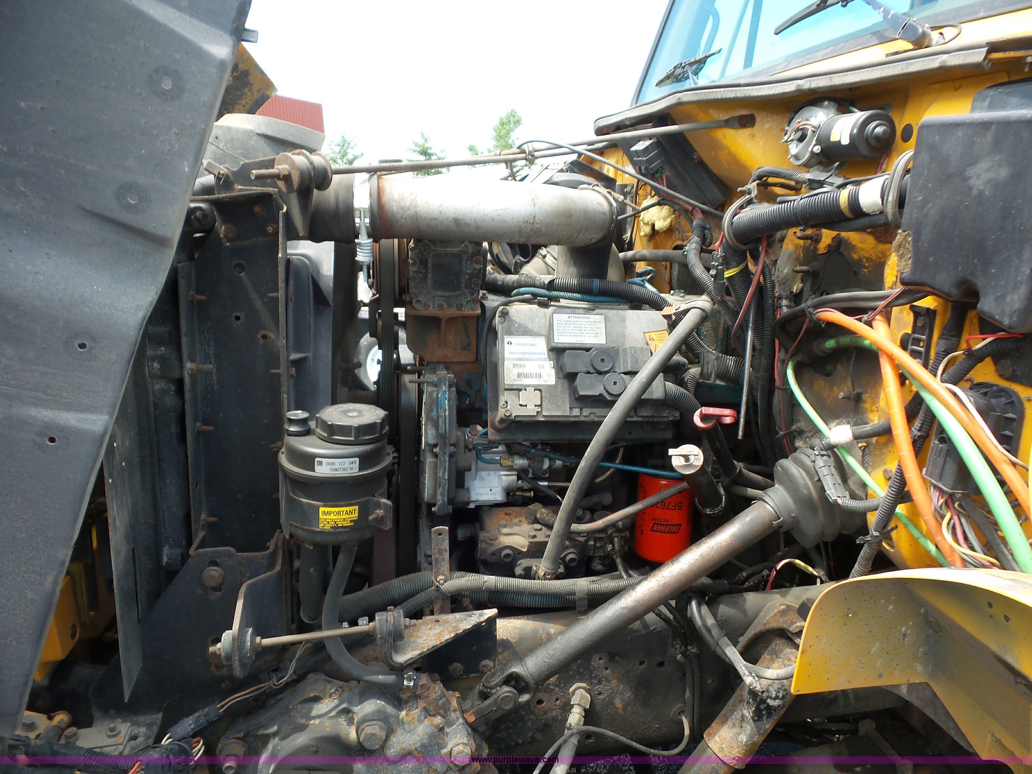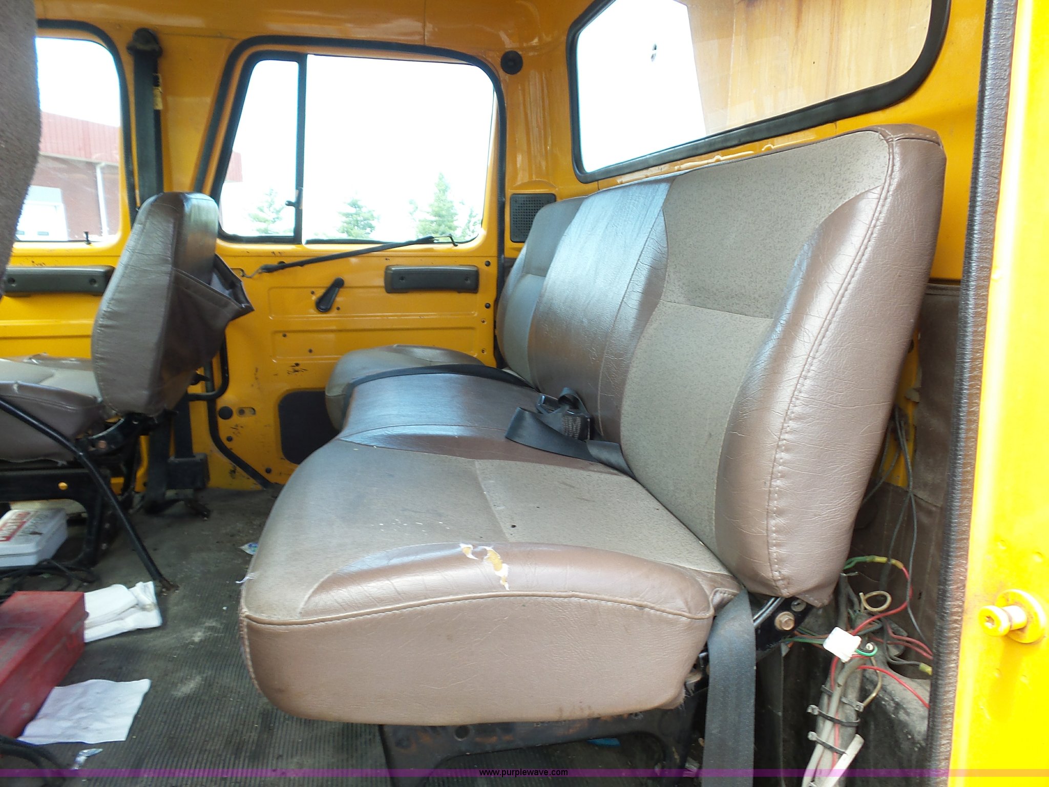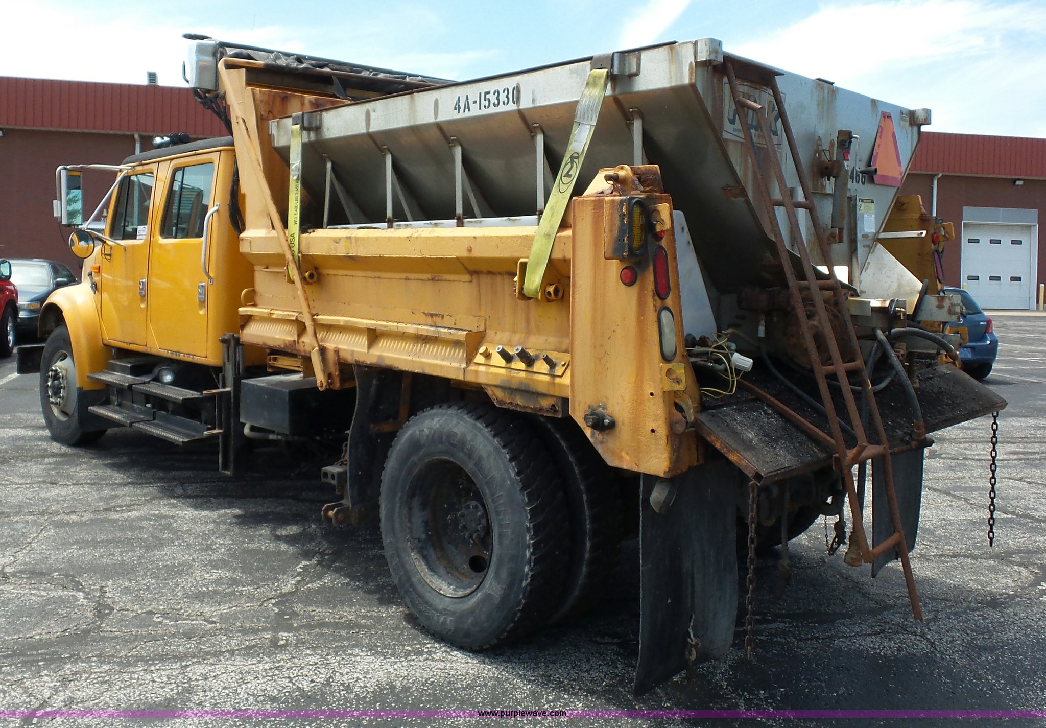 Purple Wave is selling a used Construction Dump Truck in Missouri. This item is a 2001 International 4900 dump truck with the following: 168,866 miles on odometer, 11,550 hours on meter, International DT466 7.6L L6 turbo diesel engine, Automatic transmission, Heat, Cruise, AM/FM, Heated mirrors, Air suspension seat, PTO, Steel dump bed, 10'L x 8'W, 24" side height, Single ram hoist, Rollover tarp, Flink stainless steel spreader, Four door, Snow plow 12'W, Wing plow, 8'W, 206" wheelbase, Spring suspension, Air brakes, 11R22.5 tires, Power steering leak, Cab supports rusted, Carrier bearings and pinon seal bad, Bed rusted, Tie rods bent, MODOT ID 6378