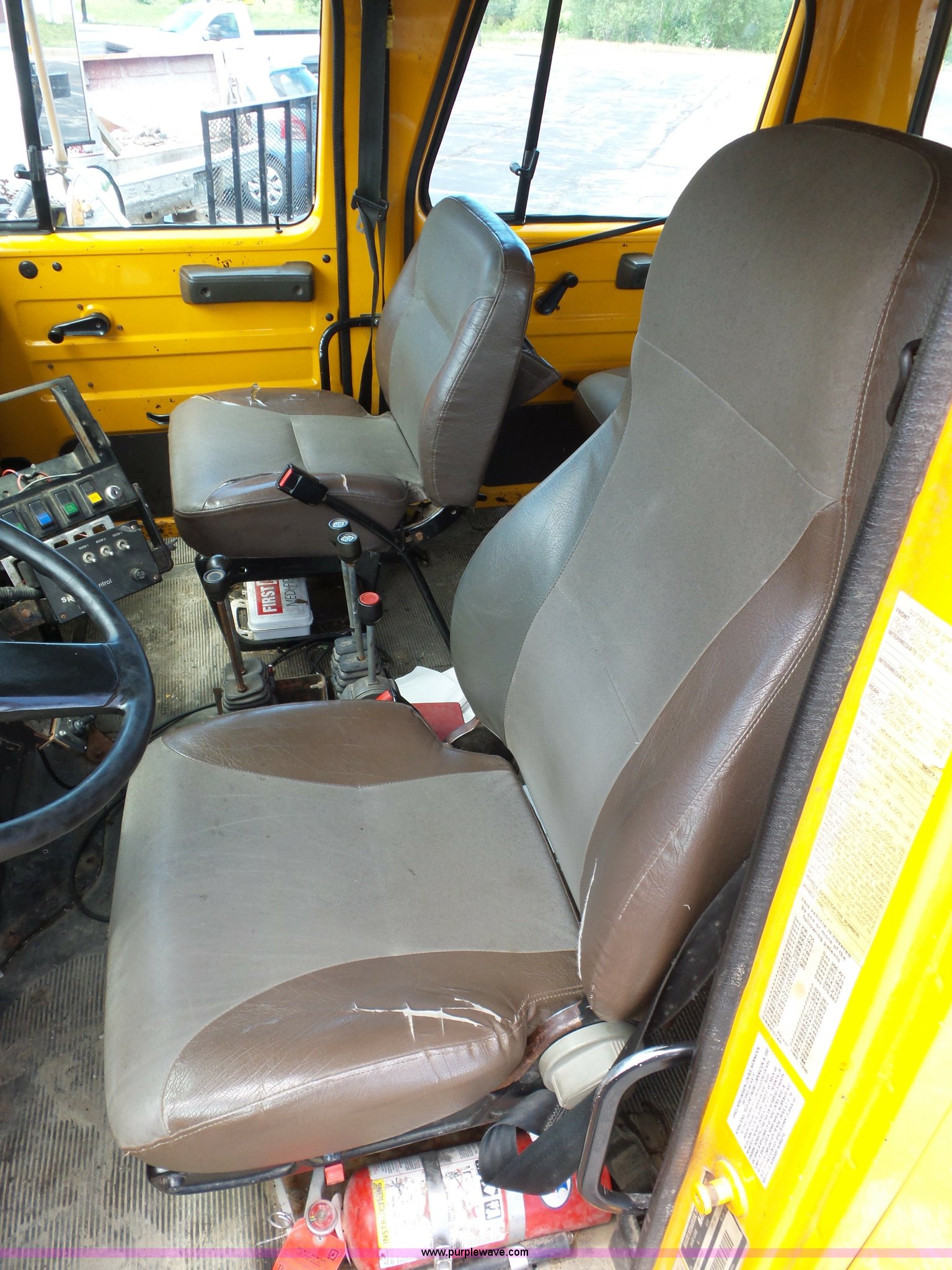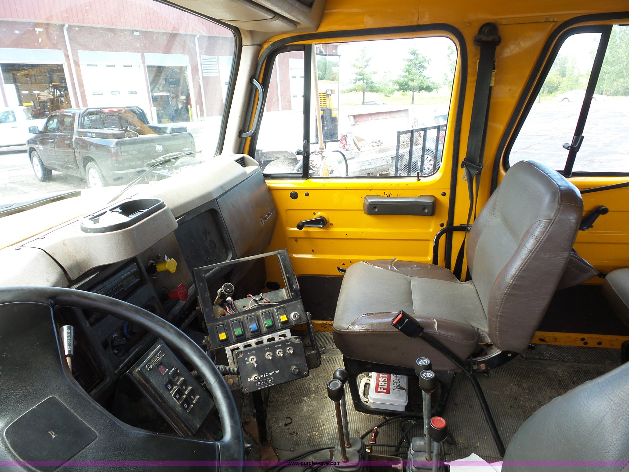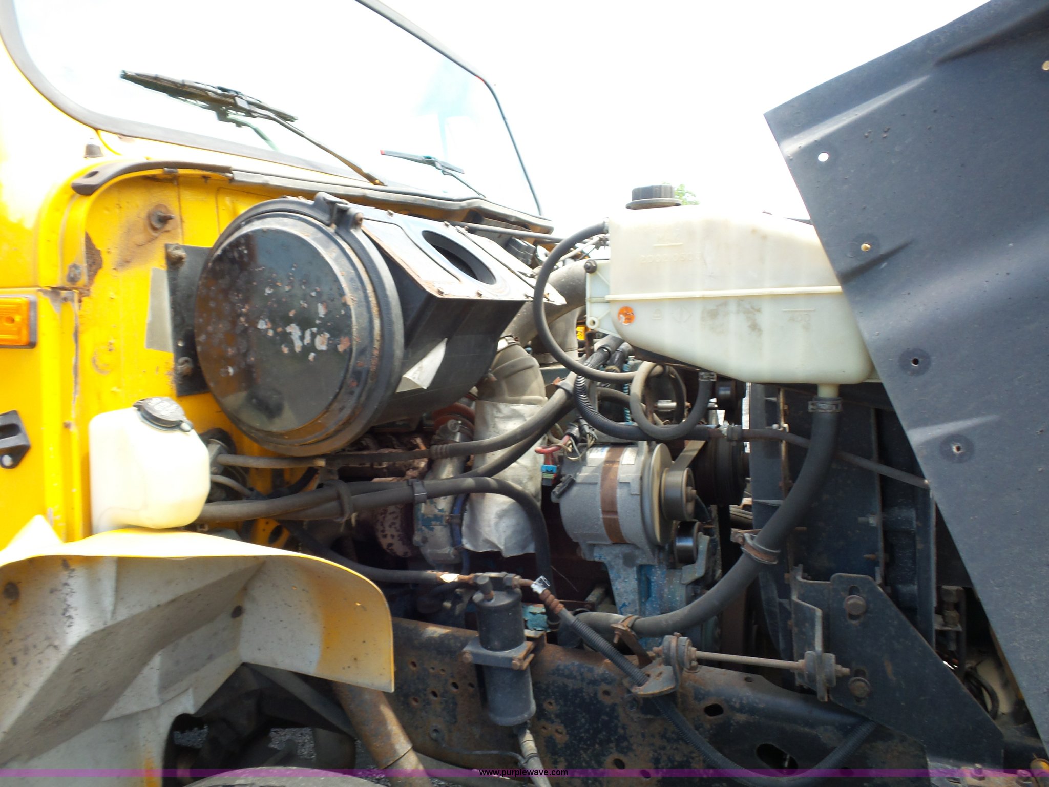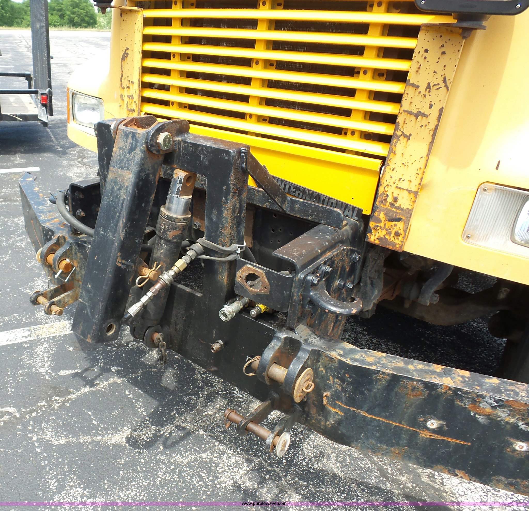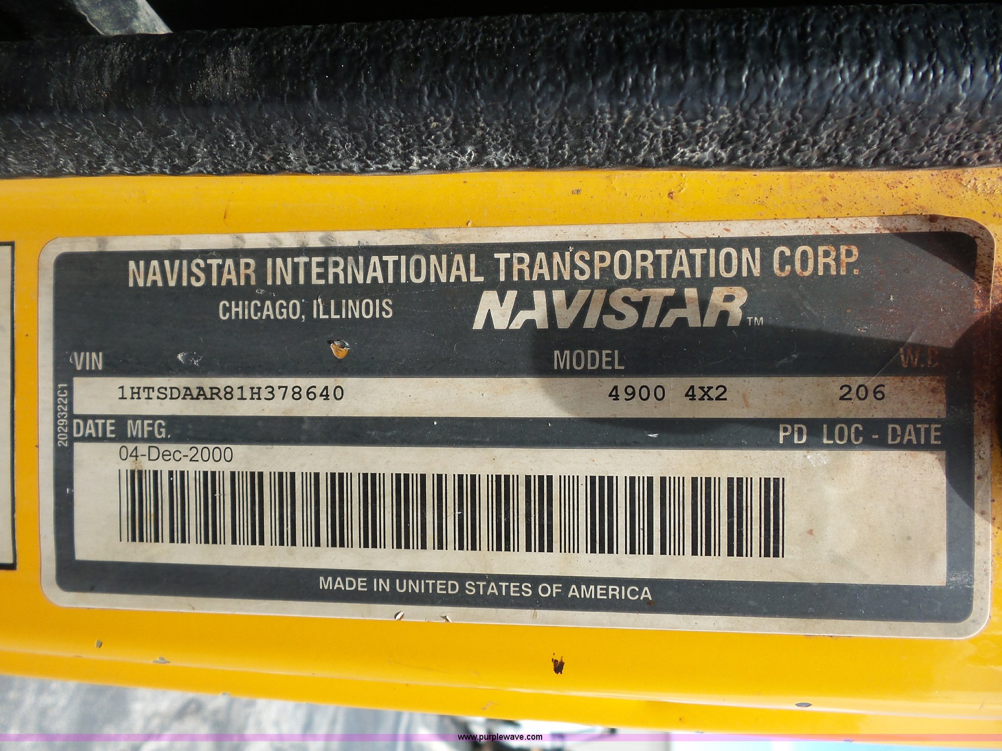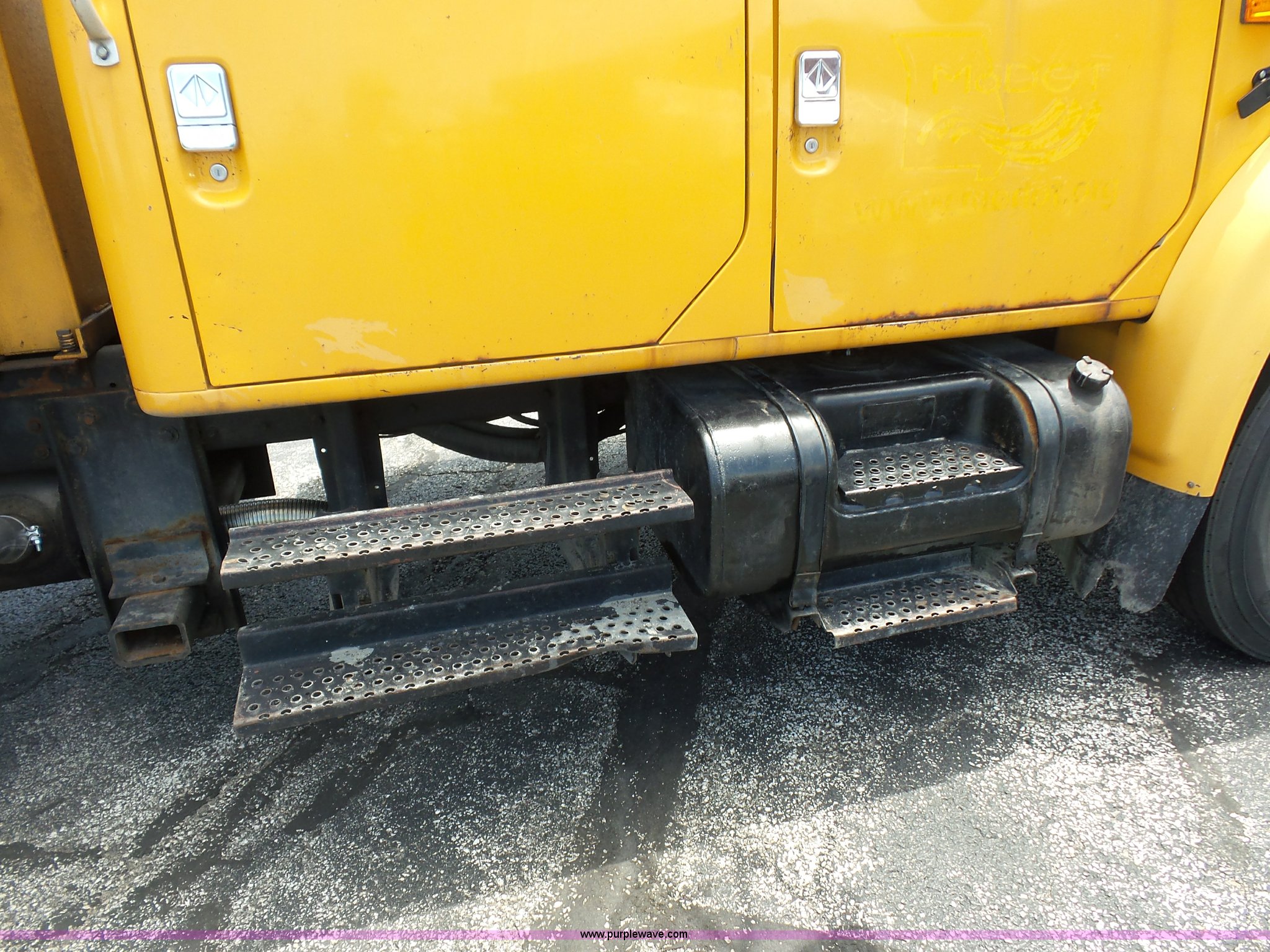Purple Wave is selling a used Construction Dump Truck in Missouri. This item is a 2001 International 4900 dump truck with the following: 168,866 miles on odometer, 11,550 hours on meter, International DT466 7.6L L6 turbo diesel engine, Automatic transmission, Heat, Cruise, AM/FM, Heated mirrors, Air suspension seat, PTO, Steel dump bed, 10'L x 8'W, 24" side height, Single ram hoist, Rollover tarp, Flink stainless steel spreader, Four door, Snow plow 12'W, Wing plow, 8'W, 206" wheelbase, Spring suspension, Air brakes, 11R22.5 tires, Power steering leak, Cab supports rusted, Carrier bearings and pinon seal bad, Bed rusted, Tie rods bent, MODOT ID 6378