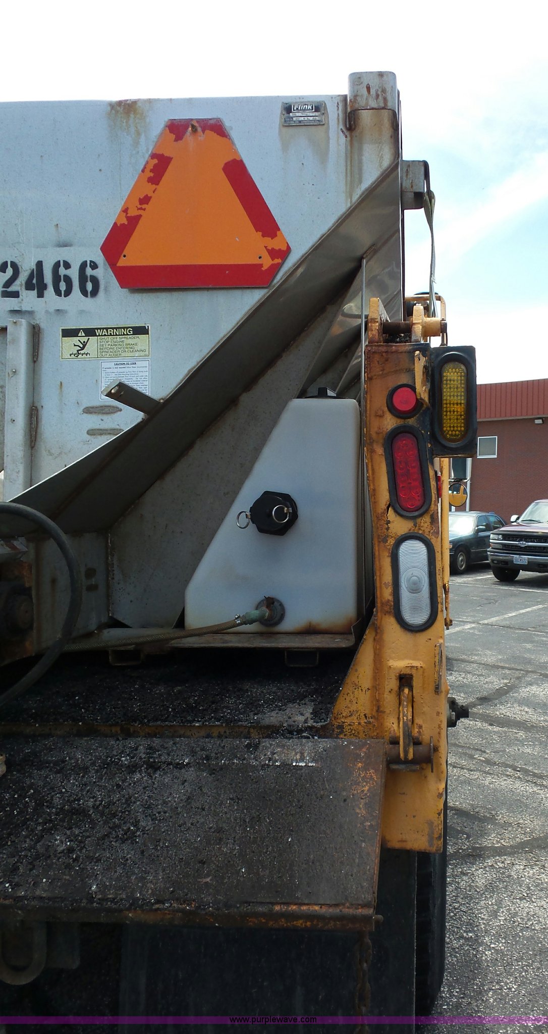 2001 International 4900 dump truck. 168,866 miles on odometer, 11,550 hours on meter, International DT466 7.6L L6 turbo diesel engine, Automatic transmission, Heat, Cruise, AM/FM, Heated mirrors, Air suspension seat, PTO, Steel dump bed 10'L x 8'W, 24" side height, Single ram hoist, Rollover tarp, Flink stainless steel spreader Four door, Snow plow 12'W, Wing plow 8'W, 206" wheelbase, Spring suspension, Air brakes, 11R22.5 tires, Power steering leak, Cab supports rusted, Carrier bearings and pinon seal bad, Bed rusted, Tie rods bent, MODOT ID 6378. Missouri title. 1HTSDAAR81H378640. Missouri Department of Transportation (MODOT). 600 NE Colbern Road. Lee's Summit, MO 64086