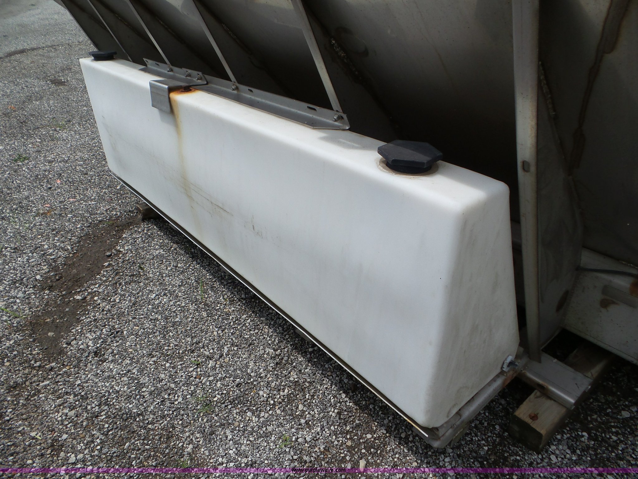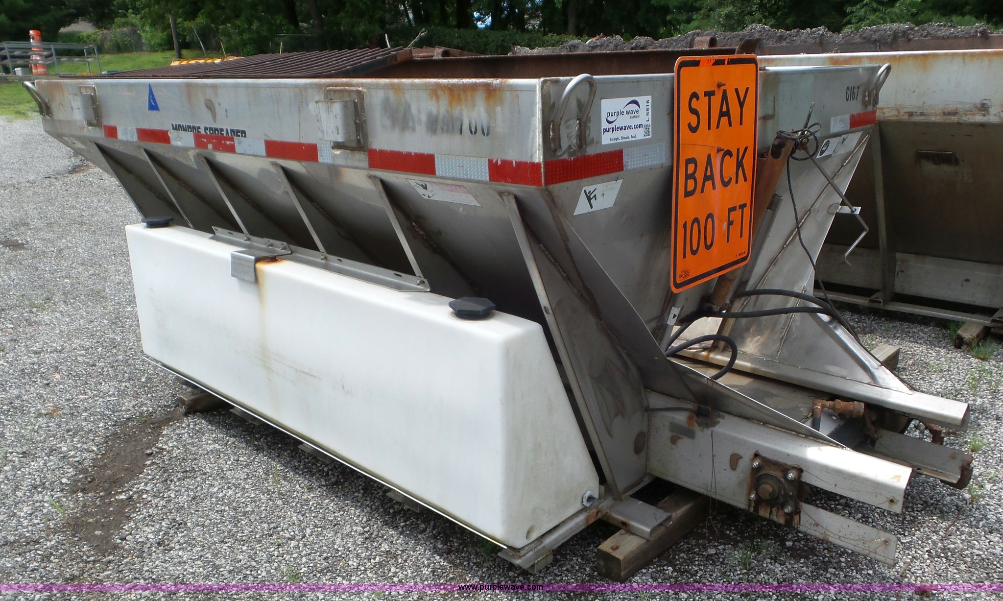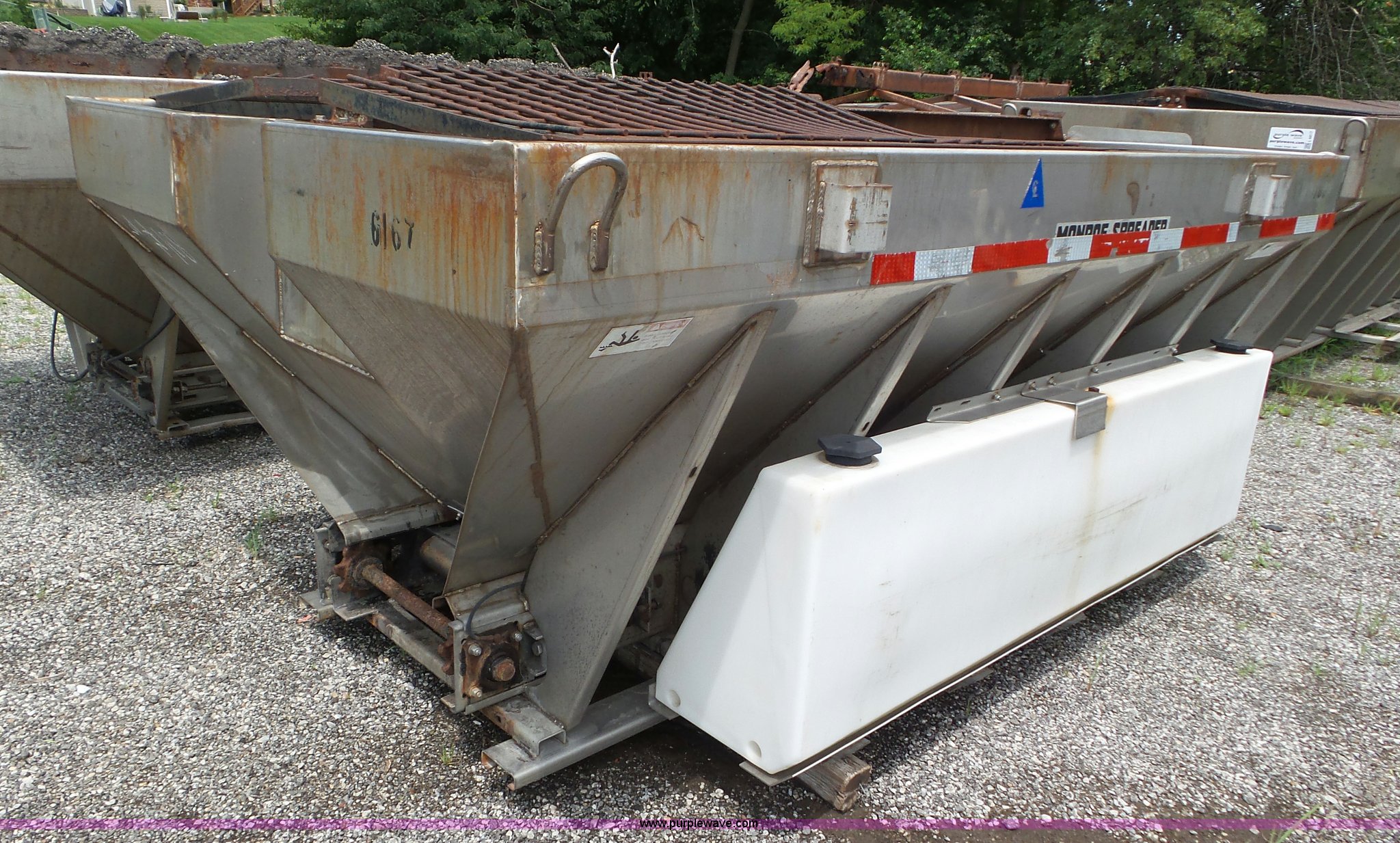 Purple Wave is selling a used Truck Part and Attach. in Missouri. This item is a Monroe stainless steel spreader with the following: 9'L x 78"W, (2) 100 gallon poly tanks, Chain and spinner wheel missing, MODOT ID 108