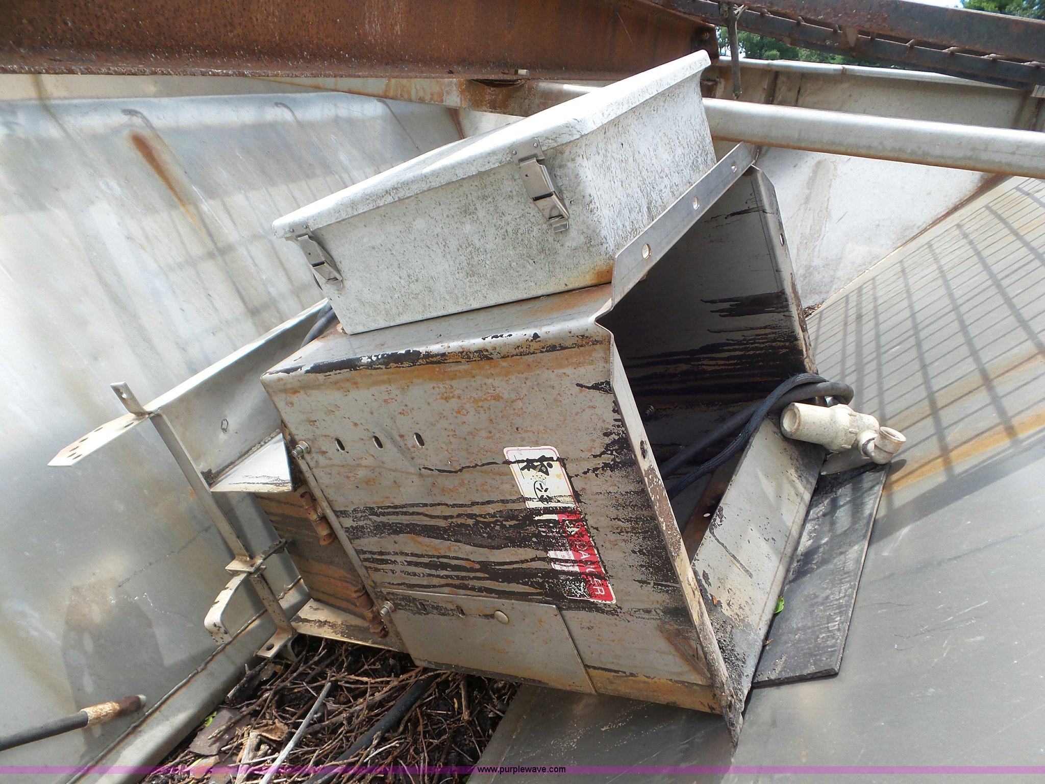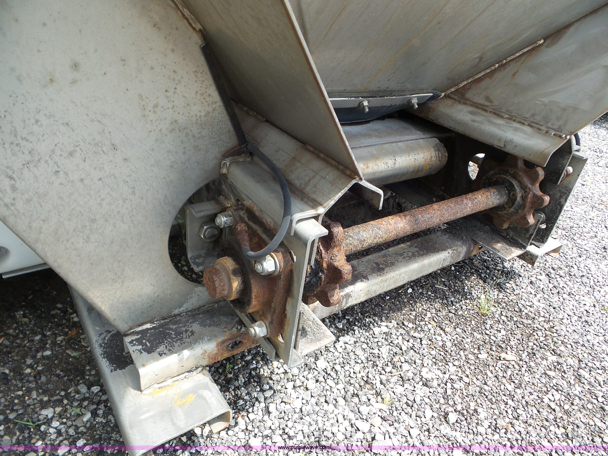 Monroe stainless steel spreader. 9'L x 78"W, (2) 100 gallon poly tanks, Chain and spinner wheel missing, MODOT ID 108. Missouri Department of Transportation (MODOT). 3602 N Belt Hwy. St. Joseph, MO 64506