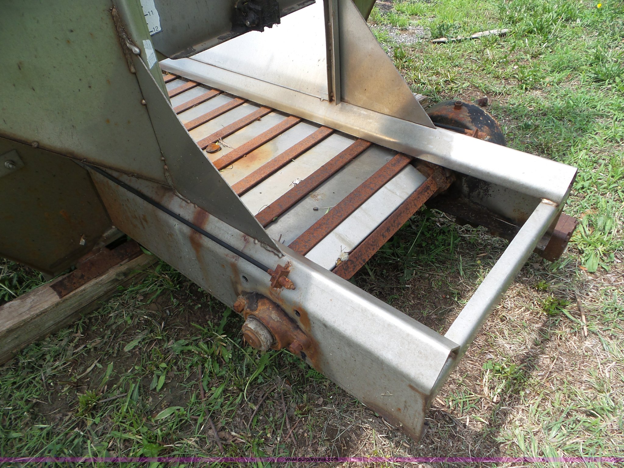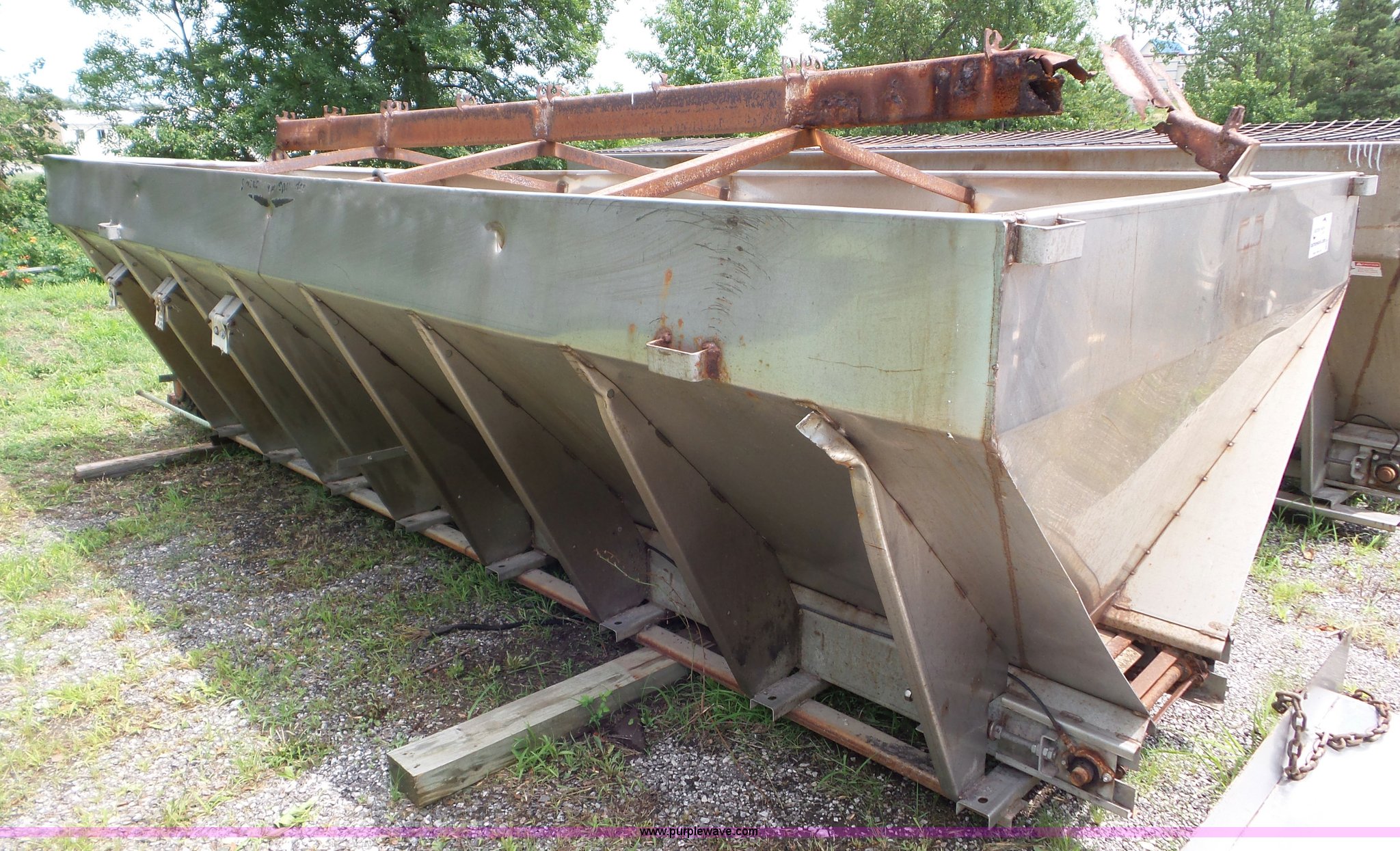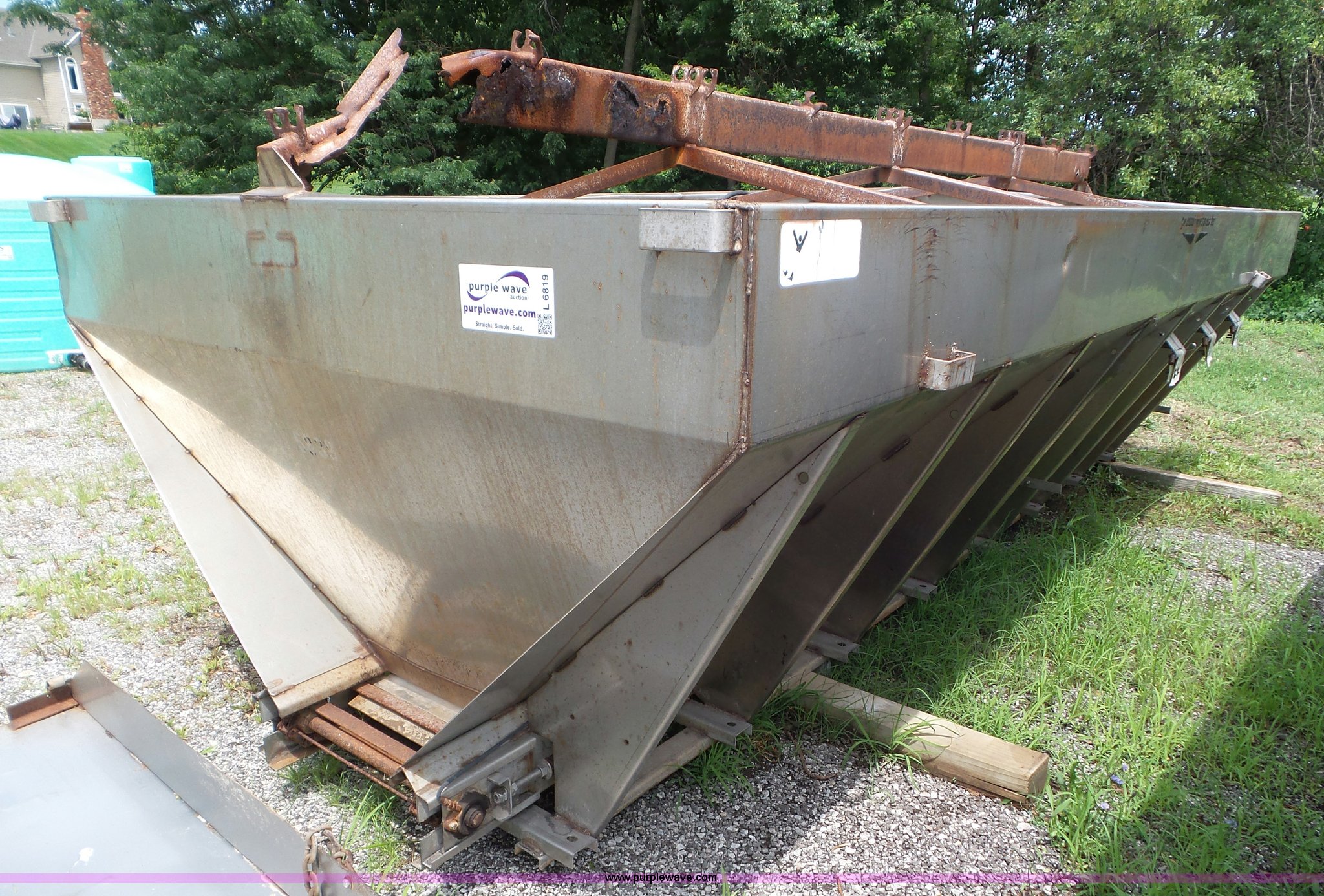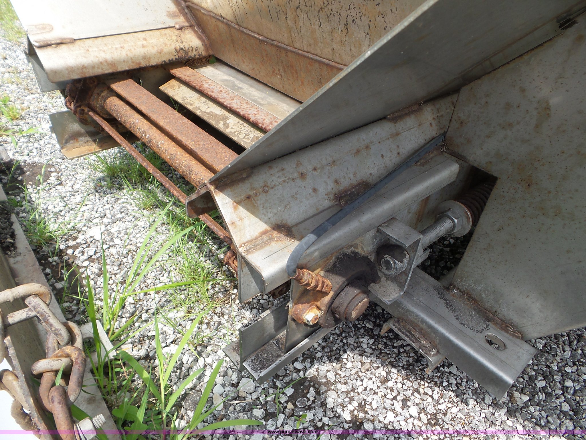 Swenson stainless steel spreader. 13'L x 78"W, 20" conveyor chain, Single metal spinner, Some parts missing, MODOT ID 42. Missouri Department of Transportation (MODOT). 3602 N Belt Hwy. St. Joseph, MO 64506