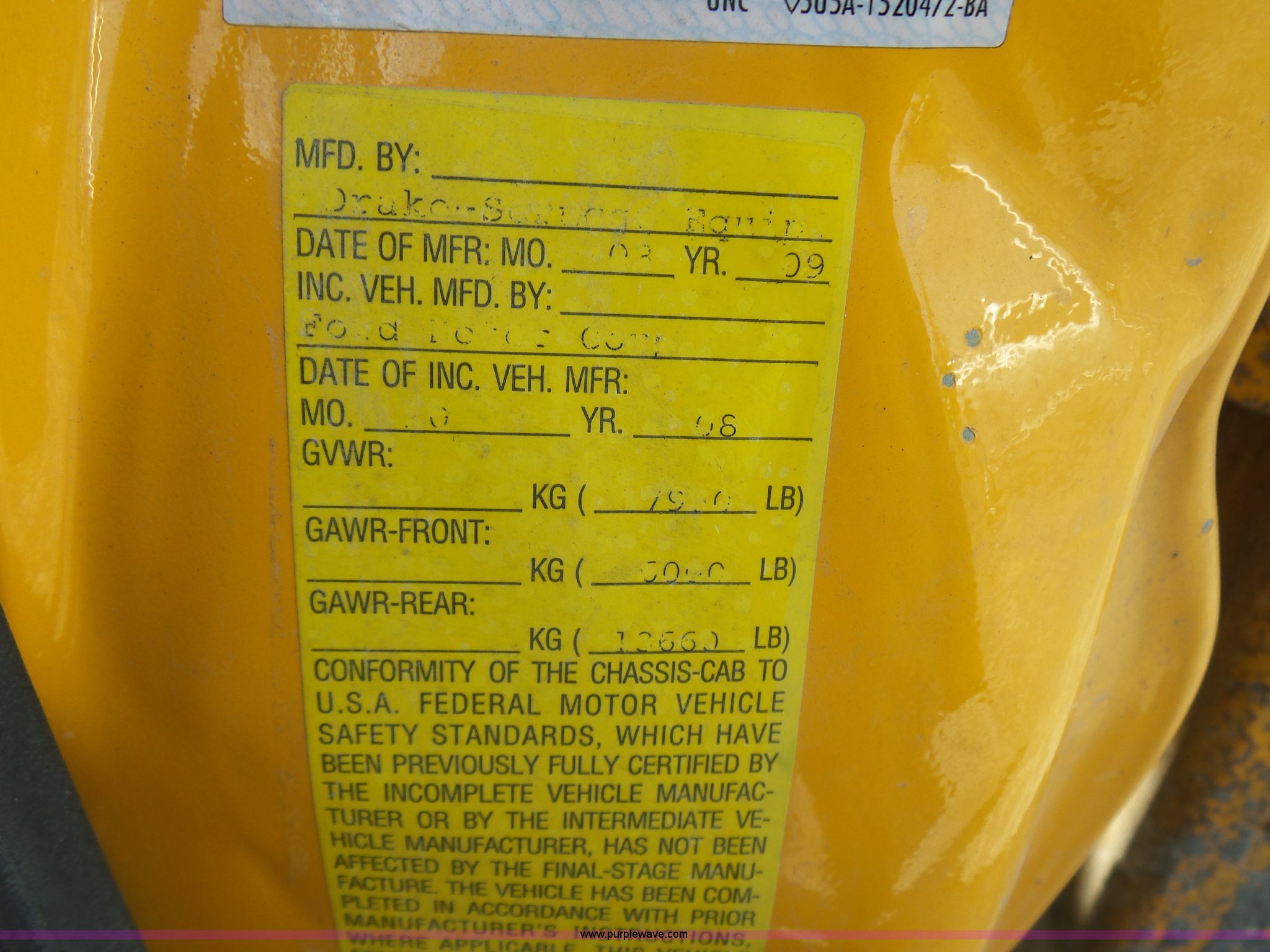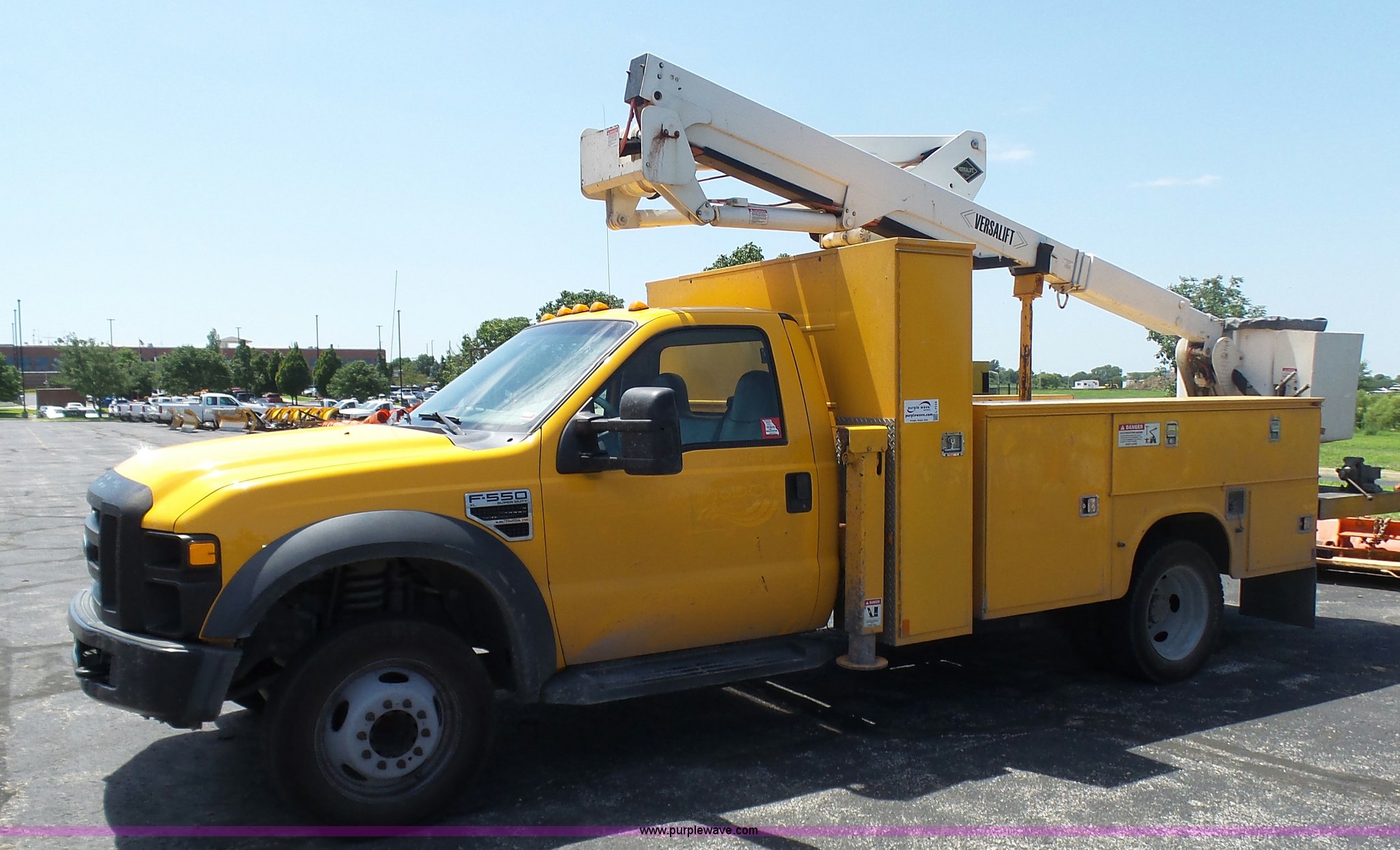 2009 Ford F550 Super Duty bucket truck. 203,100 miles on odometer, 6.8L V10 gas engine, Automatic transmission, Single axle, AC and heat, AM/FM/CD, Trailer brake controller, Front tow hooks, Knapheide 7108D54RJ service bed 9'L, Shelving, Slideout drawers, Utility rack, Street sign, Receiver hitch, Trailer wiring, 2008 Versalift JST371H01 boom 37' maximumm boom length, 350 lbs maximum lift capacity, Man basket Ground and platform controls, Boom rotation, Telescopic, articulated, insulated boom, Hydraulic outriggers, 6" vice, Single fuel tank, 165" wheelbase, Spring suspension, Hydraulic brakes, 225/70R19.5 tires, GVWR 17,950 lbs, Non-operational engine Oil drained, Drive shaft removed, Vehicle must be towed or hauled, MODOT ID G9445. Missouri title. 1FDAF56Y99EA10728. Missouri Department of Transportation (MODOT). 2050 NE Independance Ave. Lee's Summit, MO 64086
