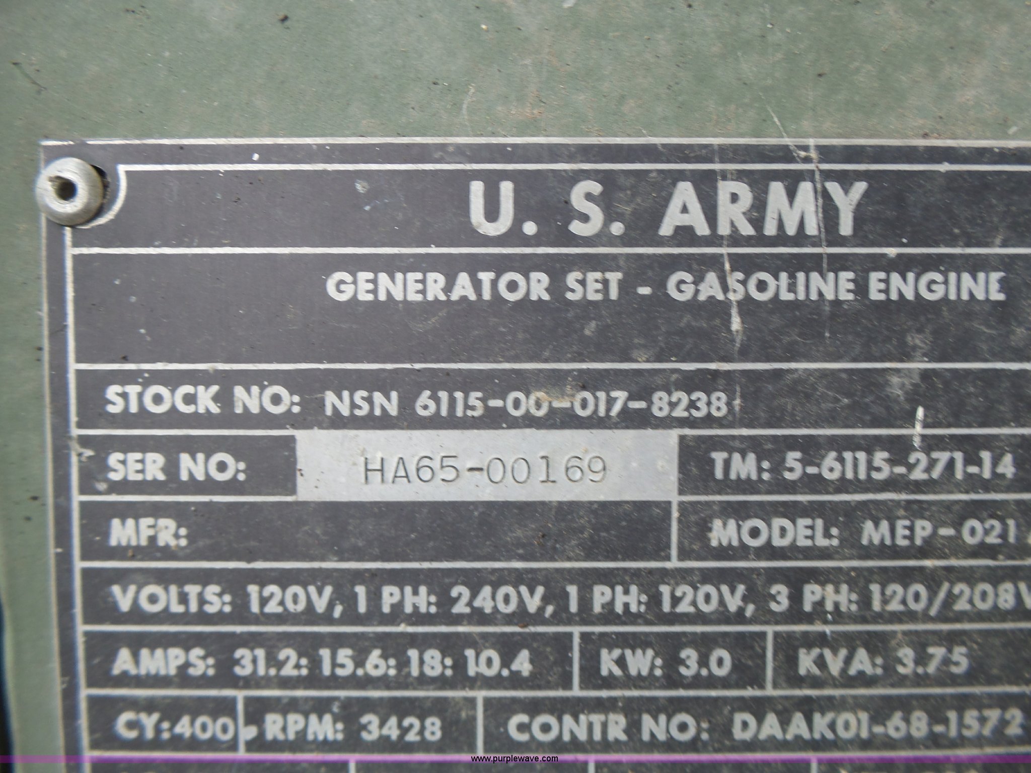 Purple Wave is selling a used Generator Set in Missouri. This item is a US Army generator with the following: 122 hours on meter, Wisconsin four cylinder gas engine, Unknown operating condition, Serial 6115-00-017-8238