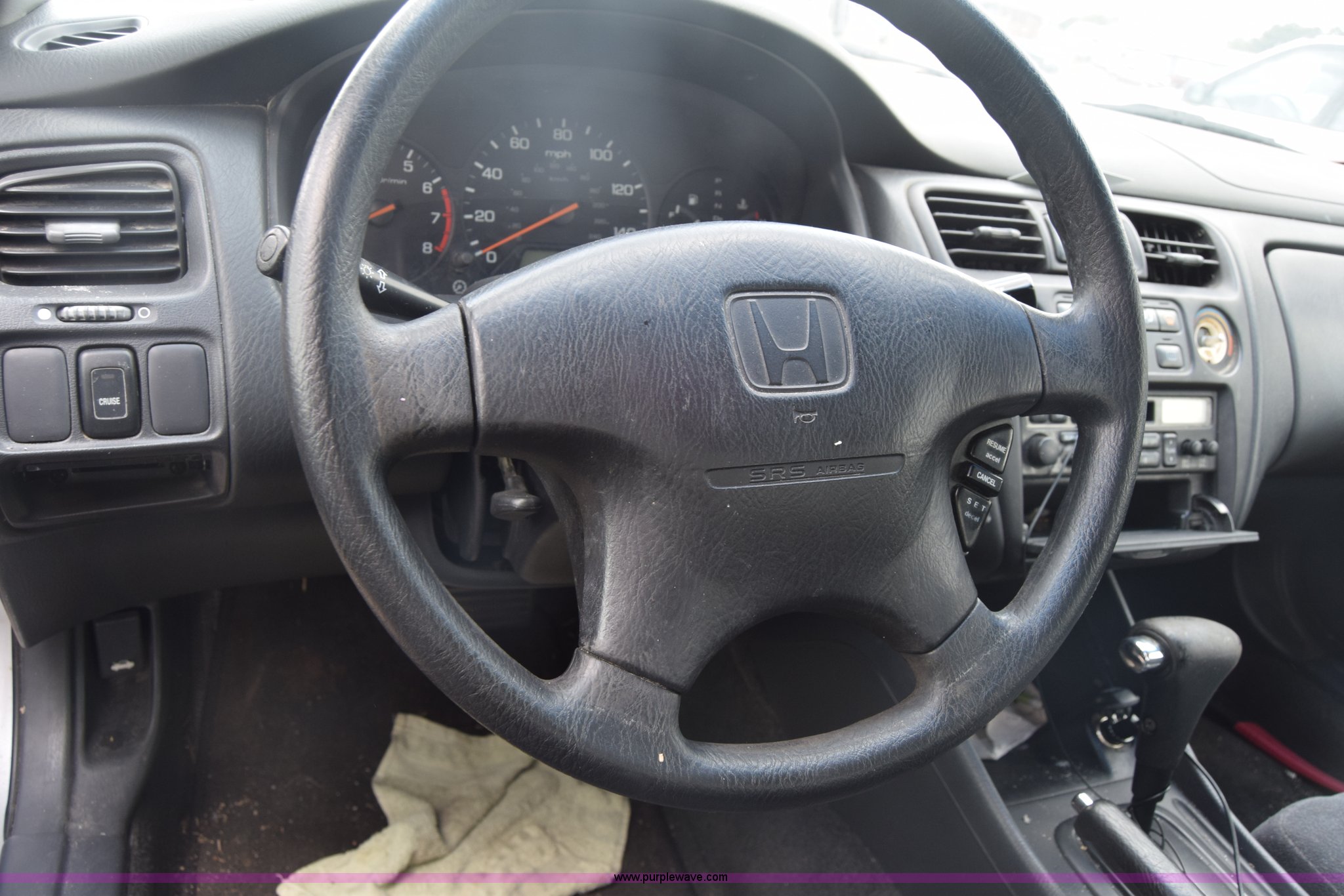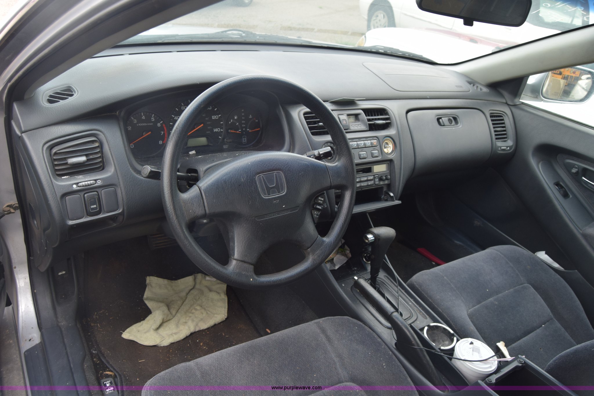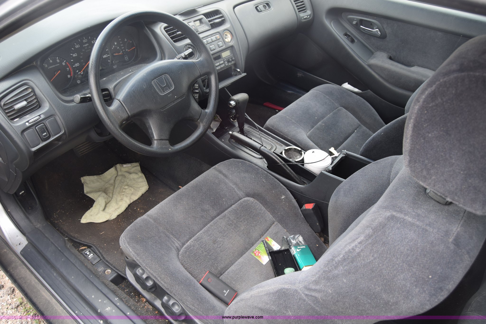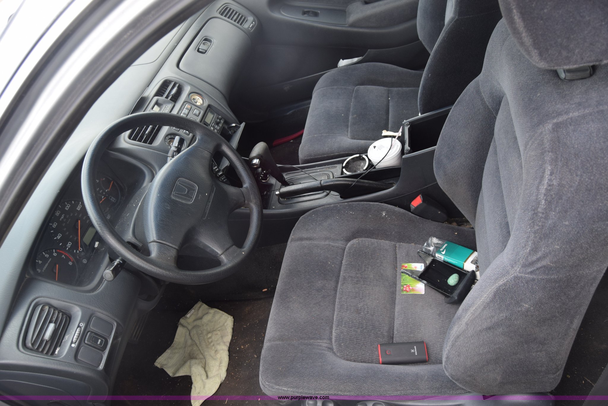 Purple Wave is selling a used Passenger Vehicle in Kansas. This item is a 1999 Honda Accord with the following: Unknown miles on odometer, 2.3L L4 SOHC 16V gas engine, Automatic transmission, AC and heat, AM/FM/CD, Power windows, locks, and mirrors, Cloth interior, 195/65R15 tires, Front end damage, Front bumper missing, Case# 16C031660