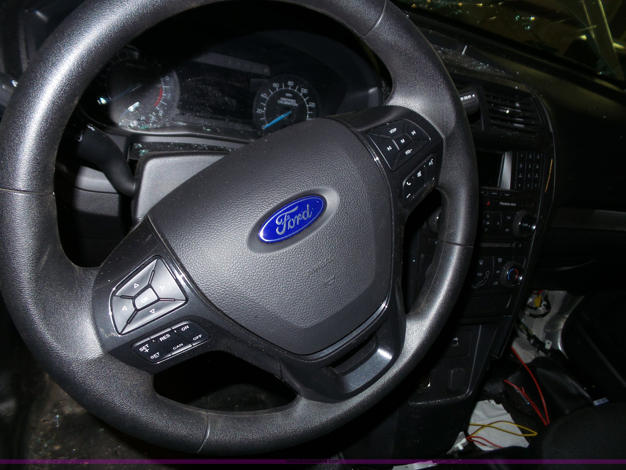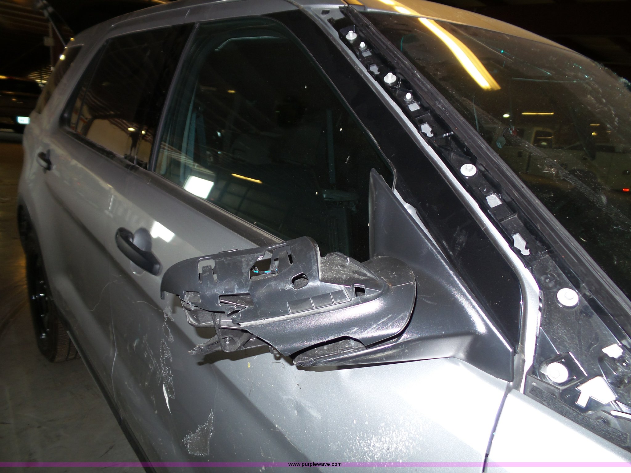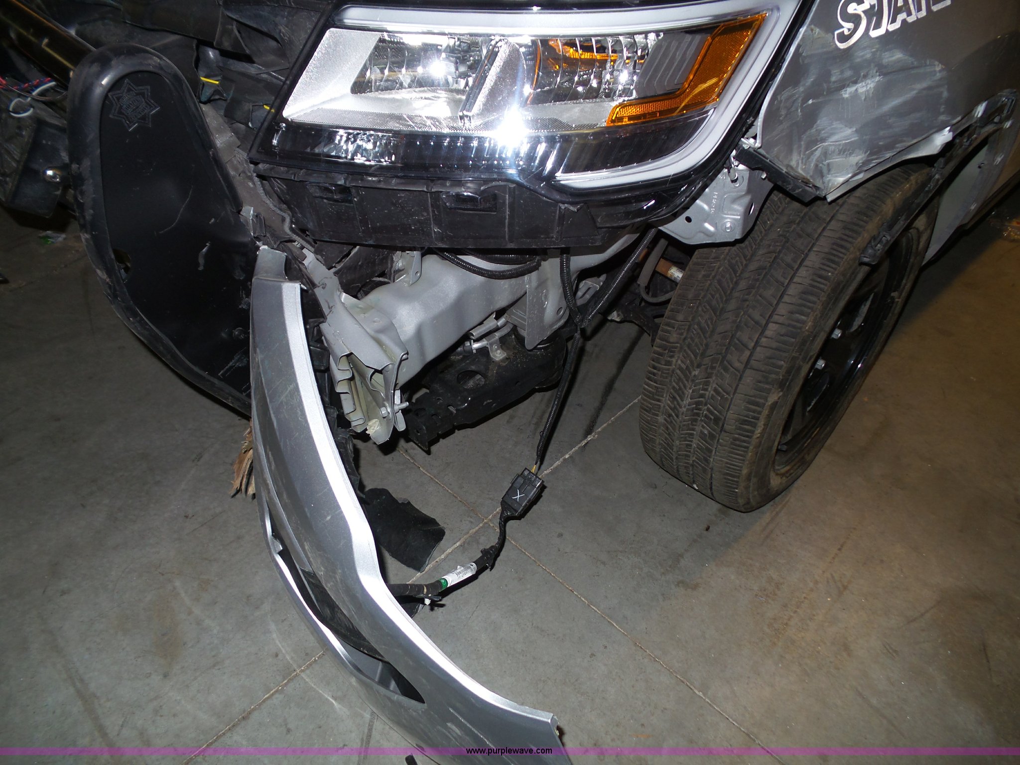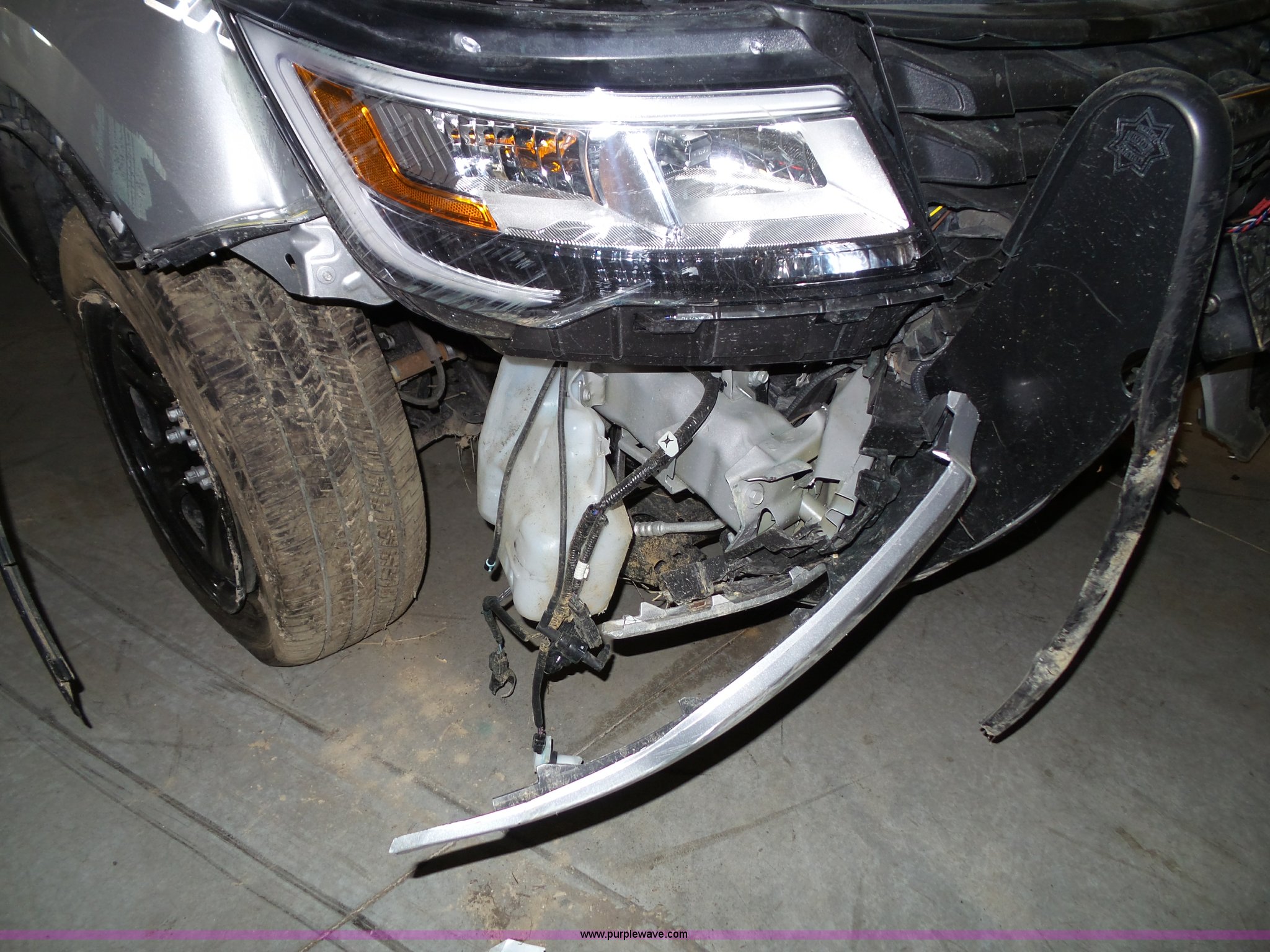 Purple Wave is selling a used Passenger Vehicle in Kansas. This item is a 2016 Ford Explorer Police SUV with the following: Unknown miles on odometer, Approx. 5,089 miles, 3.7L V6 DOHC 24V gas engine, Automatic transmission, Four wheel drive, AC and heat, Tilt, Cruise, AM/FM/CD, Power windows, locks, mirrors, and seat, Cloth interior, 245/55R18 tires, Some tires flat, Broken windshield, Wrecked, Unit must be towed, Unit# 16-575
