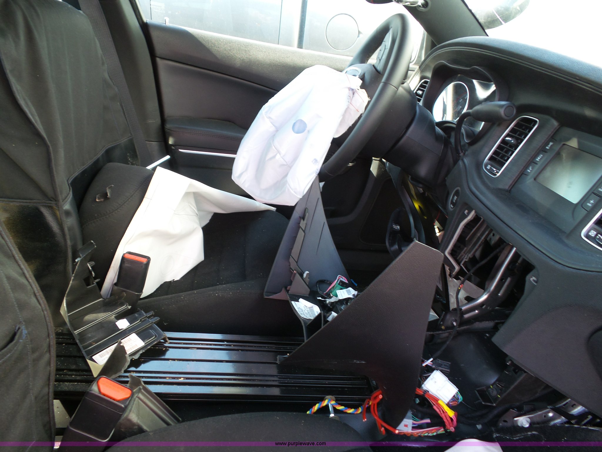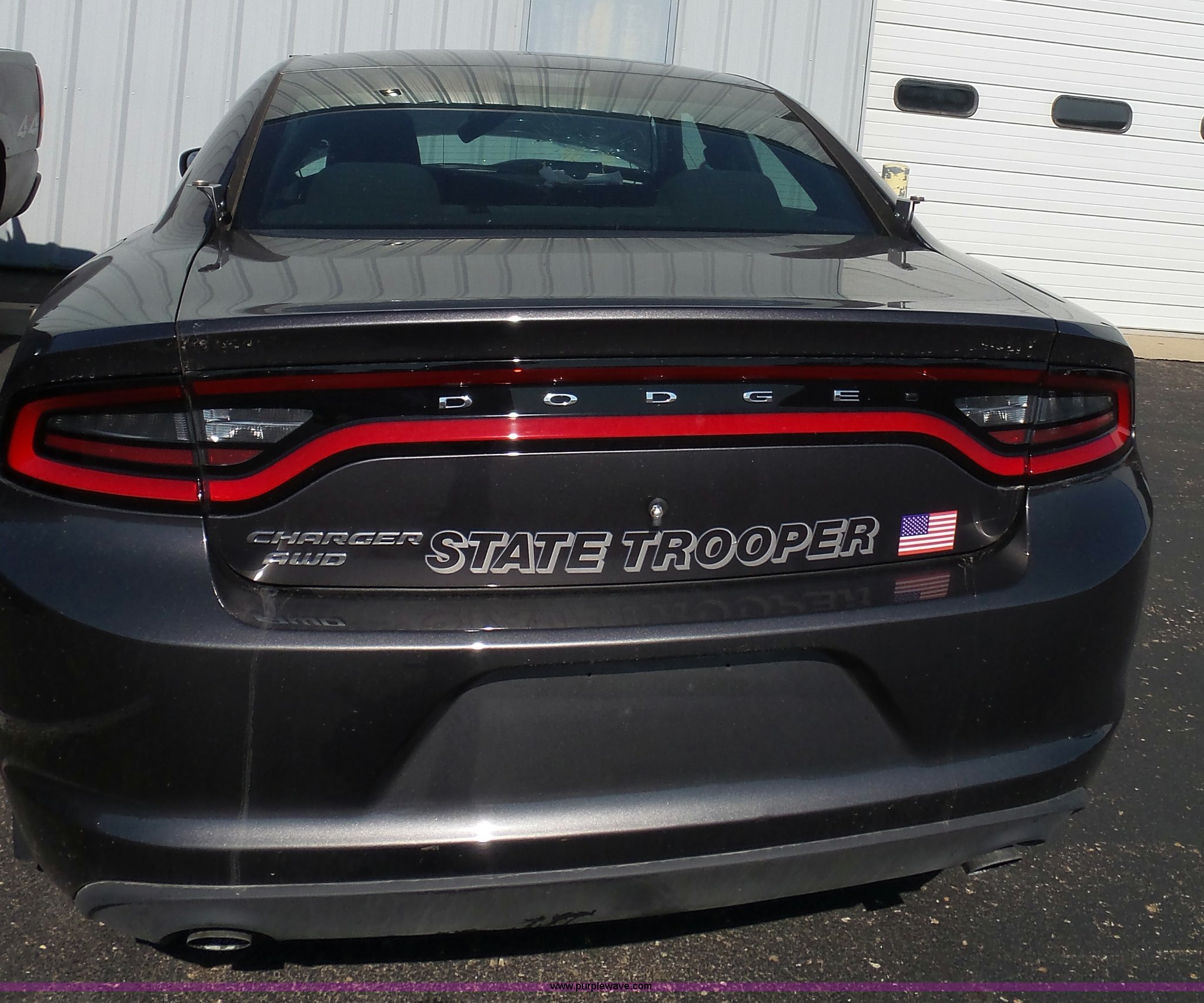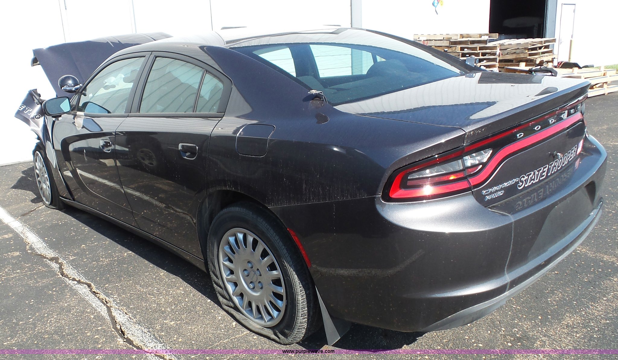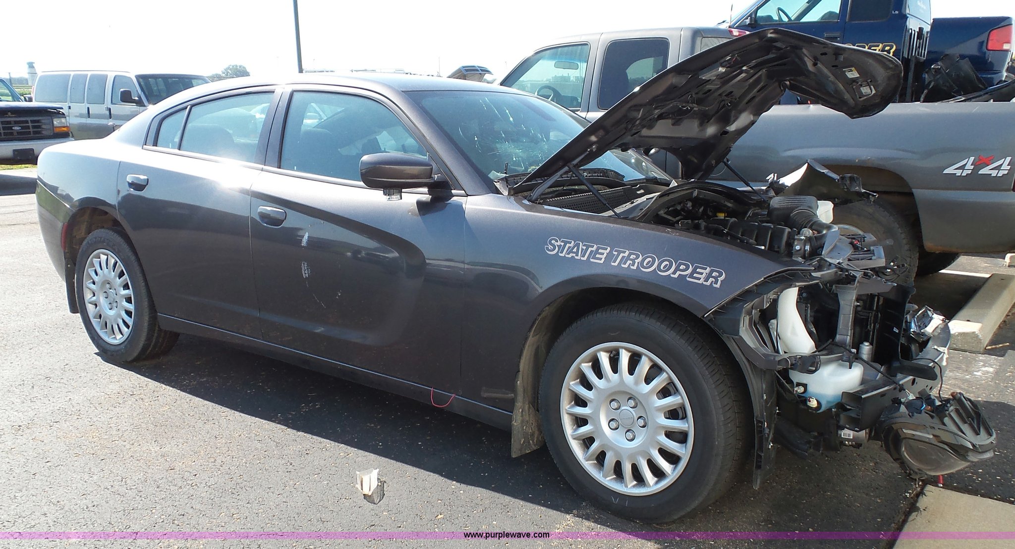 Purple Wave is selling a used Passenger Vehicle in Kansas. This item is a 2015 Dodge Charger Police with the following: Unknown miles on odometer, Last reported mileage 2,647 miles, 5.7L V8 OHV 16V gas engine, Automatic transmission, All wheel drive, Tilt, Power windows, locks, and mirrors, Heated mirrors, Cloth interior, Spotlight, 225/60R18 tires, (2) tires blown, Cracked windshield, Wrecked, Unit must be towed, Unit# 15-475