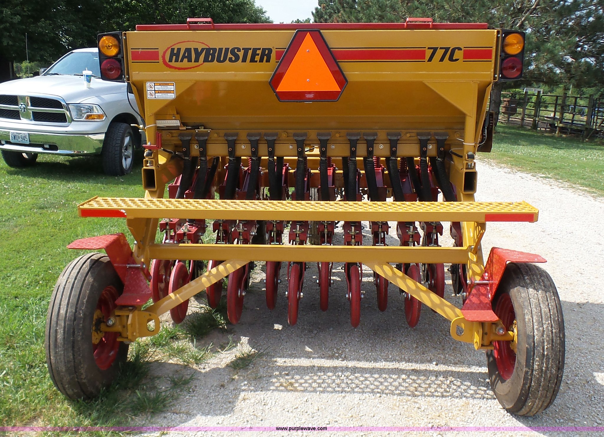 Purple Wave is selling a used Grain Drill or Seeder in Missouri. This item is a HayBuster 77C no-till grain drill with the following: 93 acres on meter, 7'W, 12 rows, 7" row spacing, Bulk fill, Mechanical delivery, Mechanical meters, Ground meter drive system, Double disk openers, Extra down pressure springs, No-till coulters, Packer wheel closing system, Dry fertilizer, 750 lbs capacity, Disk opener application, Light kit, Pin hitch, 9.5L-14 front tires, 7.00-15 rear tires, Additional legume box, (2) additional seed boxes, Serial 77130633C