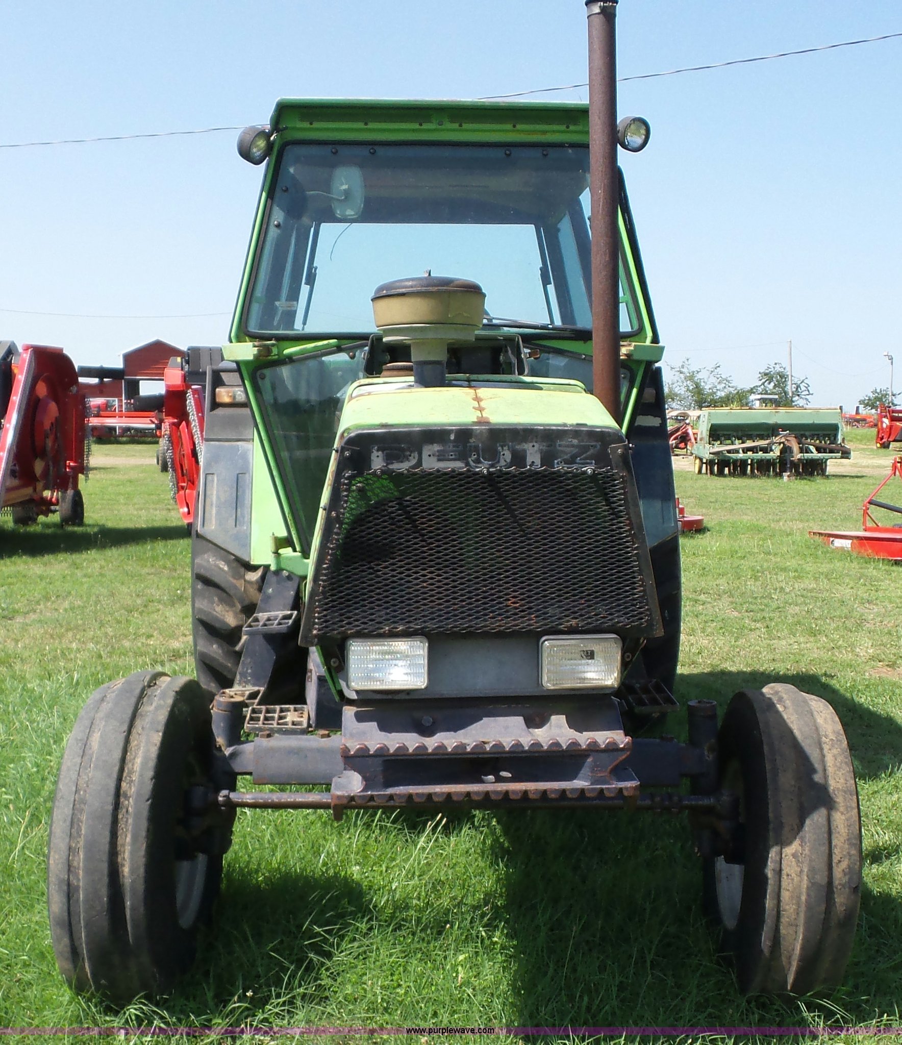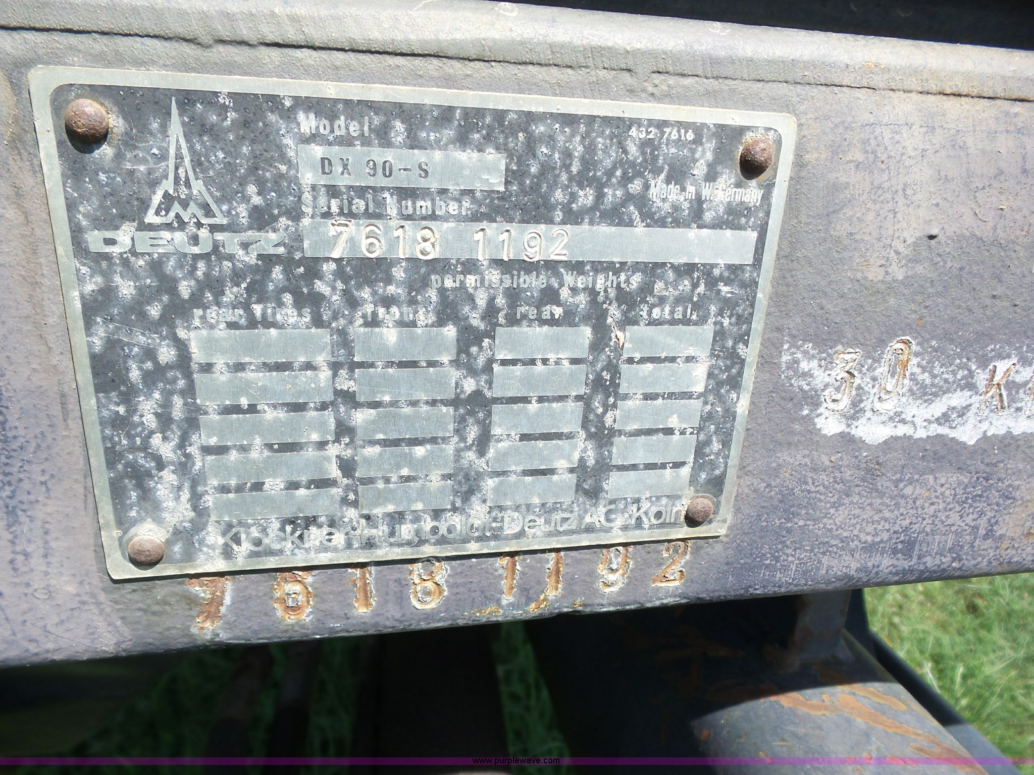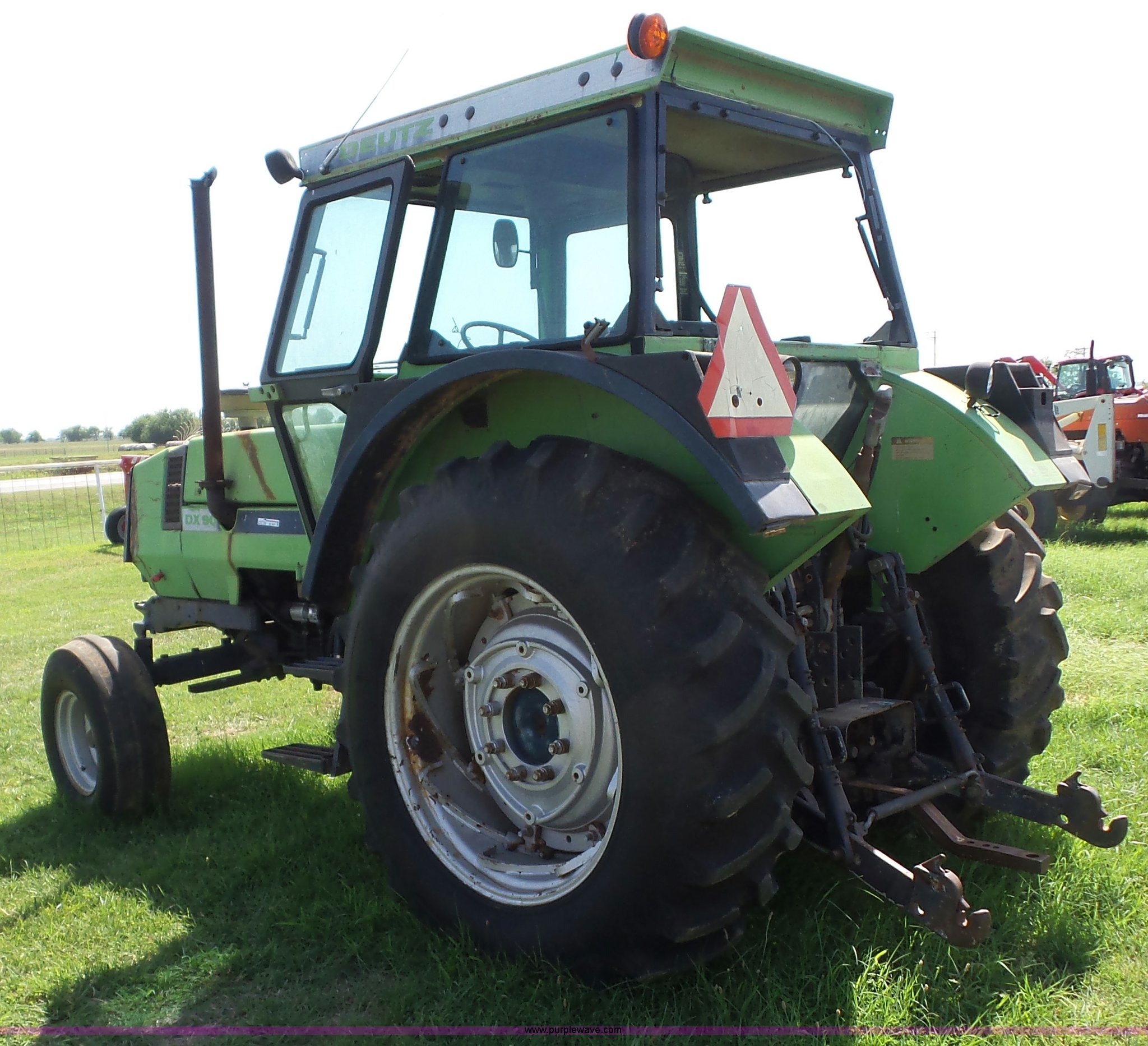 Purple Wave is selling a used Tractor in Oklahoma. This item is a 1979 Deutz Fahr DX90 tractor with the following: 8,037 hours on meter, Deutz 4.7L five cylinder diesel engine, Manual transmission, 15F-5R gears, Differential lock, AC and heat, Non-operational AC, AM/FM, Suspension seat, Three point, Top link, Quick attach, 540/1000 PTO, (2) rear hydraulic remote sets, 10.00-16 front tires, 16.9-34 rear tires, Serial 76181192