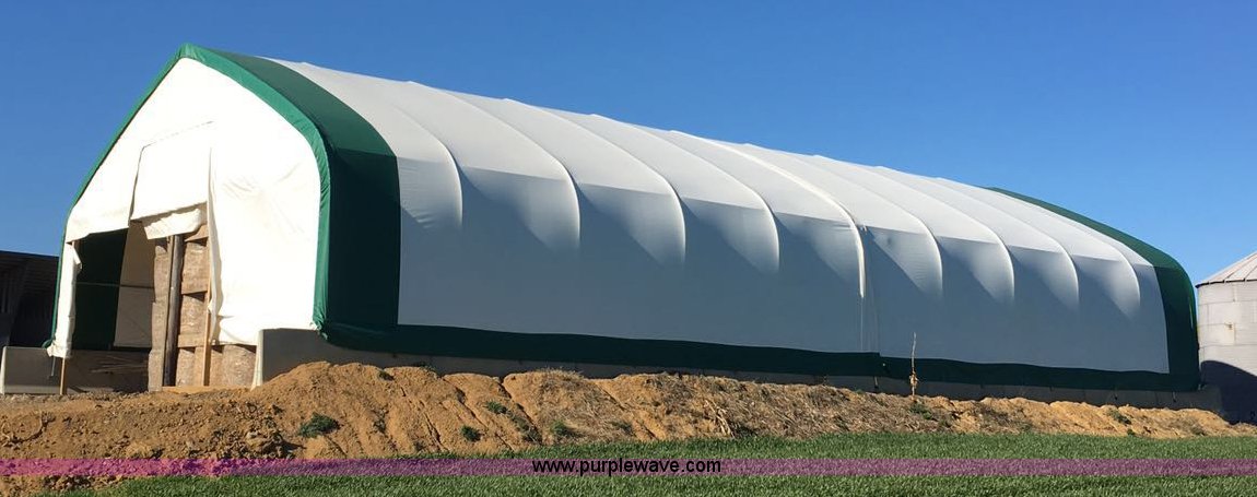 Purple Wave is selling a used Building Materials in Kansas. This item is a 40' x 60' x 21' double truss storage building with the following: Green caps, 13'W x 13'H drive through doors, Base plates with mounting pegs, Double trussed frame design, Galvanized finish all steel frame, Roll up mechanical door on both ends, Ratchet strap for drum tight fit, Anchoring system, 26.5 oz PVC fabric backed fabric, Instructions included, Unused, Ships in four steel crates