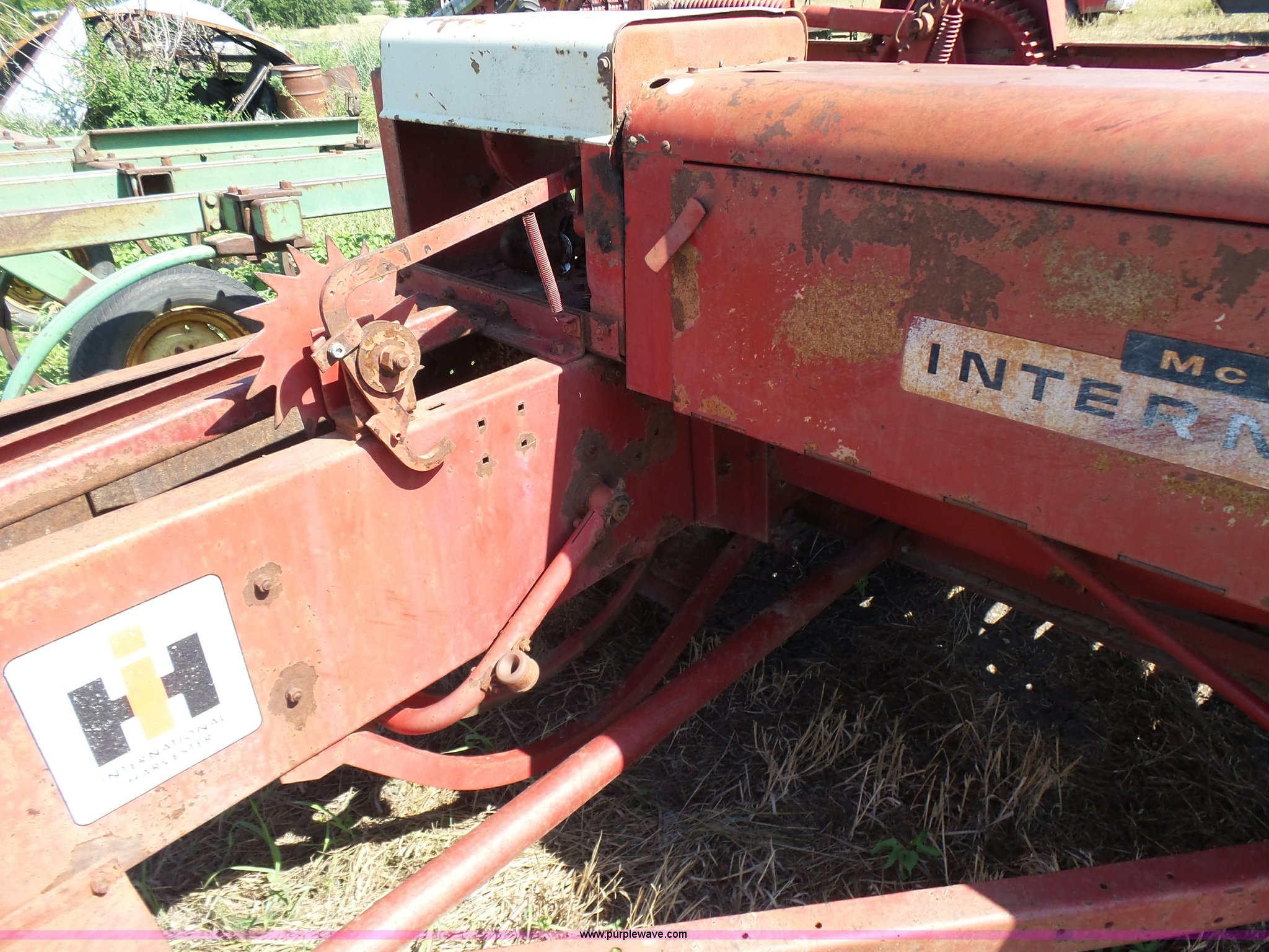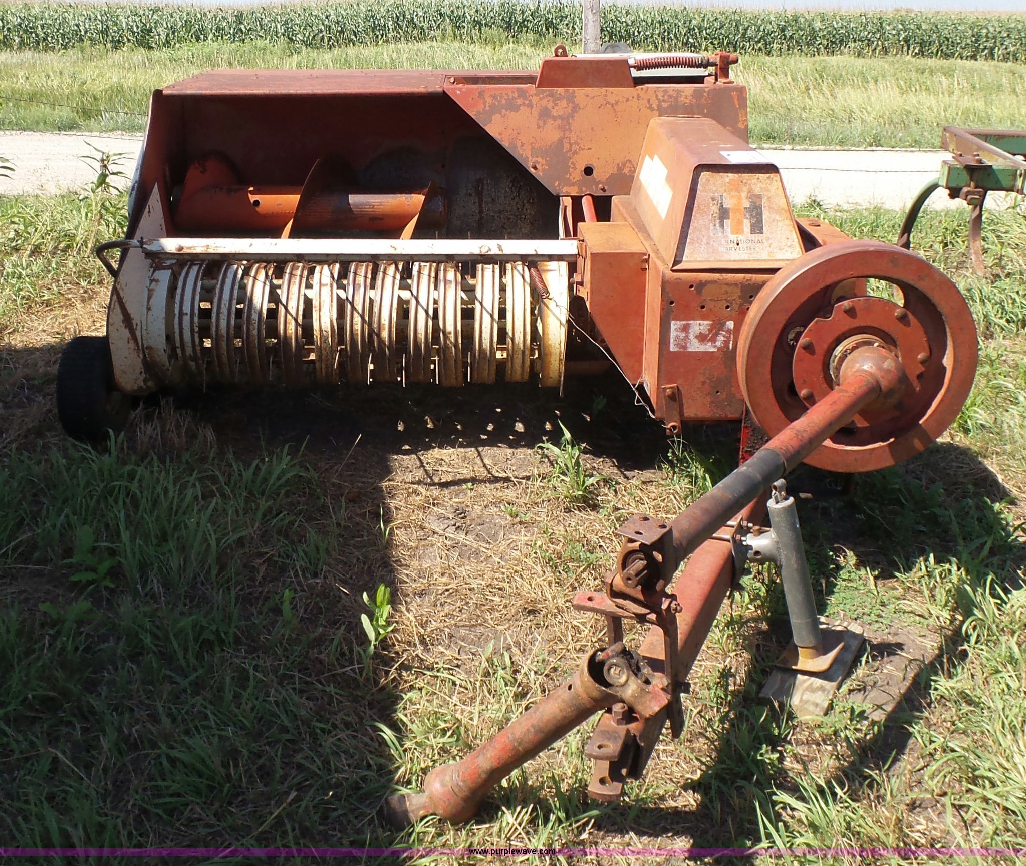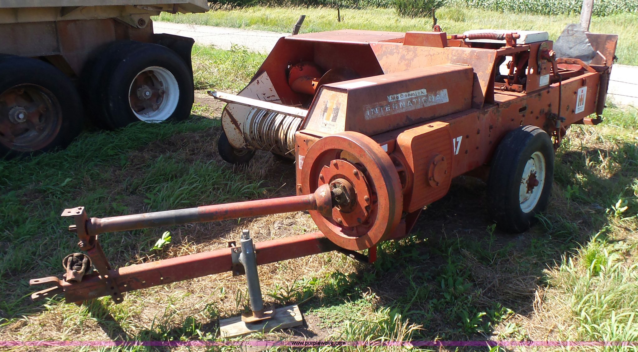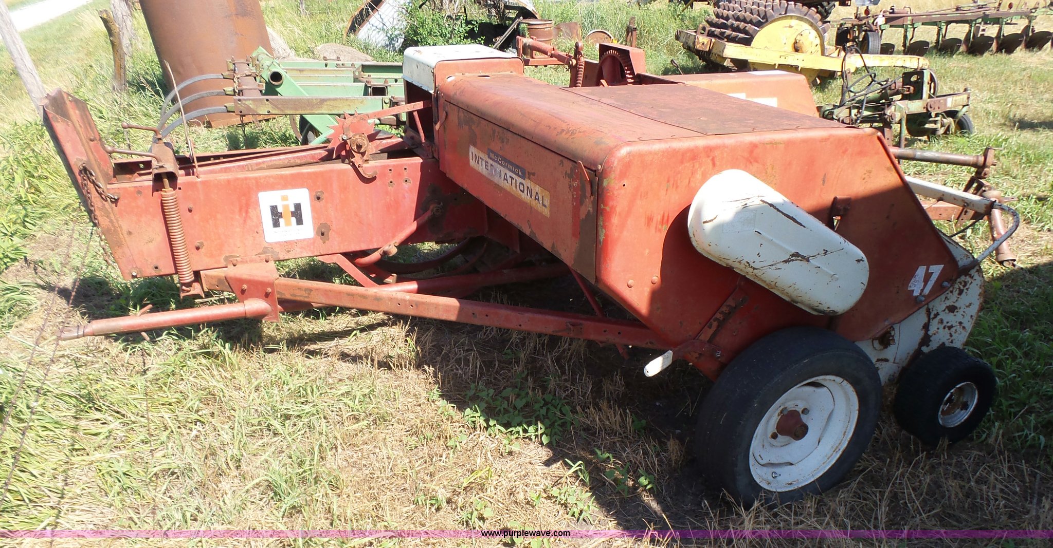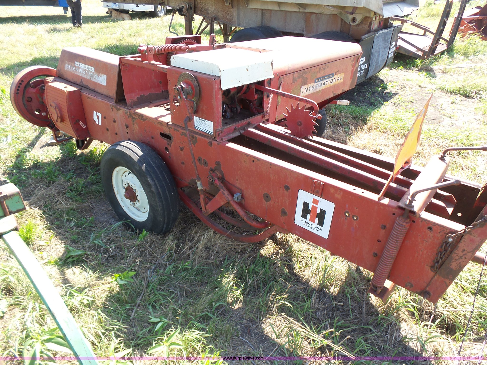 Purple Wave is selling a used Square Baler in Kansas. This item is a International 47 small square baler with the following: 50"W pickup, Twine tie, 540 PTO, Pin hitch, Rear pin hitch, 15" tires, Serial 12234