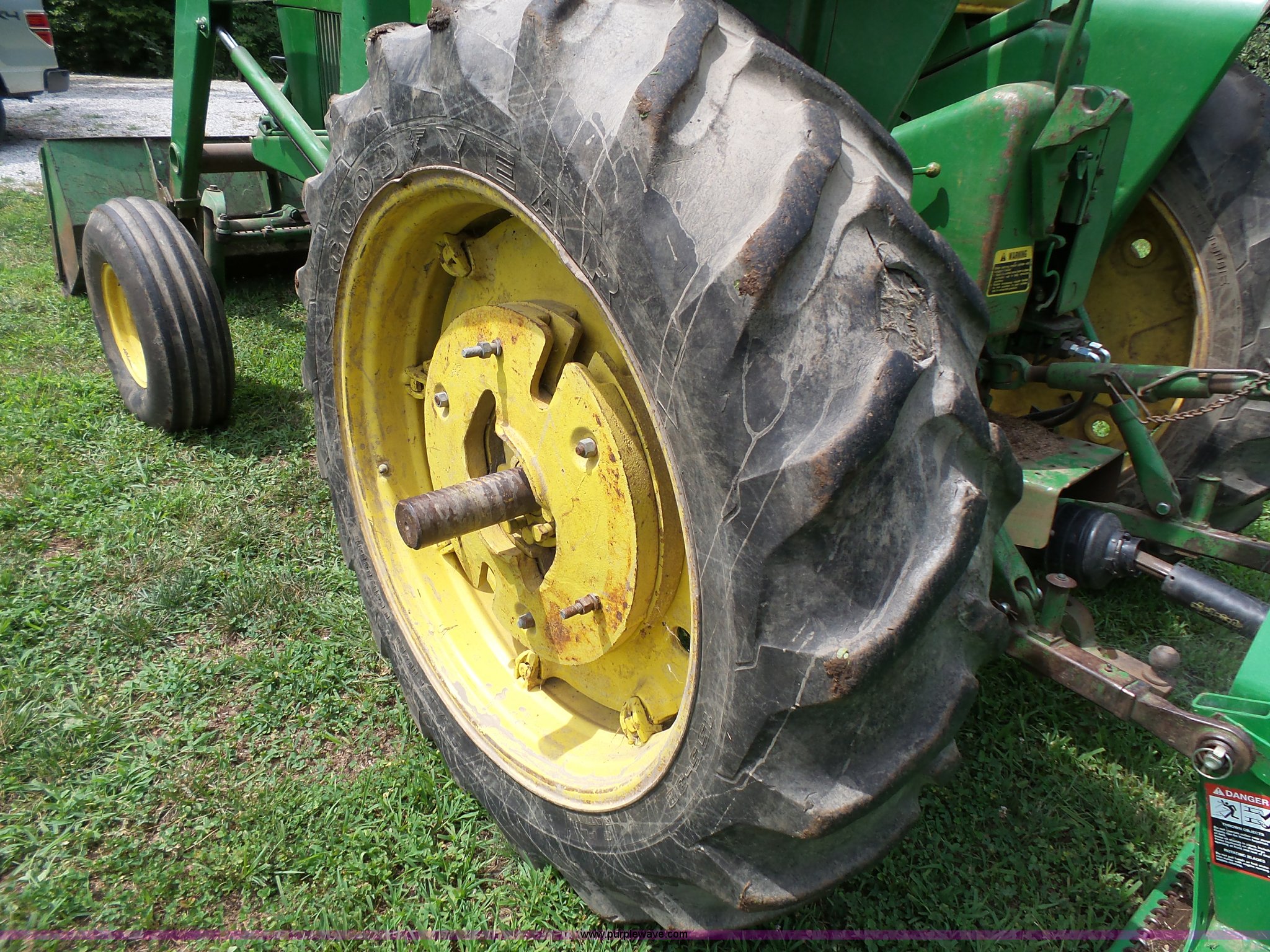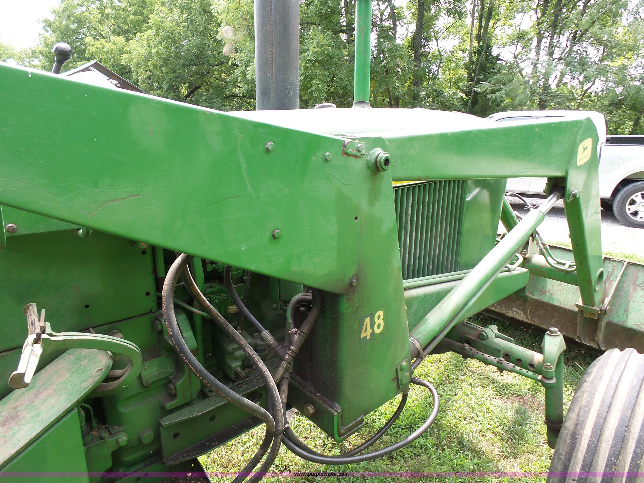Purple Wave is selling a used Tractor in Kansas. This item is a 1962 John Deere 3010 tractor with the following: 6,815 hours on meter, 4.2L four cylinder diesel engine, Synchro transmission, 8F-3R gears, John Deere 48 loader, 73"W bucket, Bale spear, Two-lever controls, Three point, 540 PTO, (4) wheel weights, 10.00-16 front tires, 15.5-38 rear tires, Additional 6.50-16 front tires, Serial 32980
