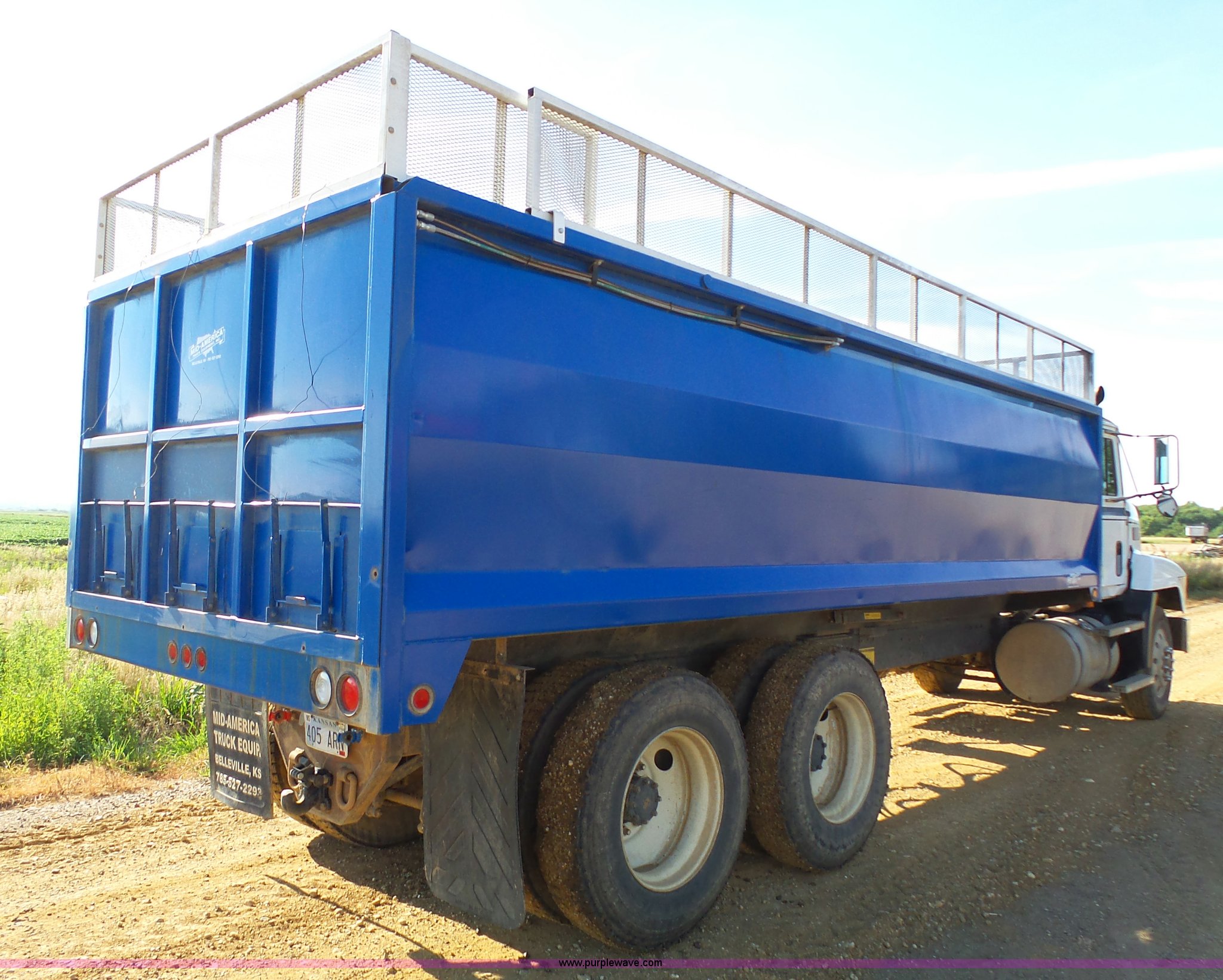 Purple Wave is selling a used Grain Truck in Kansas. This item is a 1991 Mack CH613 silage/grain truck with the following: 62,229 miles on odometer, Actual mileage unknown, Mack E7 12.0L L6 diesel engine, 350 HP, Mack Maxitorque 10 speed manual transmission, Tandem axle, AC and heat, Tilt steering wheel, AM/FM, Air suspension seats, Air ride cab, PTO, Mid-America silage bed, 22'L x 101"W, 56" side height, Grain doors, Hydraulic end gate, Dual fuel tanks, Pintle hitch, Air suspension, Air brakes, 11R24.5 tires, Two-way radio not included