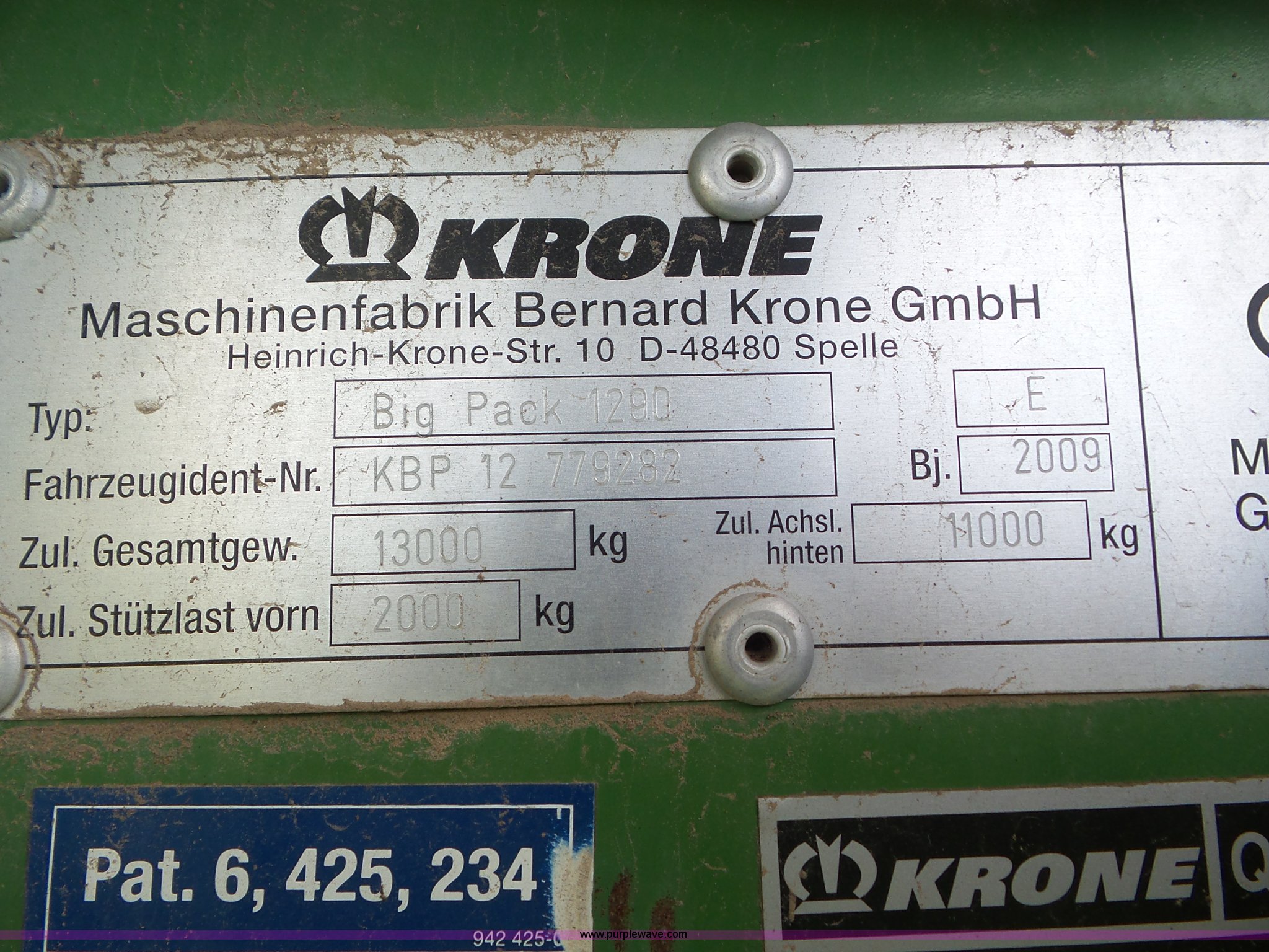 Purple Wave is selling a used Square Baler in Kansas. This item is a 2009 Krone Big Pack 1290 large square baler with the following: 25,000 bales on counter, 3' x 4' bale capacity, 7'W pickup, Hydraulic pickup lift, Feed assist roller, Monitor, Knotters, Twine tie, Bale roller chute, Auto lube system, Transport lights, Large 1000 PTO, Pin hitch, Tandem axle, 500/55-20 tires, Serial KBP12779282