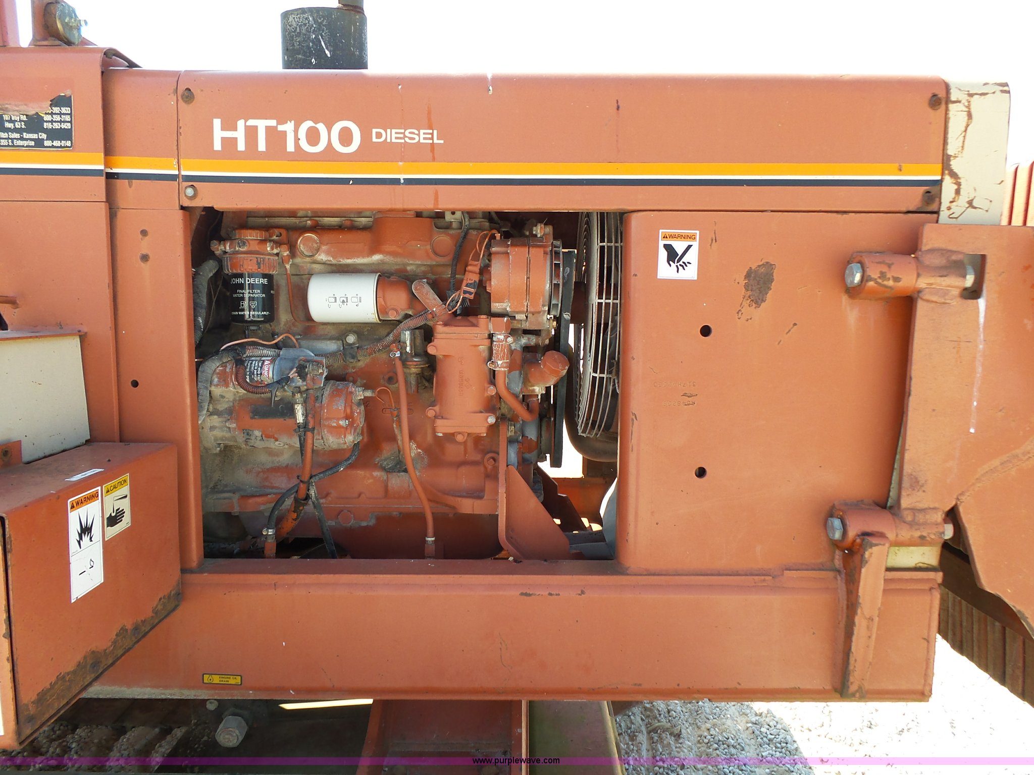1995 Ditch Witch HT100 rock saw. 1,576 hours on meter, John Deere four cylinder turbo diesel engine Serial T04045T500845, Hydrostatic transmission, OROPS, Front work lights, 7'3" diameter rock wheel Model H840, 36" cutting depth, 6" cutting width, Serial 2M1620, Four speed attachment drive with reverse, (36) suitcase weights, (7) bottom rollers, 20"W single grouser track pads, Serial 6M0062. Vermeer Great Plains. 6260 Highway 60. Brookline, MO 65619