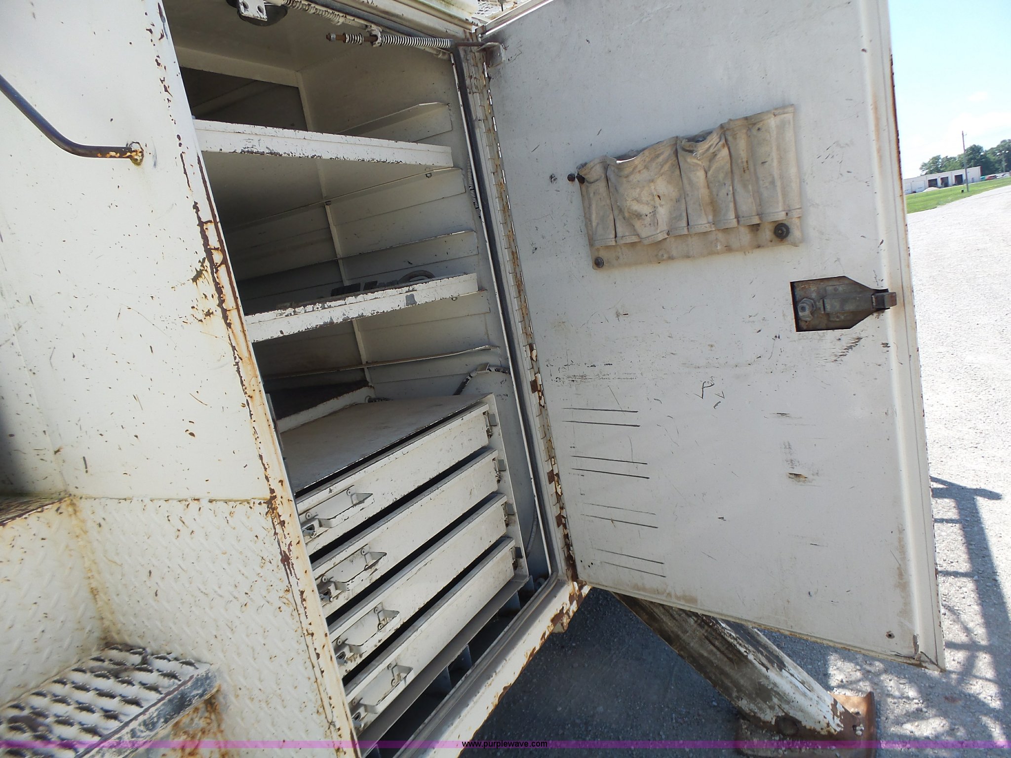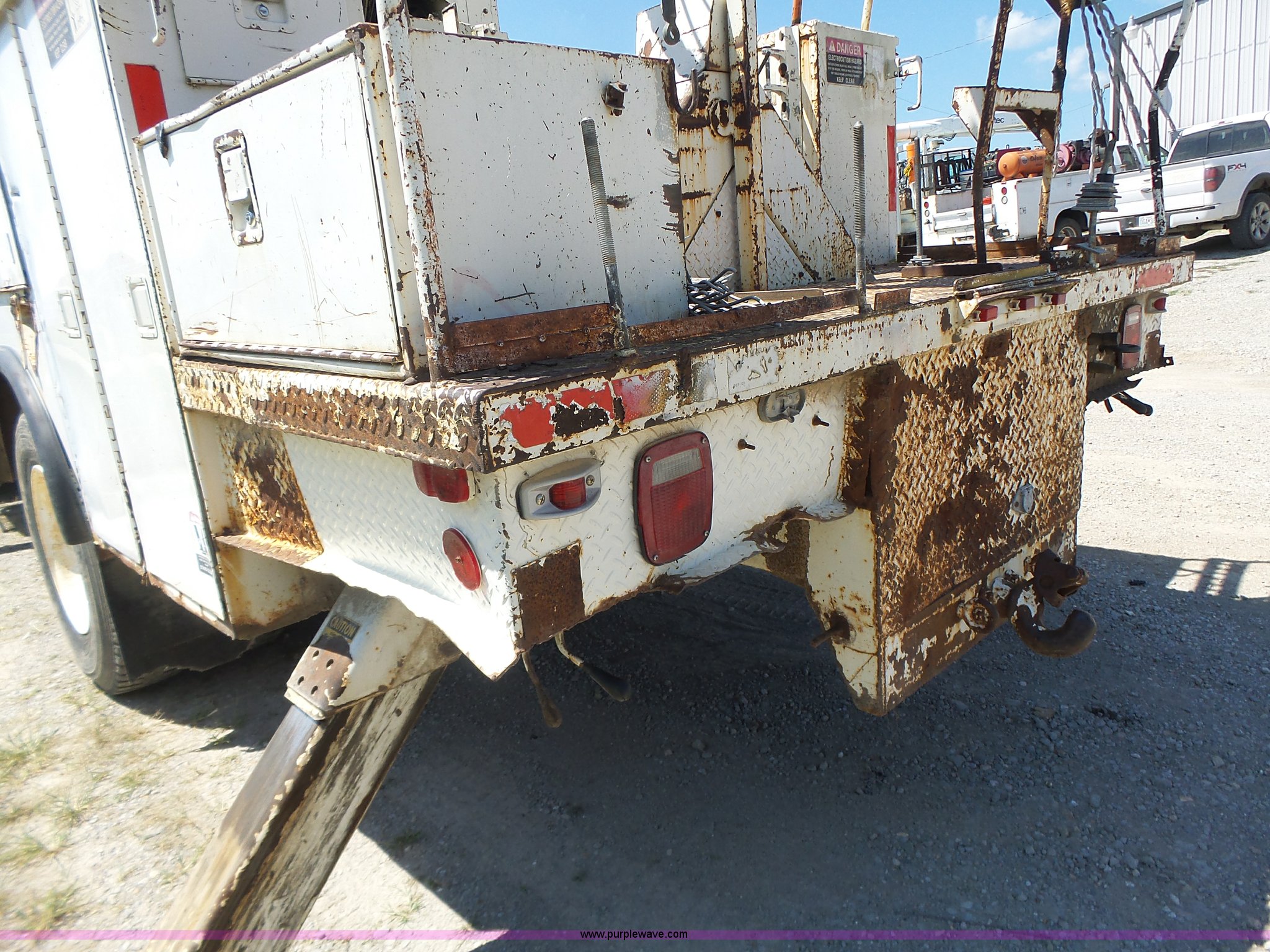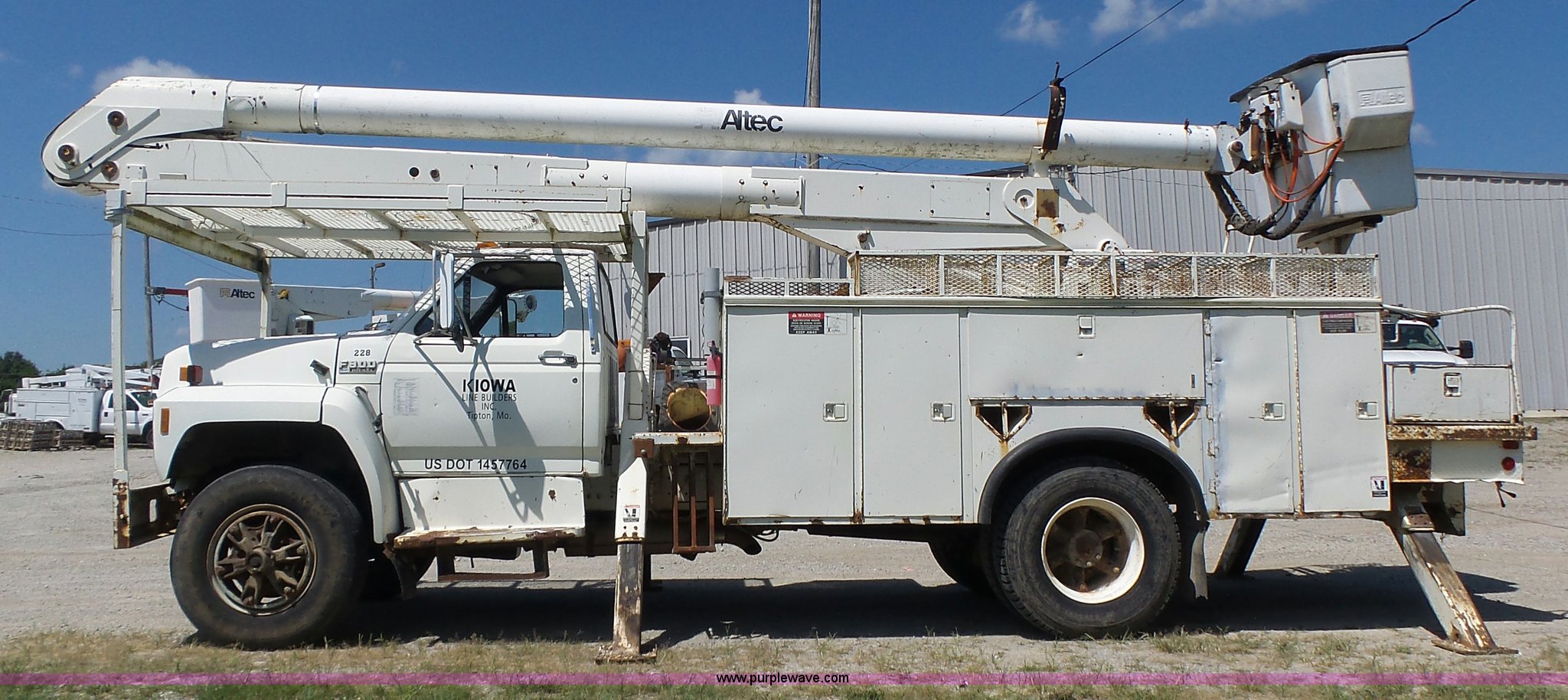 Purple Wave is selling a used Bucket Truck in Missouri. This item is a 1993 Ford F800 bucket truck with the following: 97,121 miles on odometer, Cummins ISC 8.3L L6 turbo diesel engine, Automatic transmission, Single axle, Heat, AM/FM, Spring suspension seat, PTO, Altec service bed, Shelving, Slide-out drawers, Compartment lights, Pintle hitch, Serial 37-63756, Altec AA755 boom, 55.8' maximum lift capacity, Man basket, Ground and platform controls, Bucket rotation, Boom rotation, Articulating insulated boom, Single fuel tank, Spring suspension, Air brakes, 11R22.5 tires, GVWR 33,200 lbs, CB radio is not included