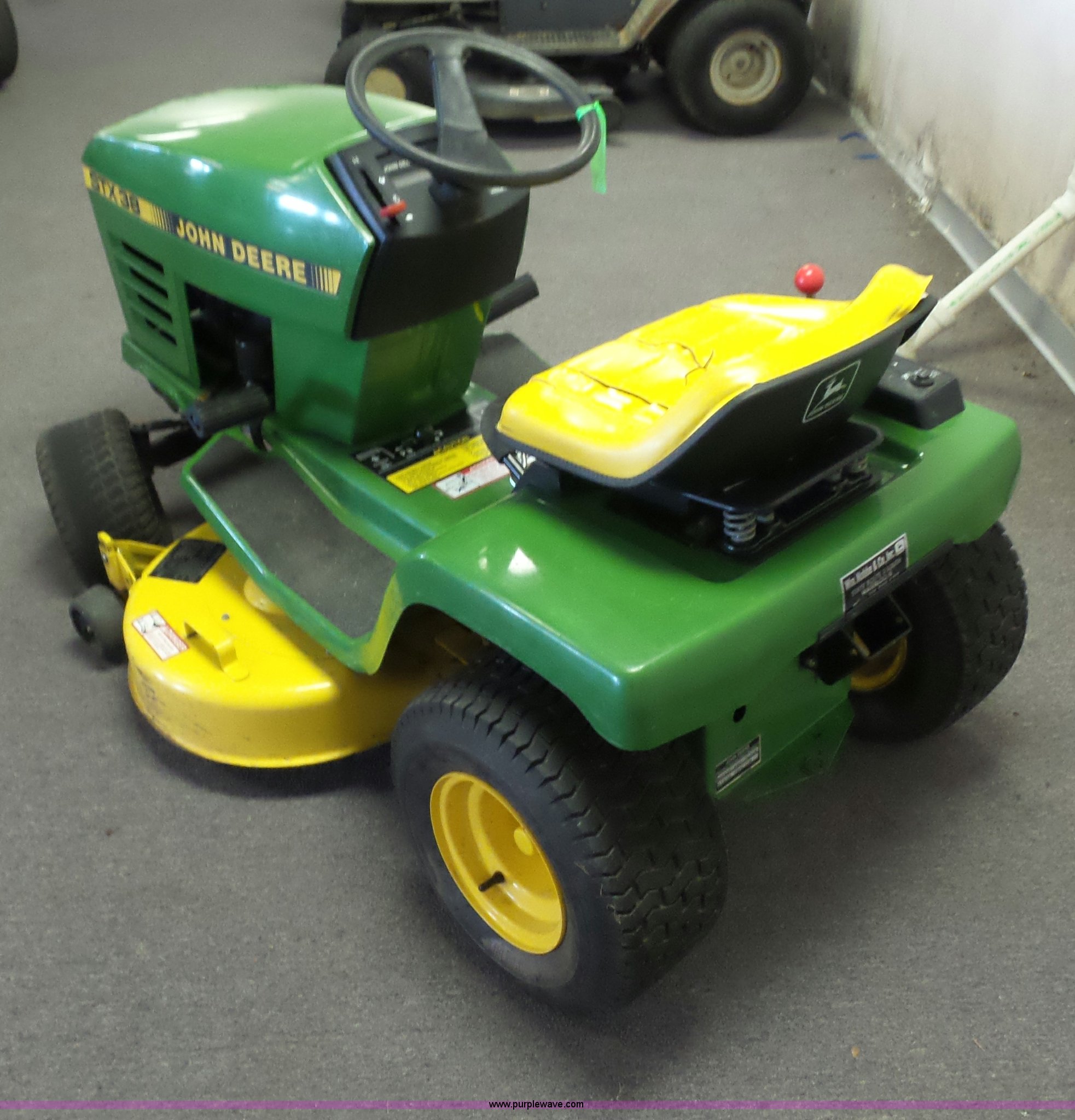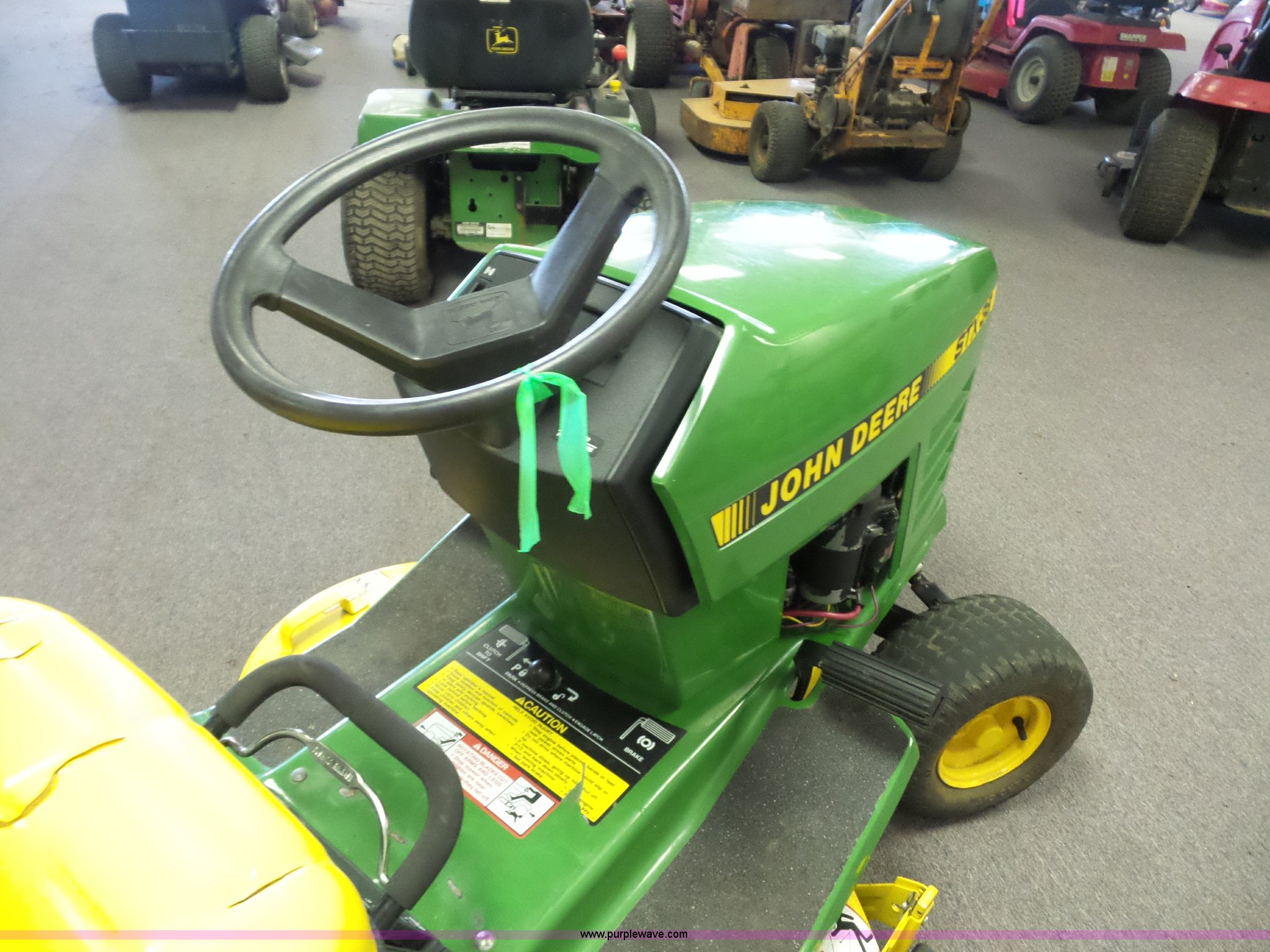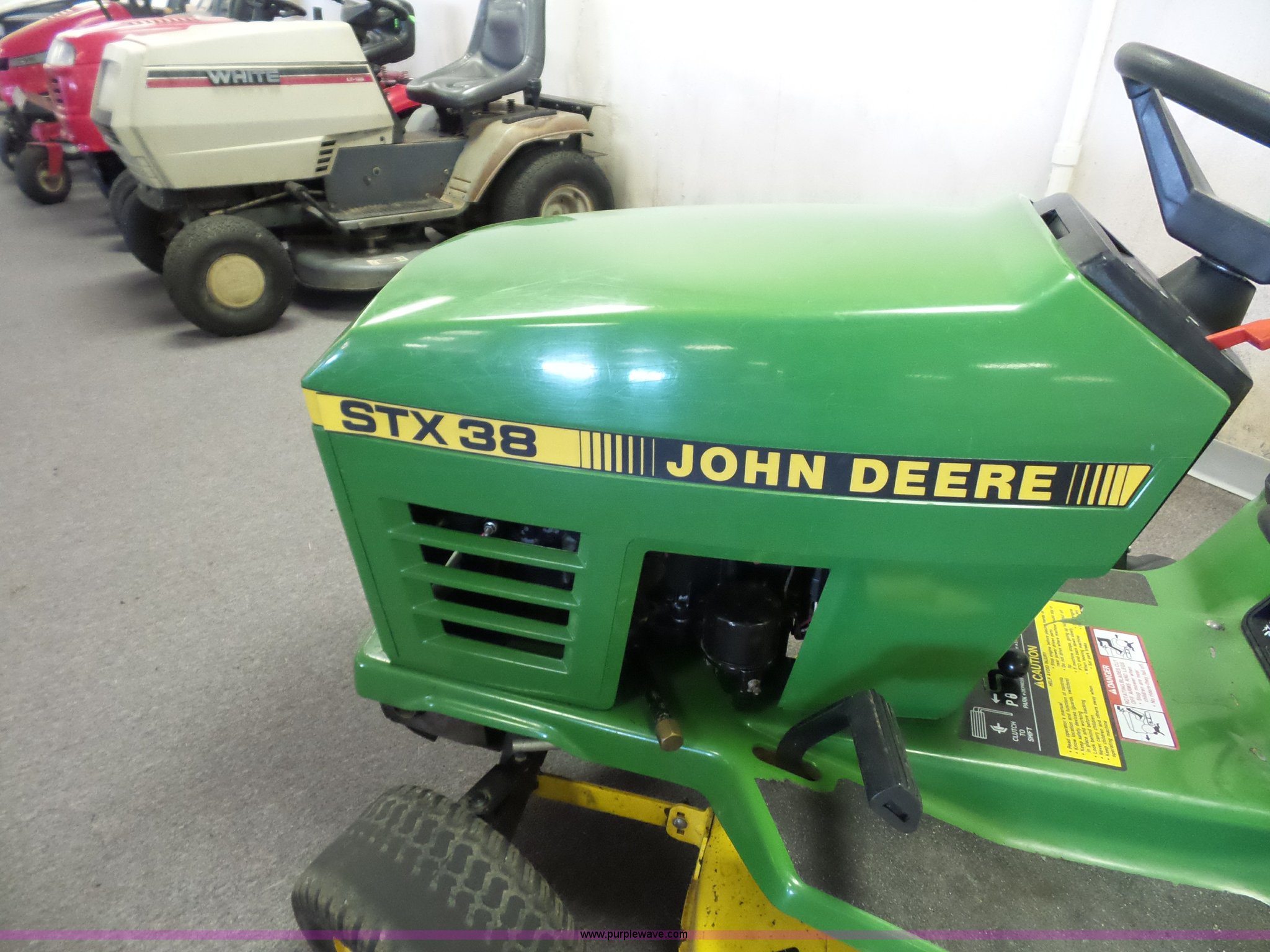 Purple Wave is selling a used Lawn Mower in Missouri. This item is a John Deere STX38 lawn mower with the following: 38" deck, Kohler gas engine, 12.5 HP, 5F-1R transmission, Low tire
