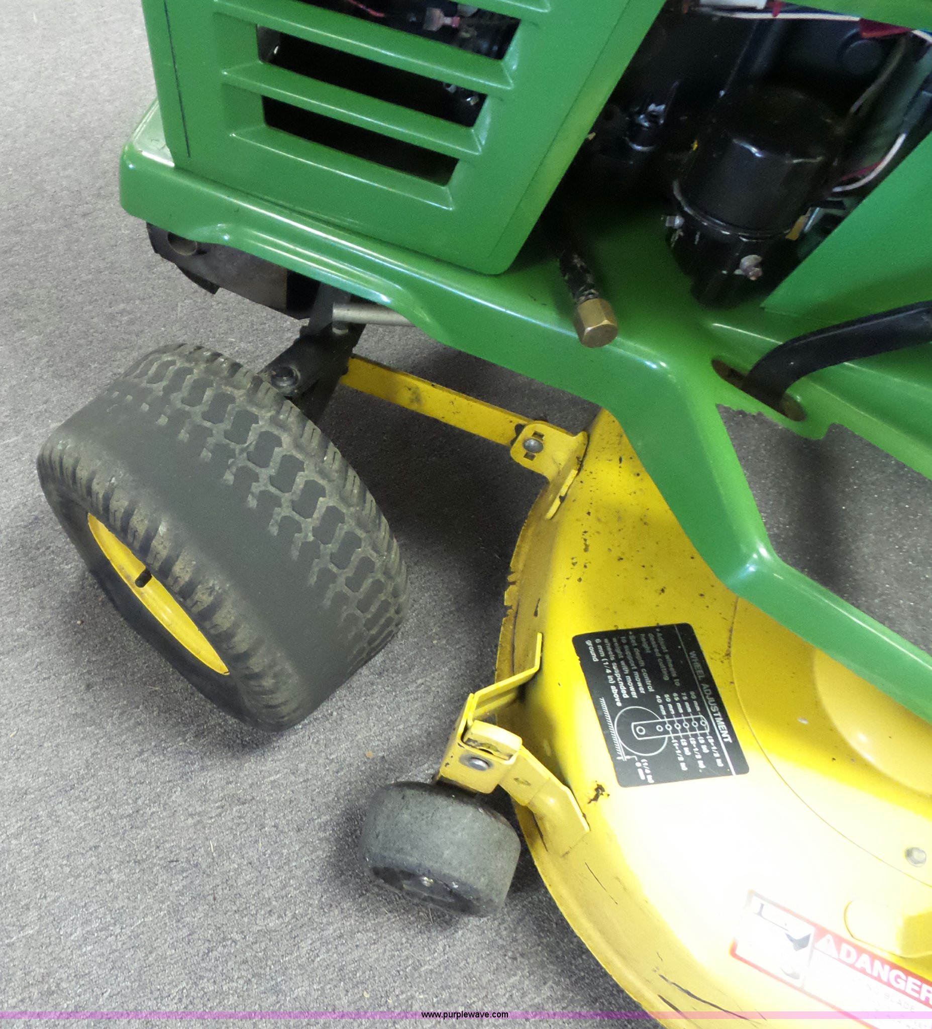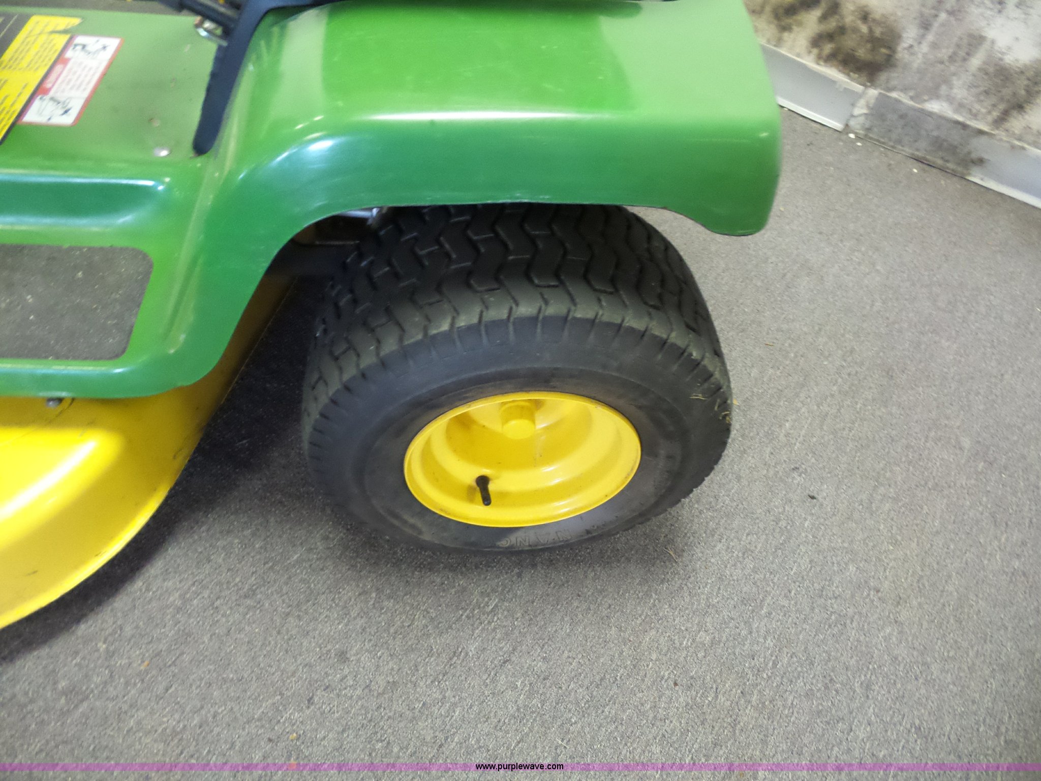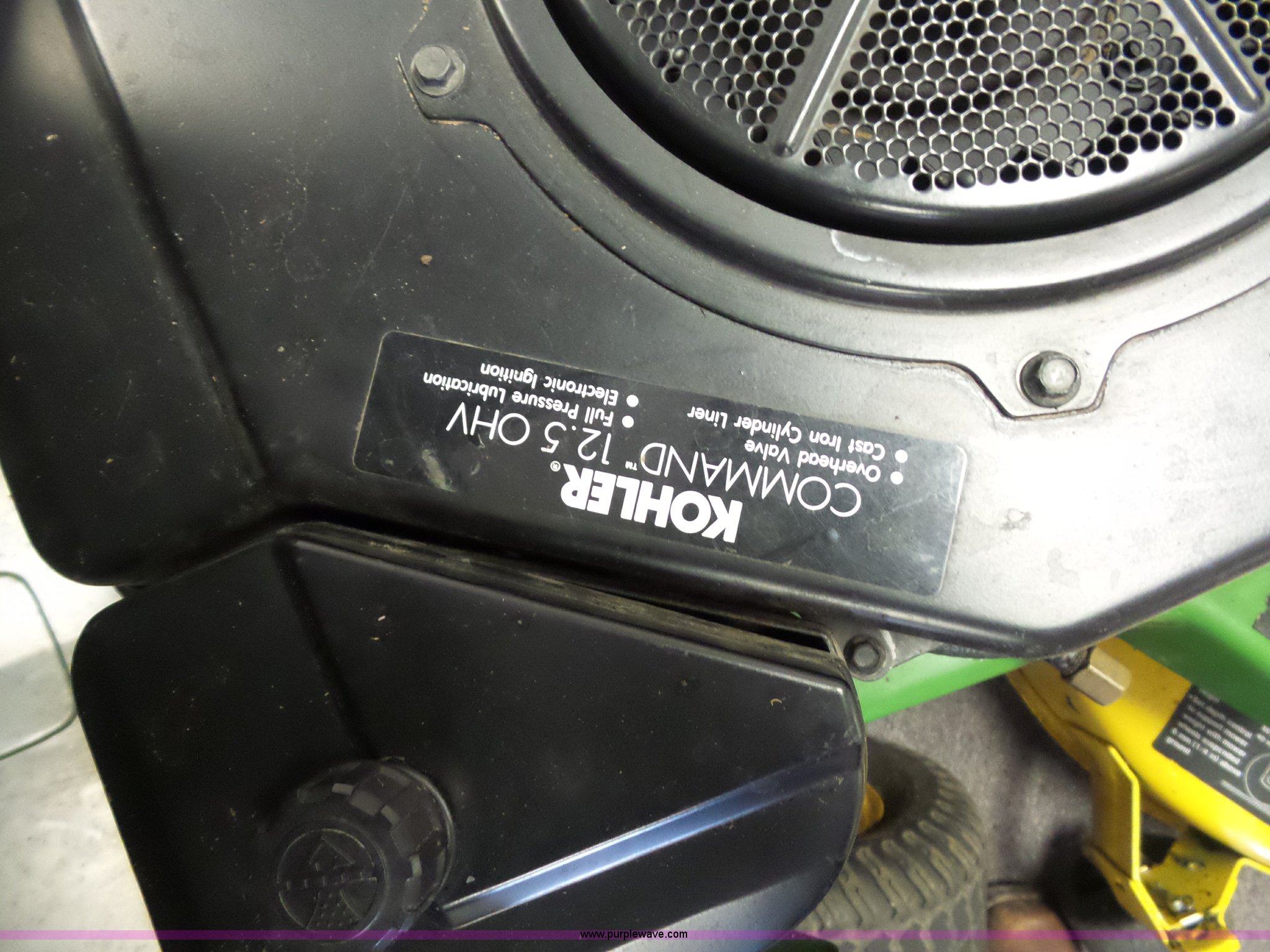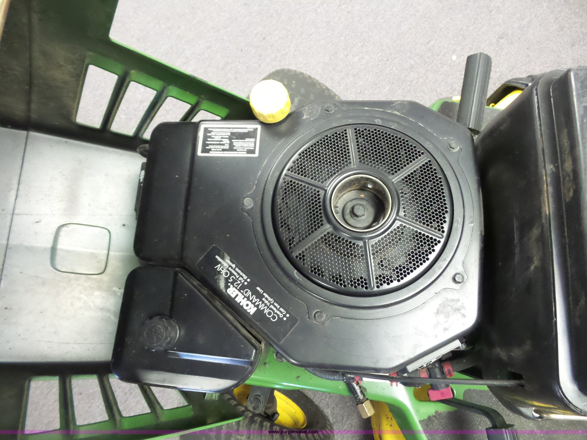 Purple Wave is selling a used Lawn Mower in Missouri. This item is a John Deere STX38 lawn mower with the following: 38" deck, Kohler gas engine, 12.5 HP, 5F-1R transmission, Low tire