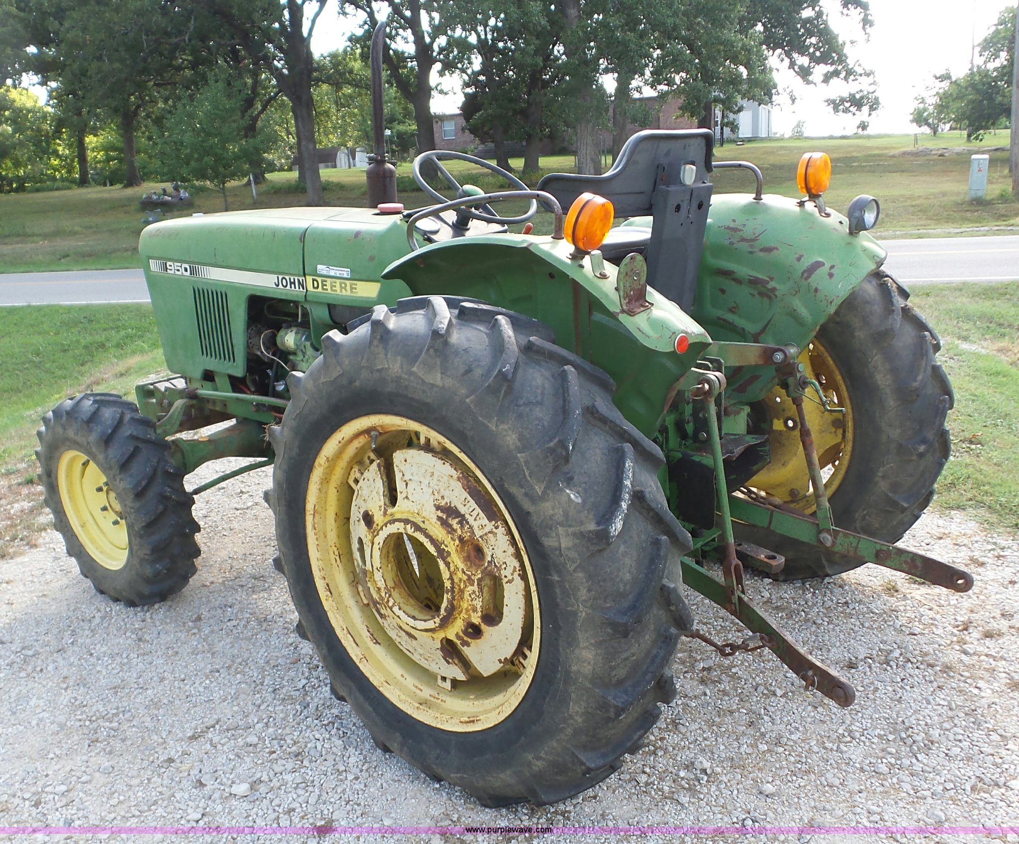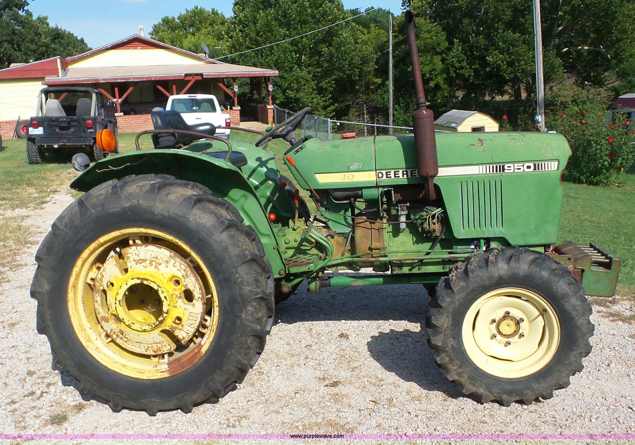 Purple Wave is selling a used Tractor in Kansas. This item is a John Deere 950 MFWD tractor with the following: 3,586 hours on meter, John Deere 3T90J three cylinder diesel engine, Serial CH3057D206718, Manual transmission, 8F-2R gears, Differential lock, Spring suspension seat, Three point, 540 PTO, (6) suitcase weights, 8-16 front tires, 12.4-28 rear tires