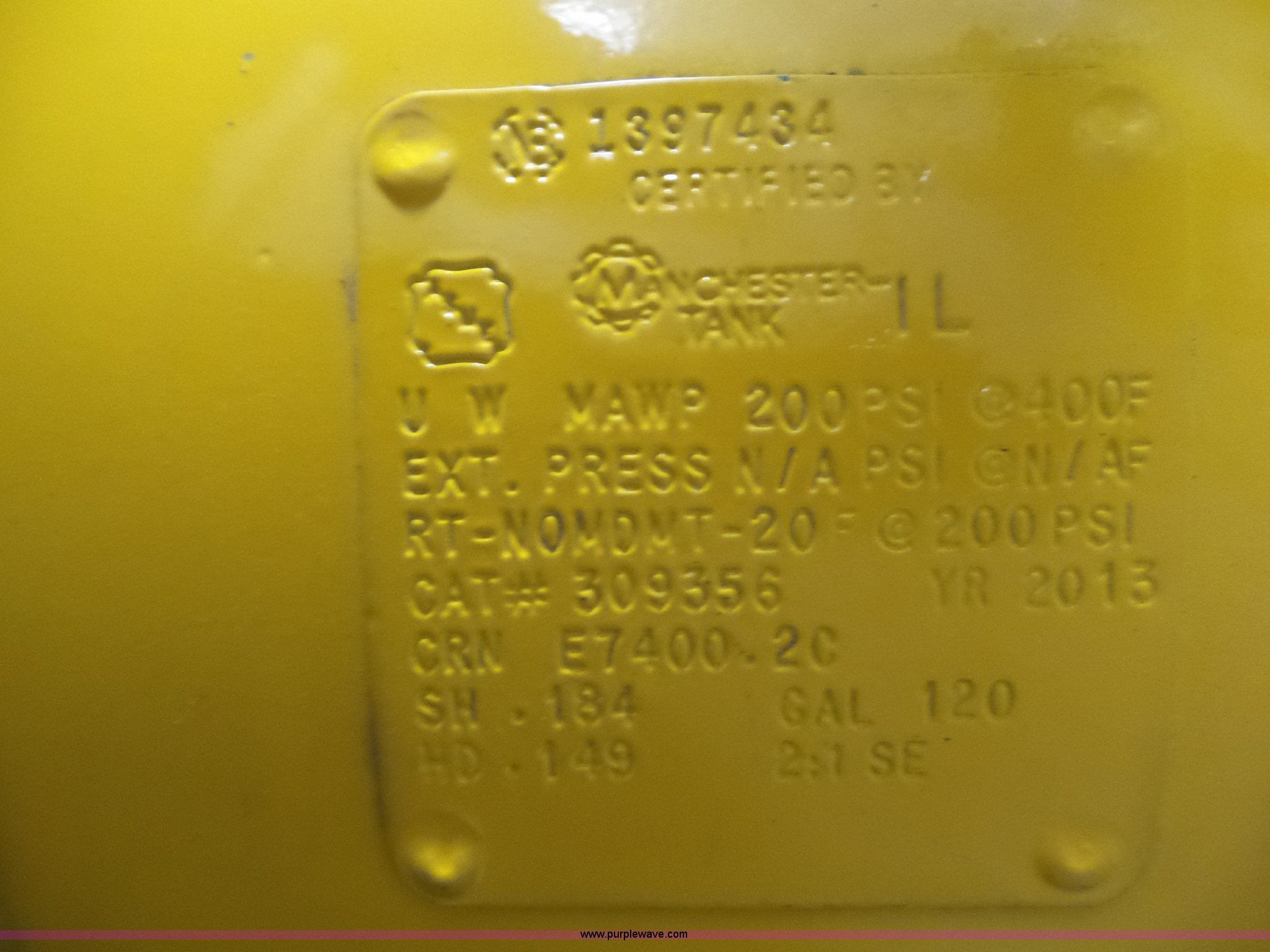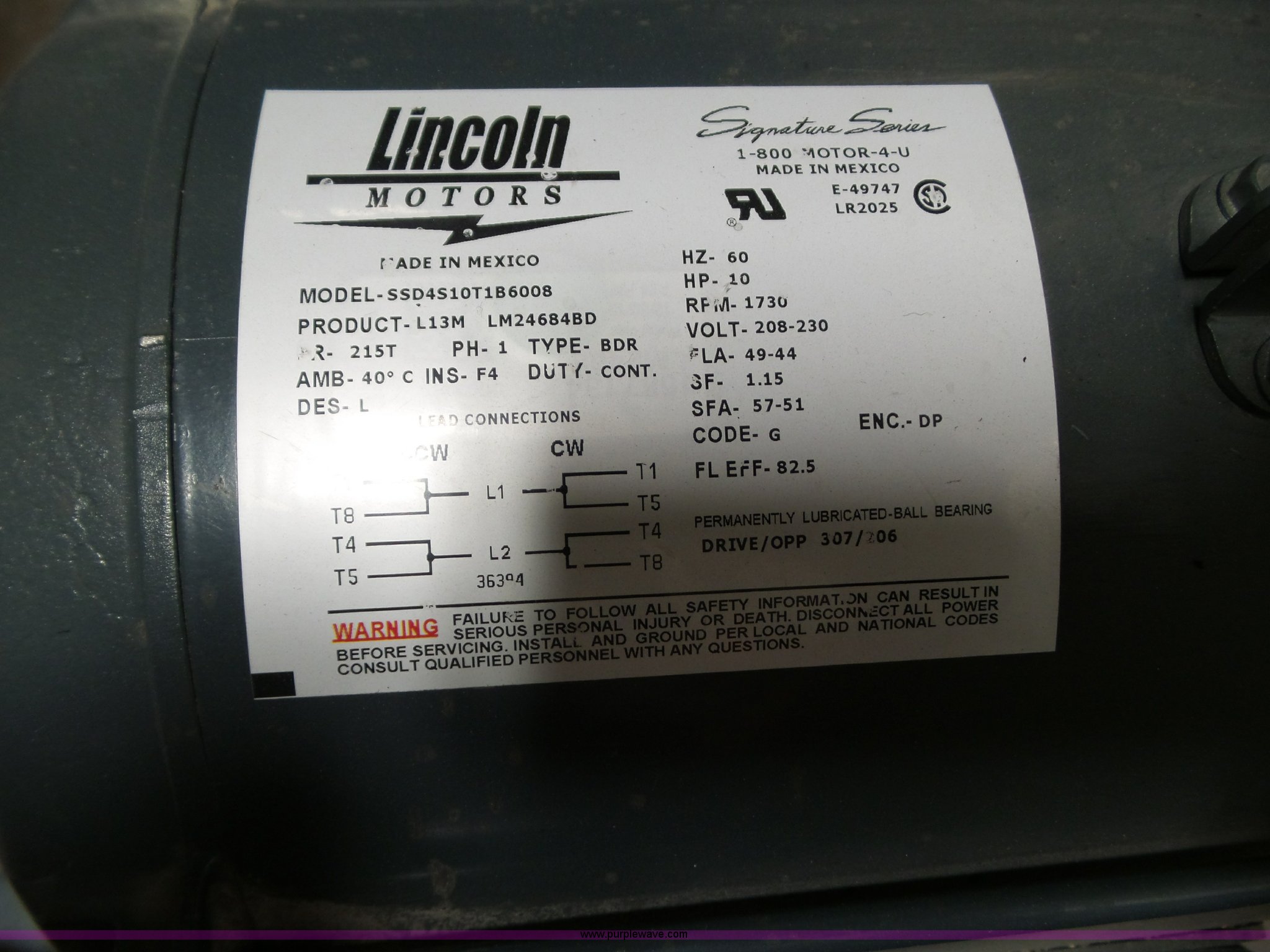 2013 Emax air compressor. Lincoln SS04510T1B6008 electric motor 10 HP, 208/230V, Single phase, Eaton APP3Y1544T air compressor 175 psi, 120 gallon horizontal tank 32" x 78" x 50", Two stage, Auto tank drain, Skid mounted, 1,083 lbs, Plug and cable hook up not included, Serial EP10H120Y1. Kratofil Auto. 1628 20th St. Centerville, IA 52544