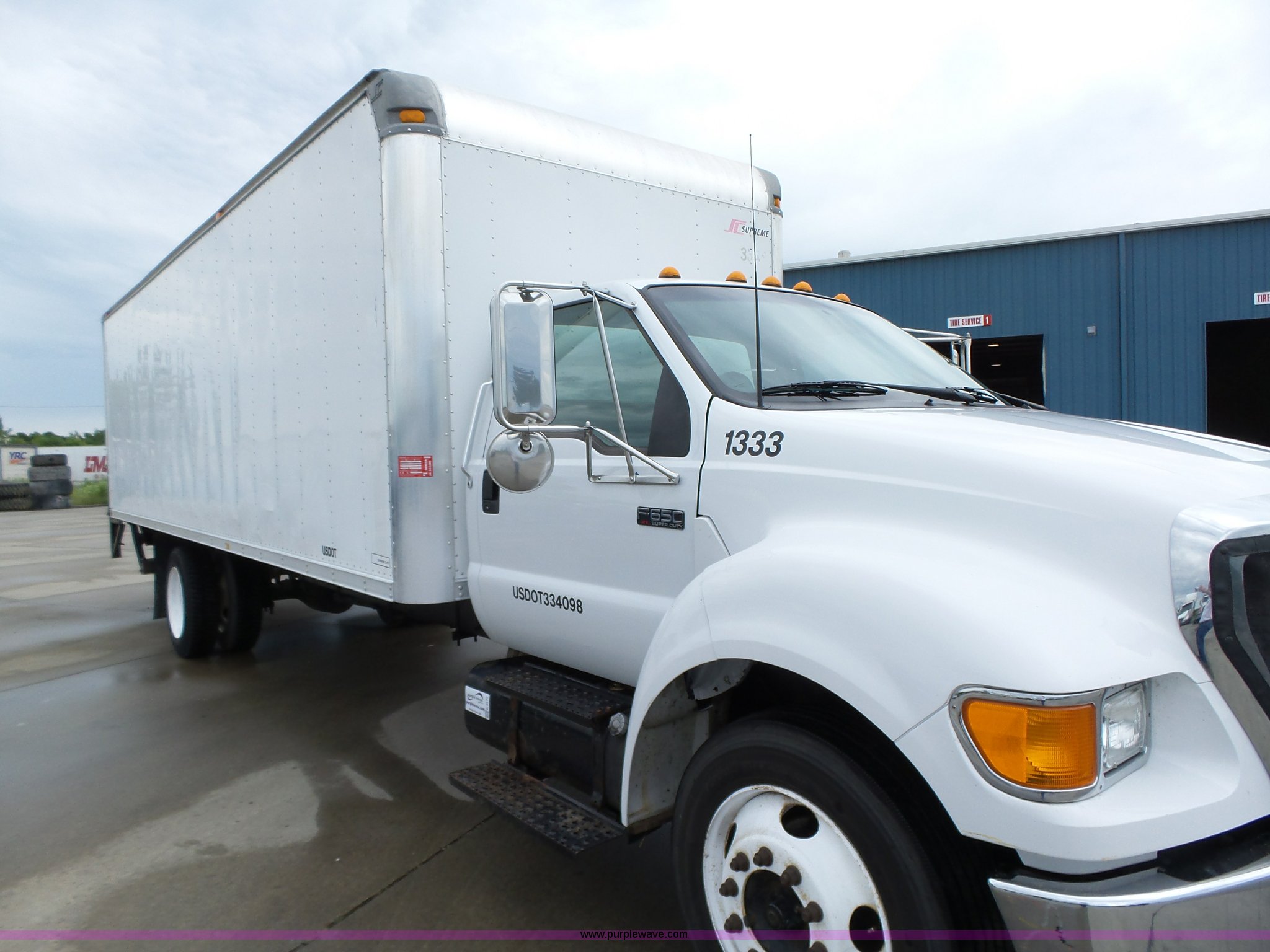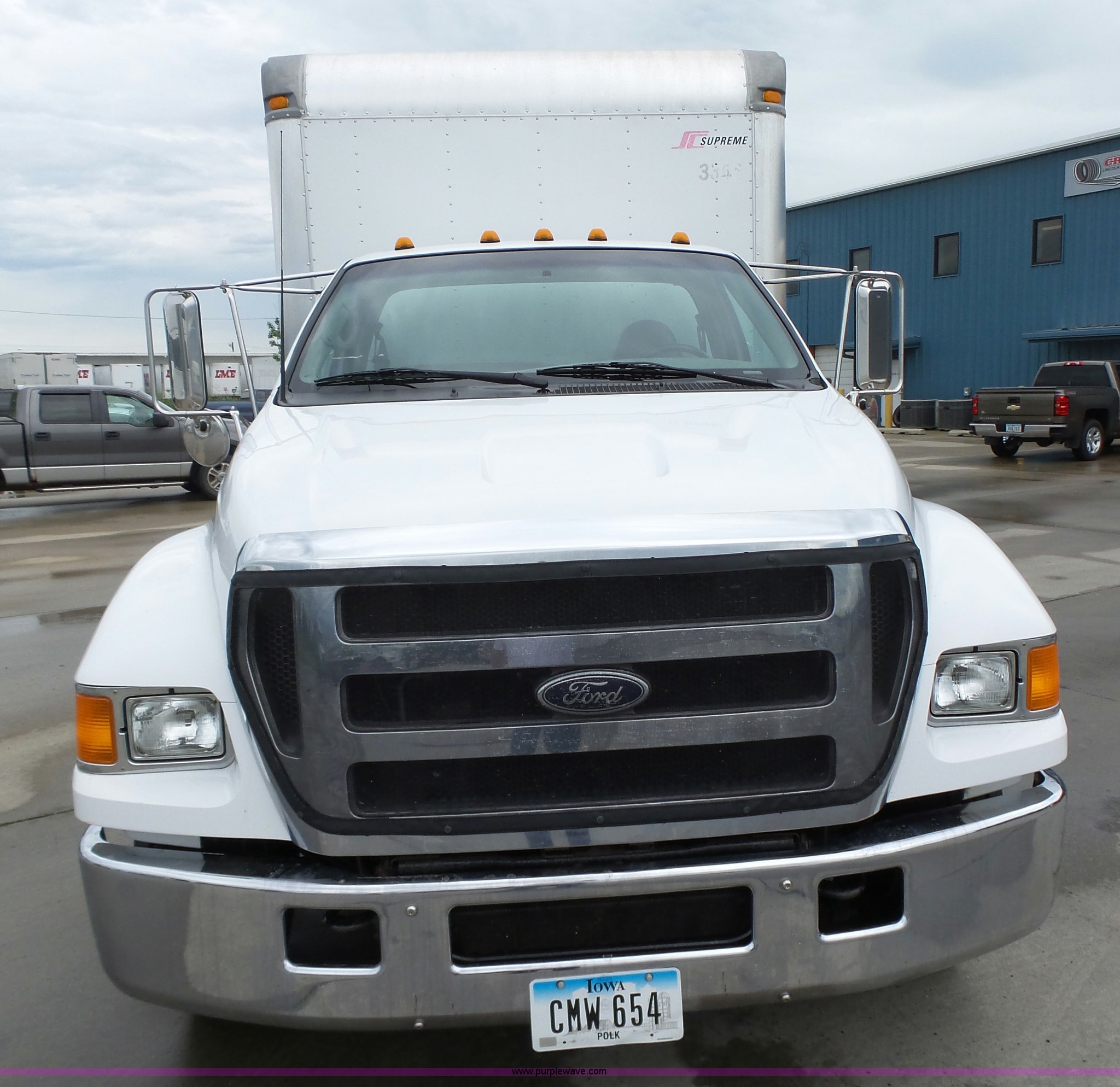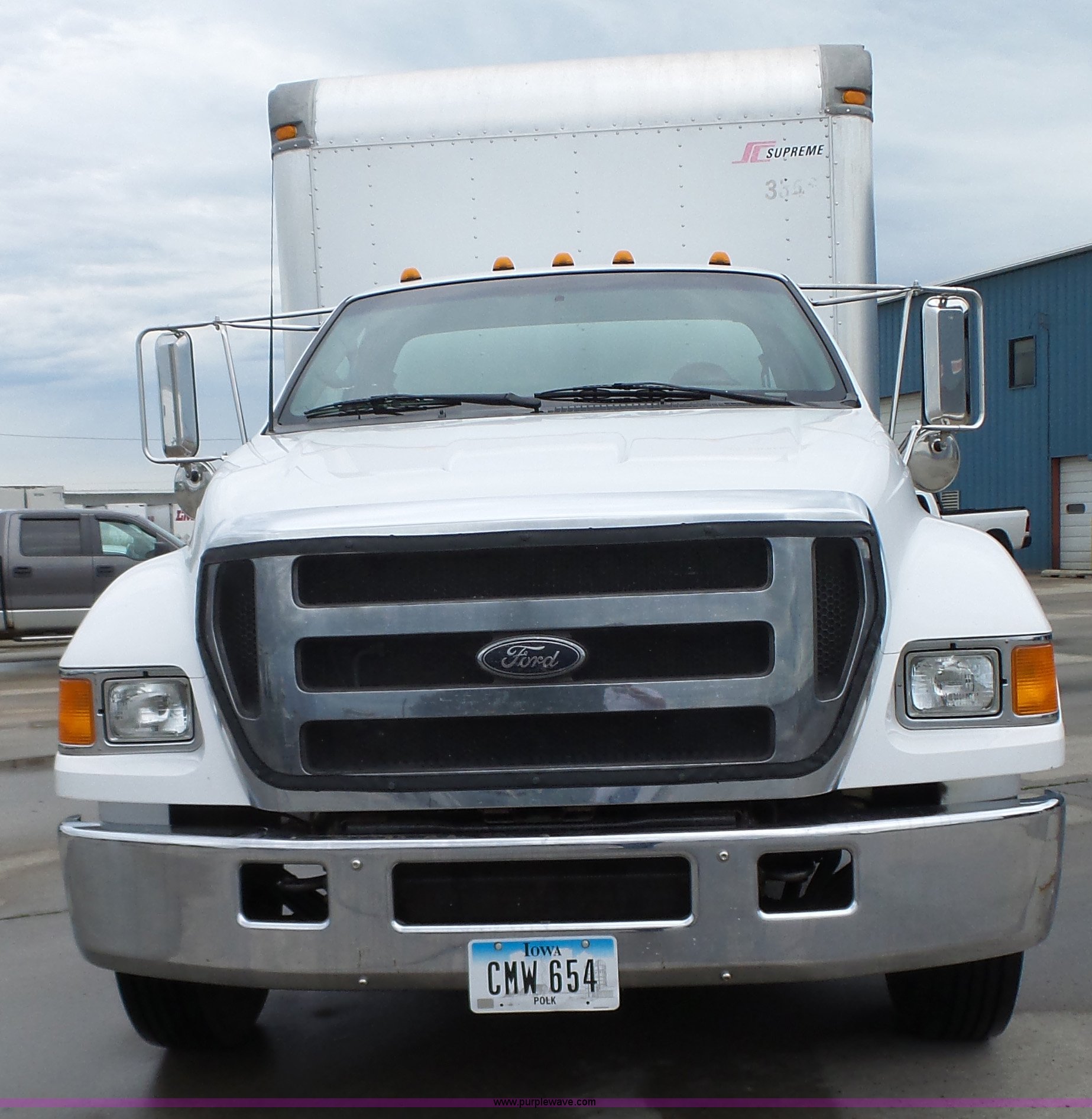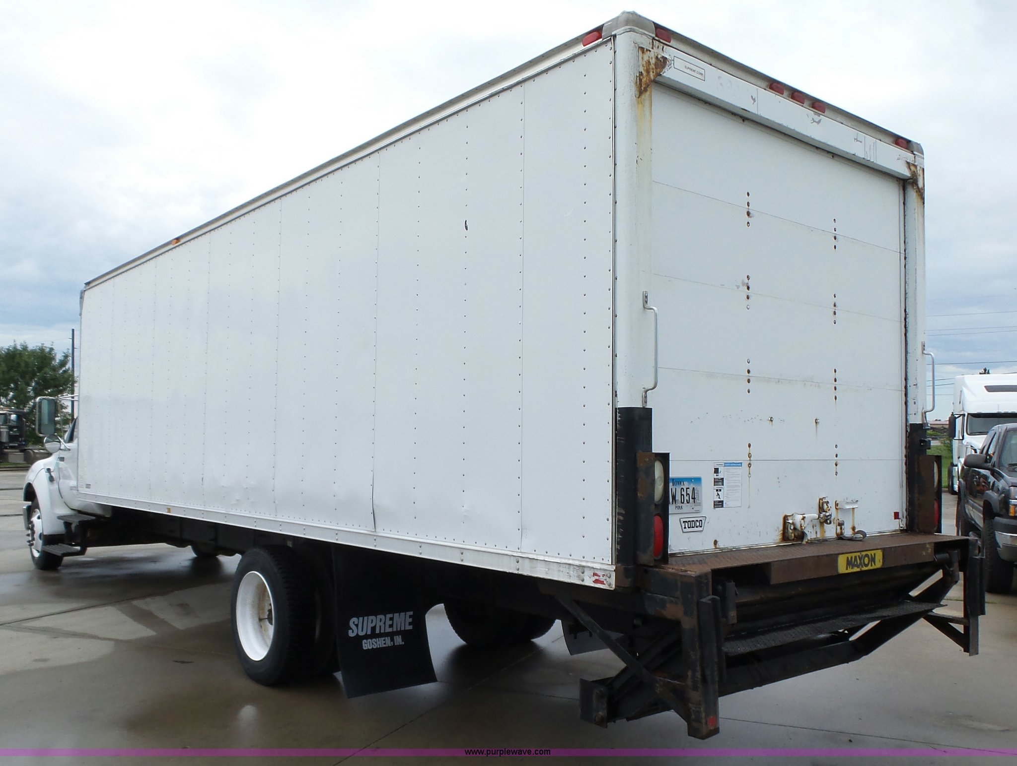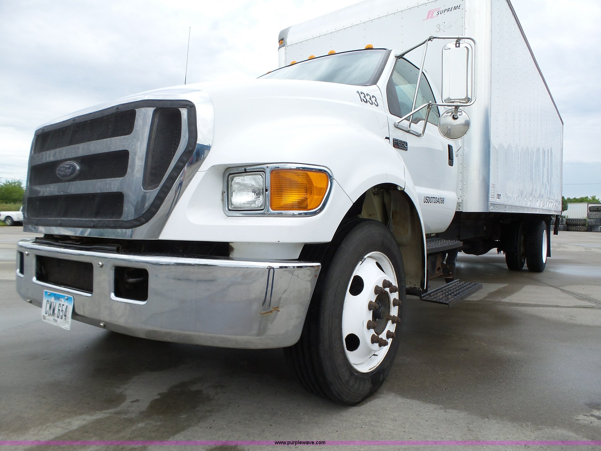 Purple Wave is selling a used Box Truck in Iowa. This item is a 2005 Ford F650 Super Duty XL box truck with the following: 220,325 miles on odometer, International VT365 6.0L V8 turbo diesel engine, 215 HP, Automatic transmission, Single axle, AC and heat, AM/FM/CD, Block heater, Front tow hooks, Supreme box bed, 26'L x 8'W, Wood deck, Rear roll up door, Dock bumper, Maxon tailgate lift, Translucent roof, Serial VA26084096, Single fuel tank, Spring suspension, Hydraulic brakes, 260" wheelbase, 255/70R22.5 tires, GVWR 26,000 lbs, FAWR 8,500 lbs, RAWR 17,500 lbs, Contents not included, Unit# 1333