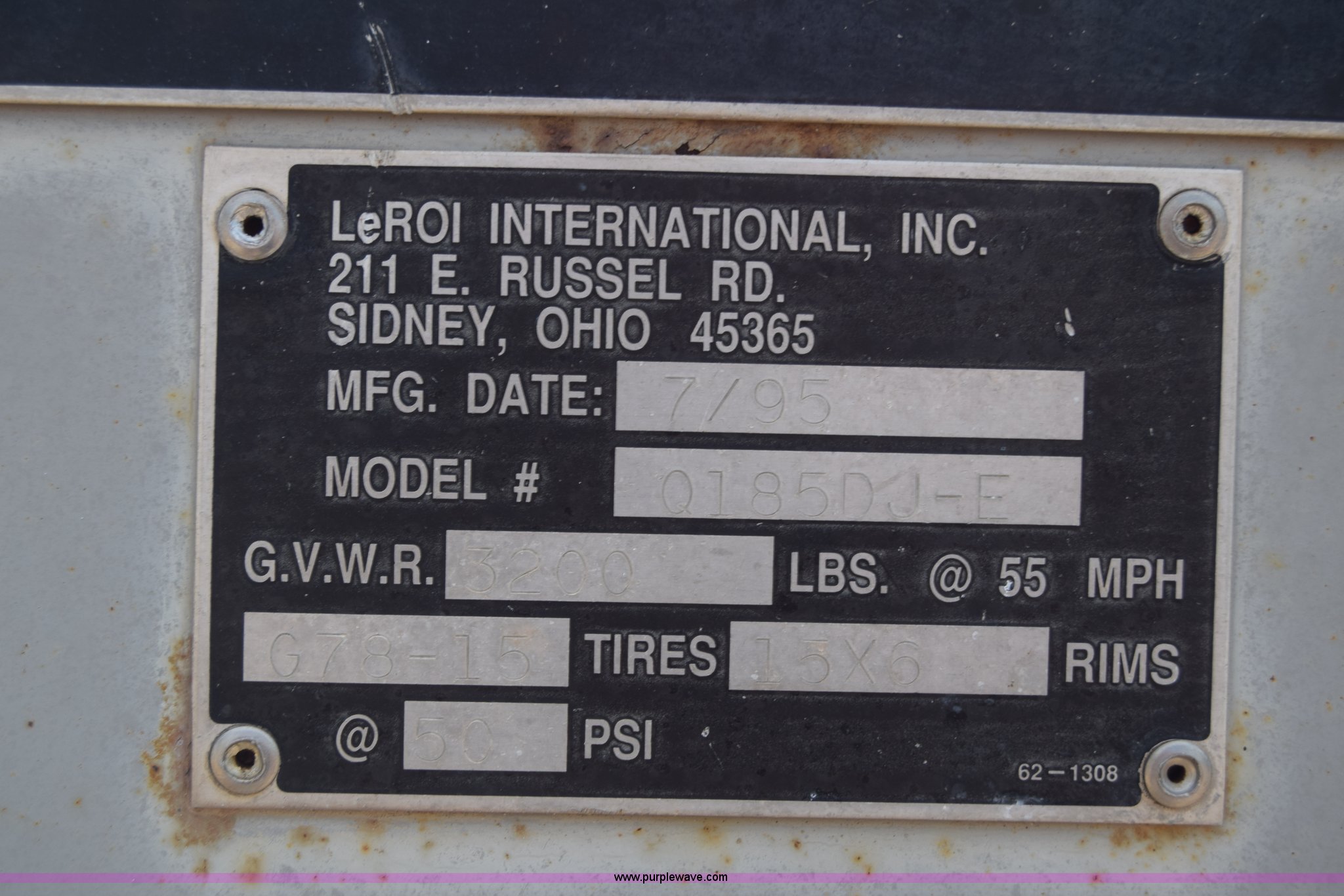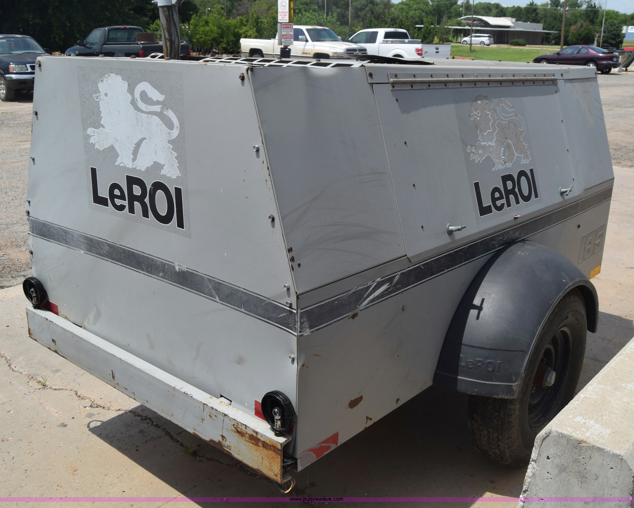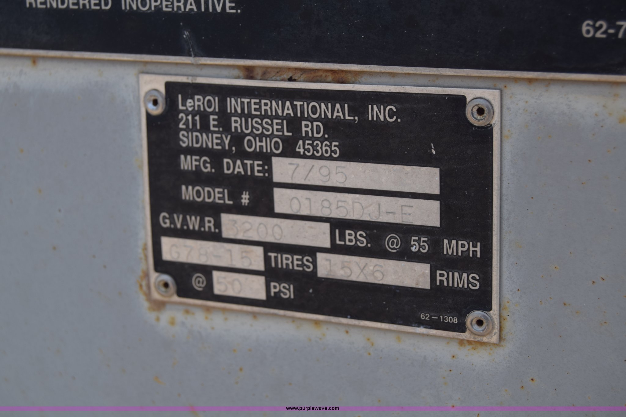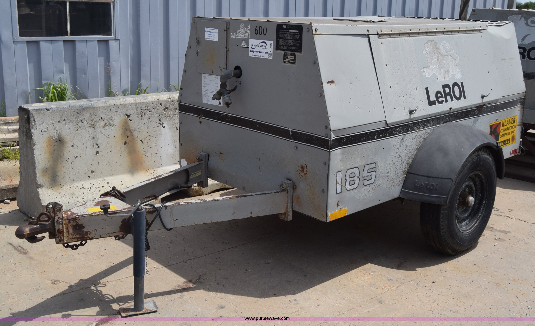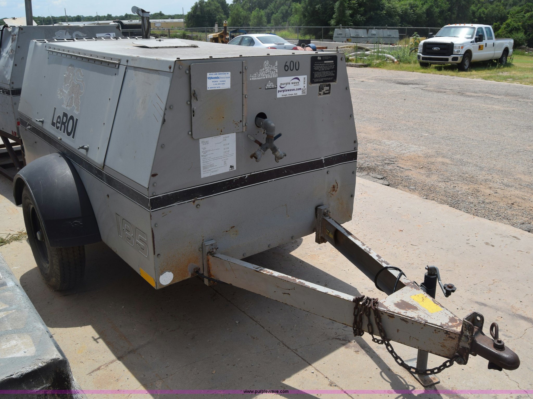 Purple Wave is selling a used Air Compressor in Kansas. This item is a 1995 Leroi Q185DJF air compressor with the following: 2,699 hours on meter, John Deere four cylinder diesel engine, 185 cfm, Ball hitch, Spring suspension, Single axle, 7.00-15 tires, Serial 3323X164