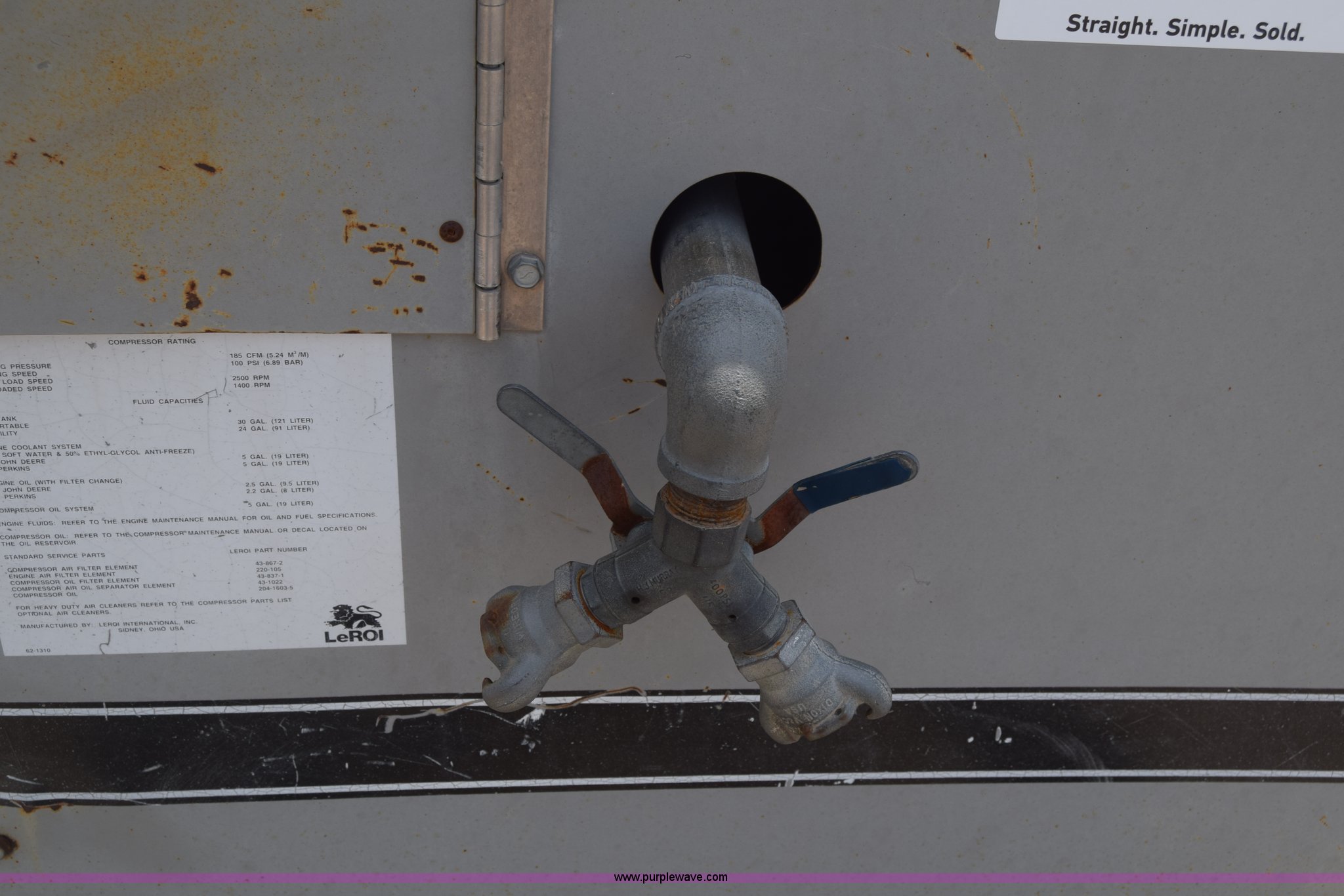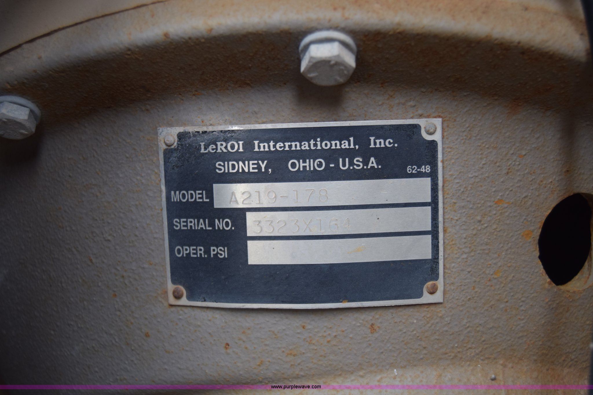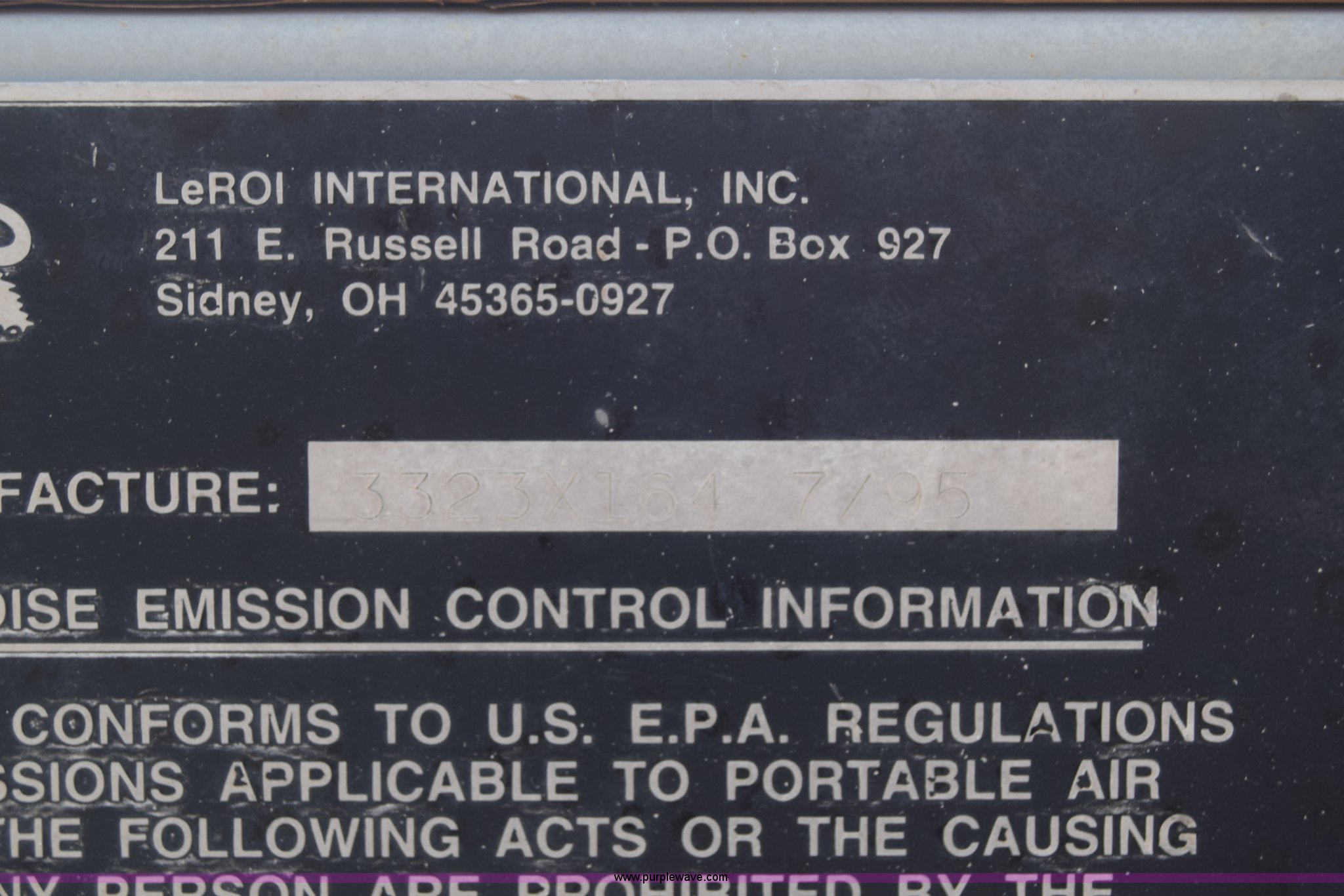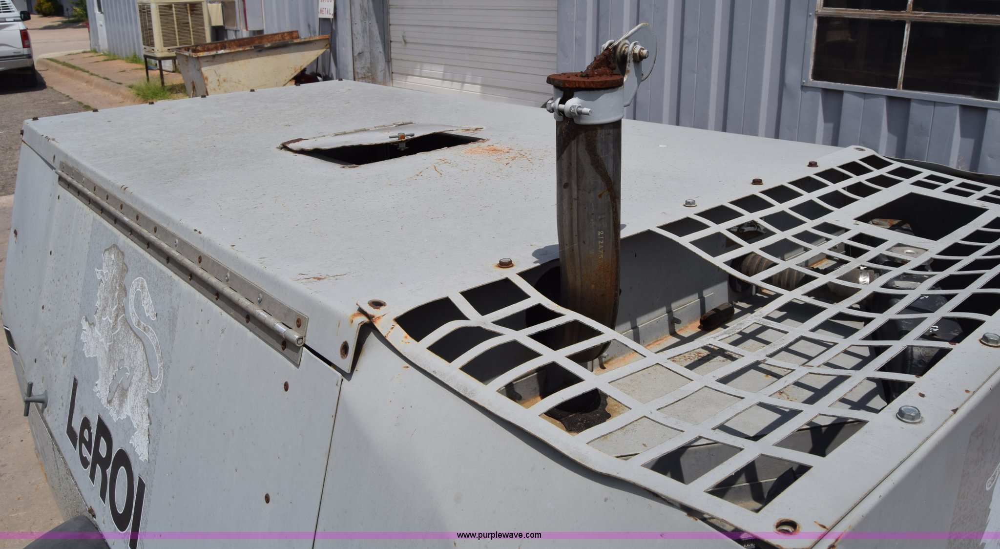 Purple Wave is selling a used Air Compressor in Kansas. This item is a 1995 Leroi Q185DJF air compressor with the following: 2,699 hours on meter, John Deere four cylinder diesel engine, 185 cfm, Ball hitch, Spring suspension, Single axle, 7.00-15 tires, Serial 3323X164
