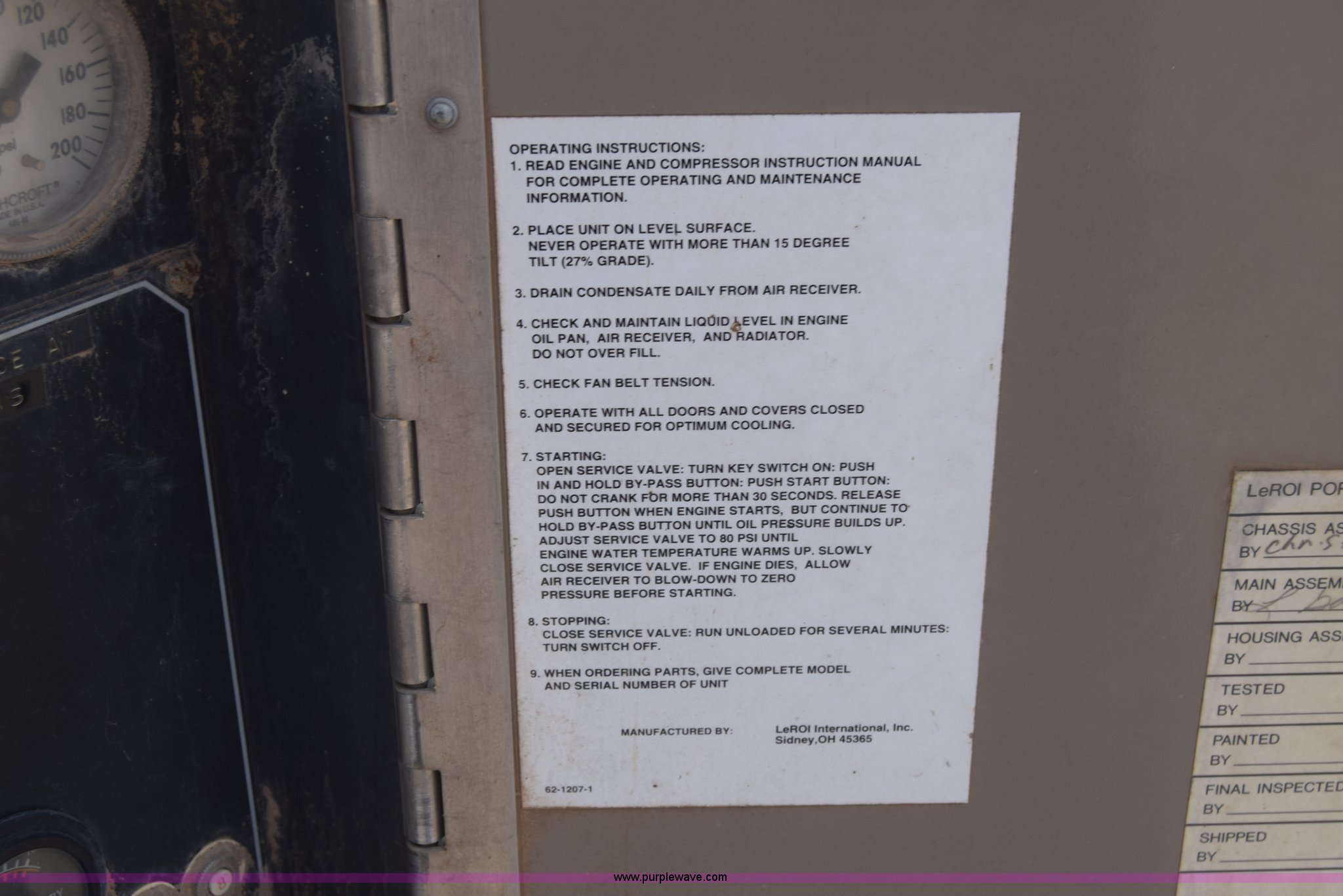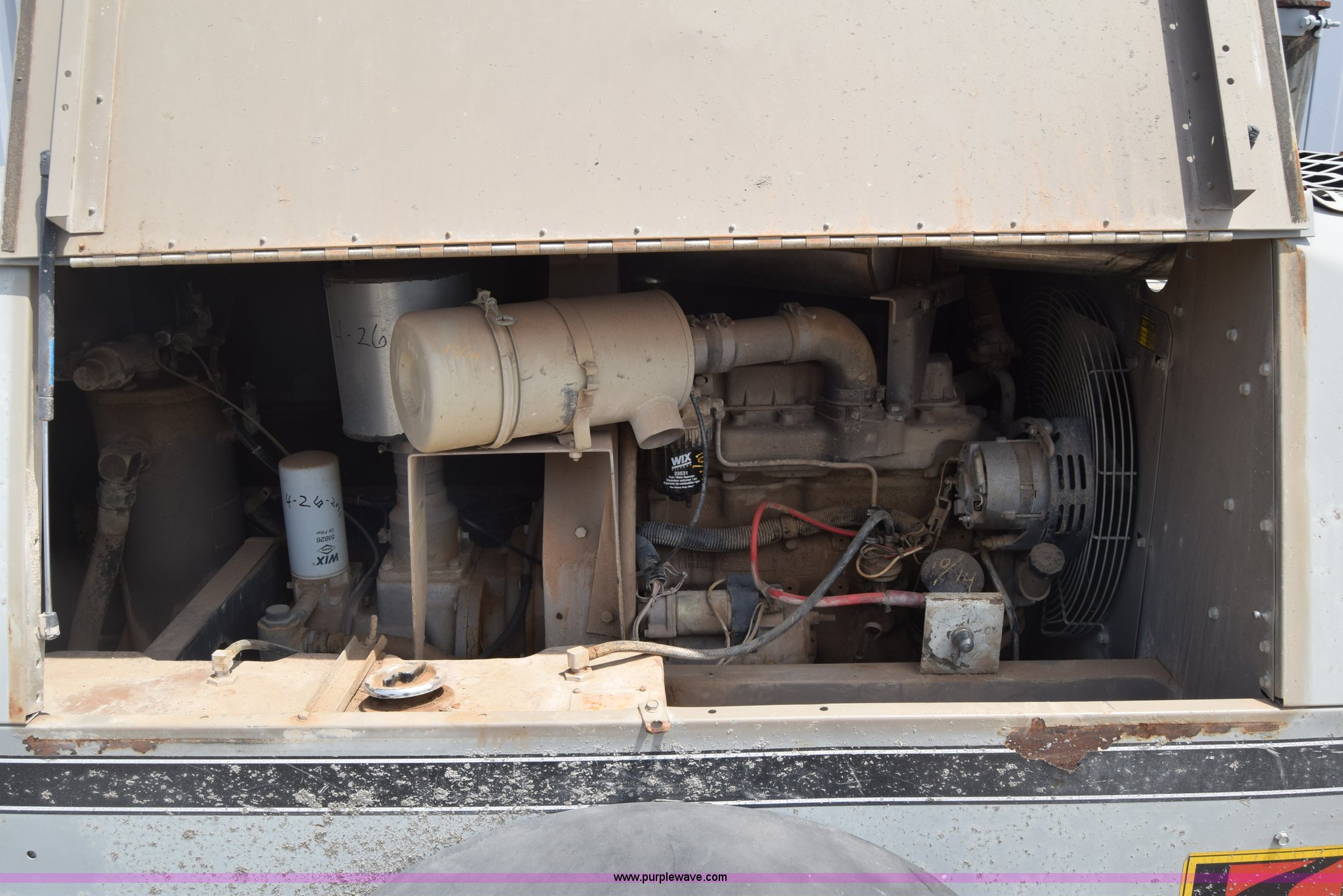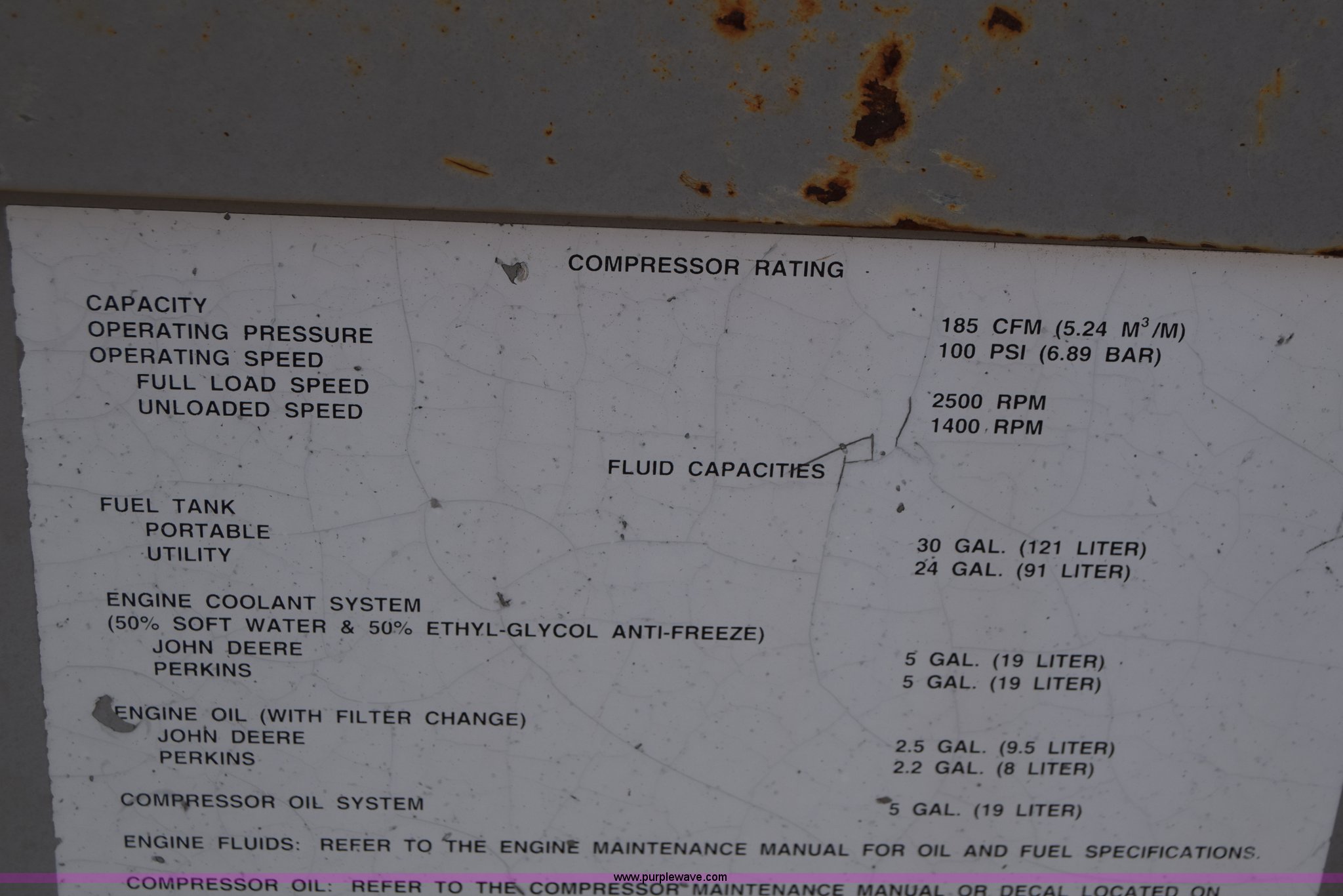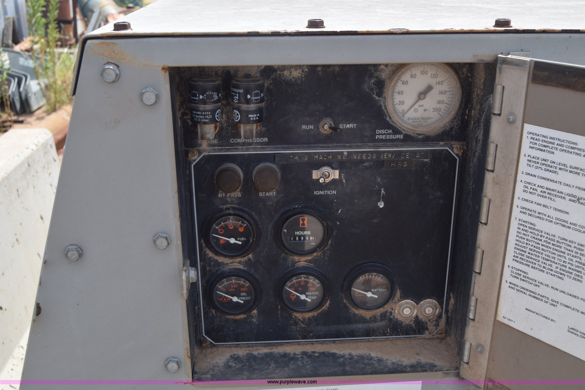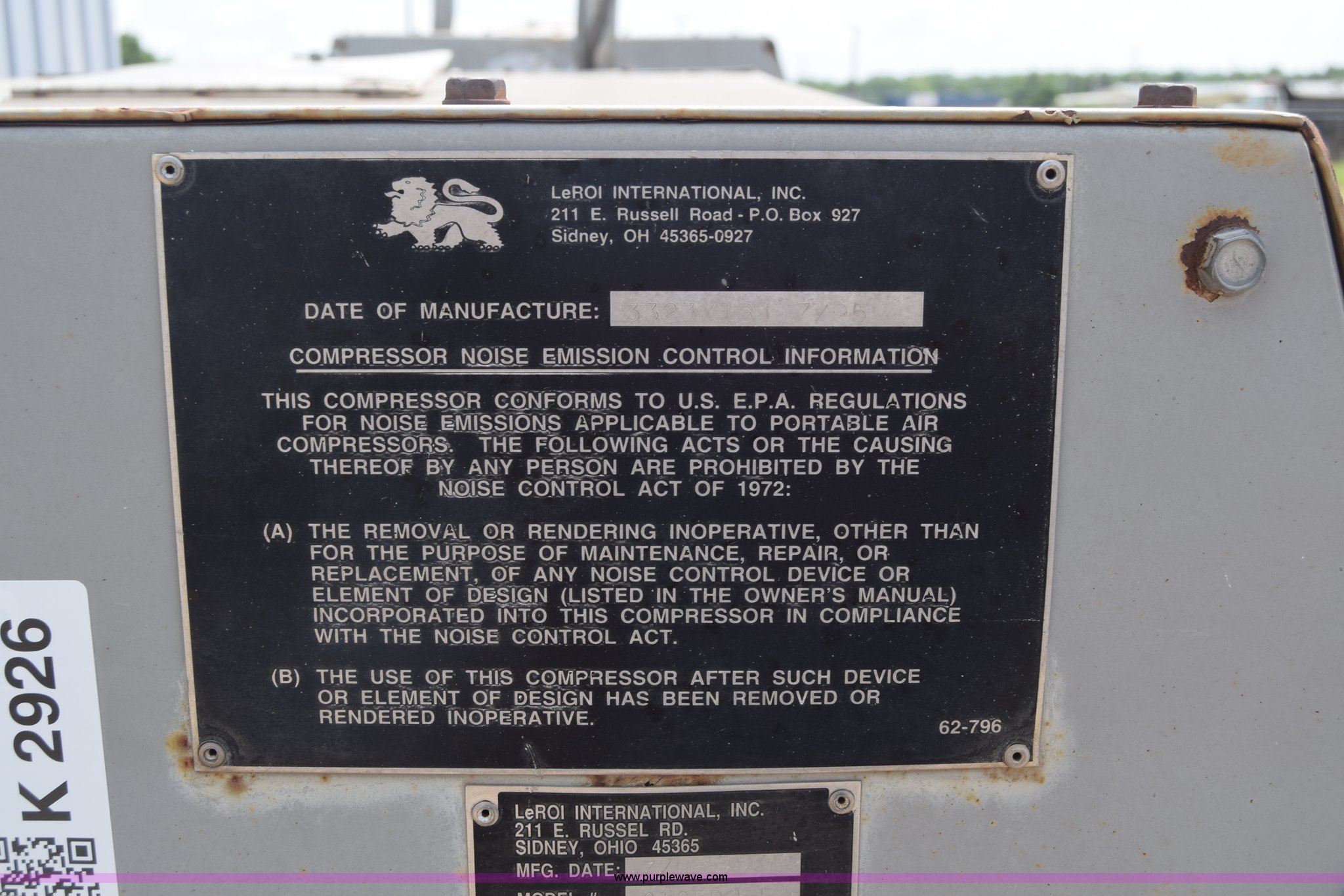 Purple Wave is selling a used Air Compressor in Kansas. This item is a 1995 Leroi Q185DJF air compressor with the following: 2,699 hours on meter, John Deere four cylinder diesel engine, 185 cfm, Ball hitch, Spring suspension, Single axle, 7.00-15 tires, Serial 3323X164