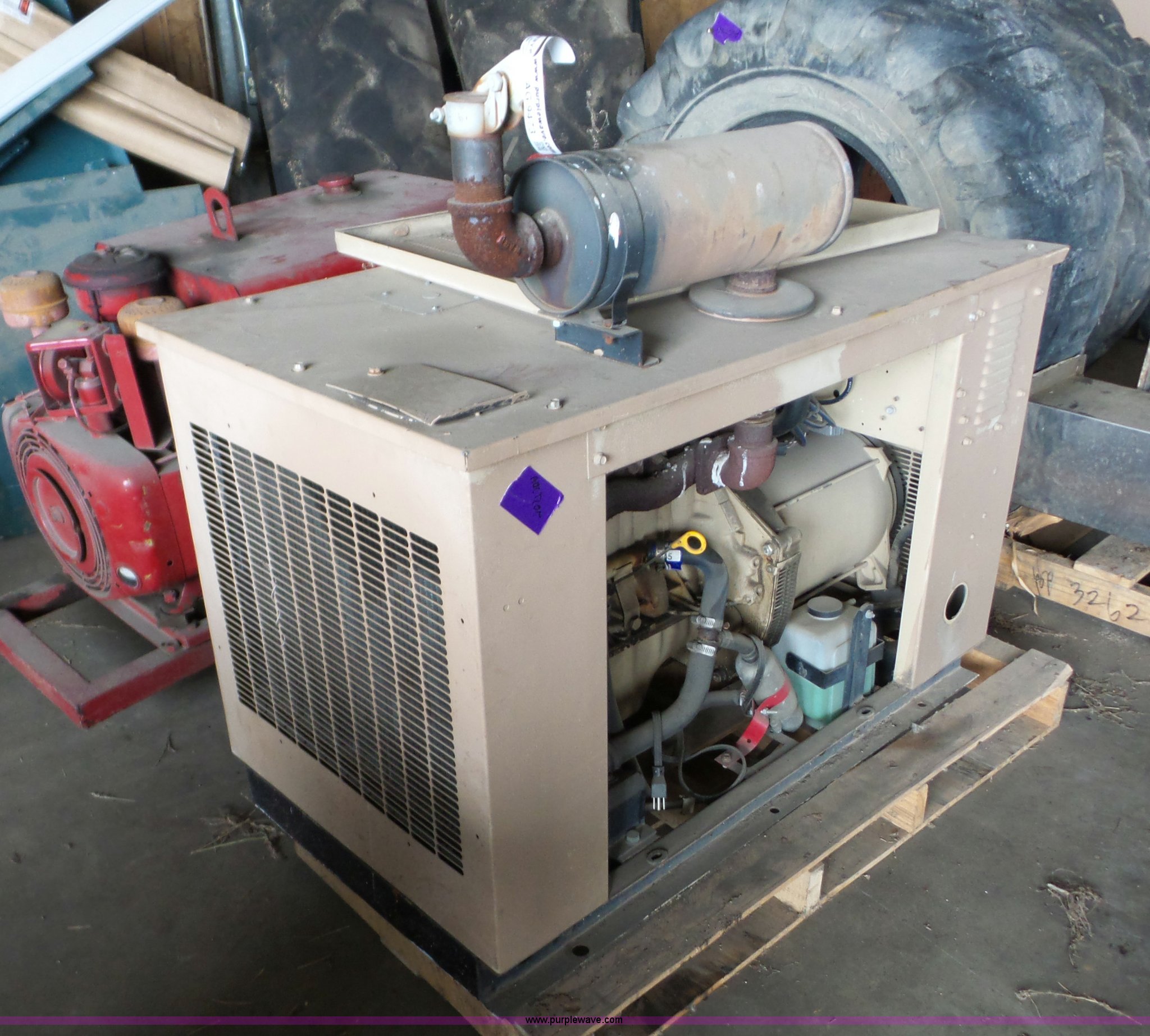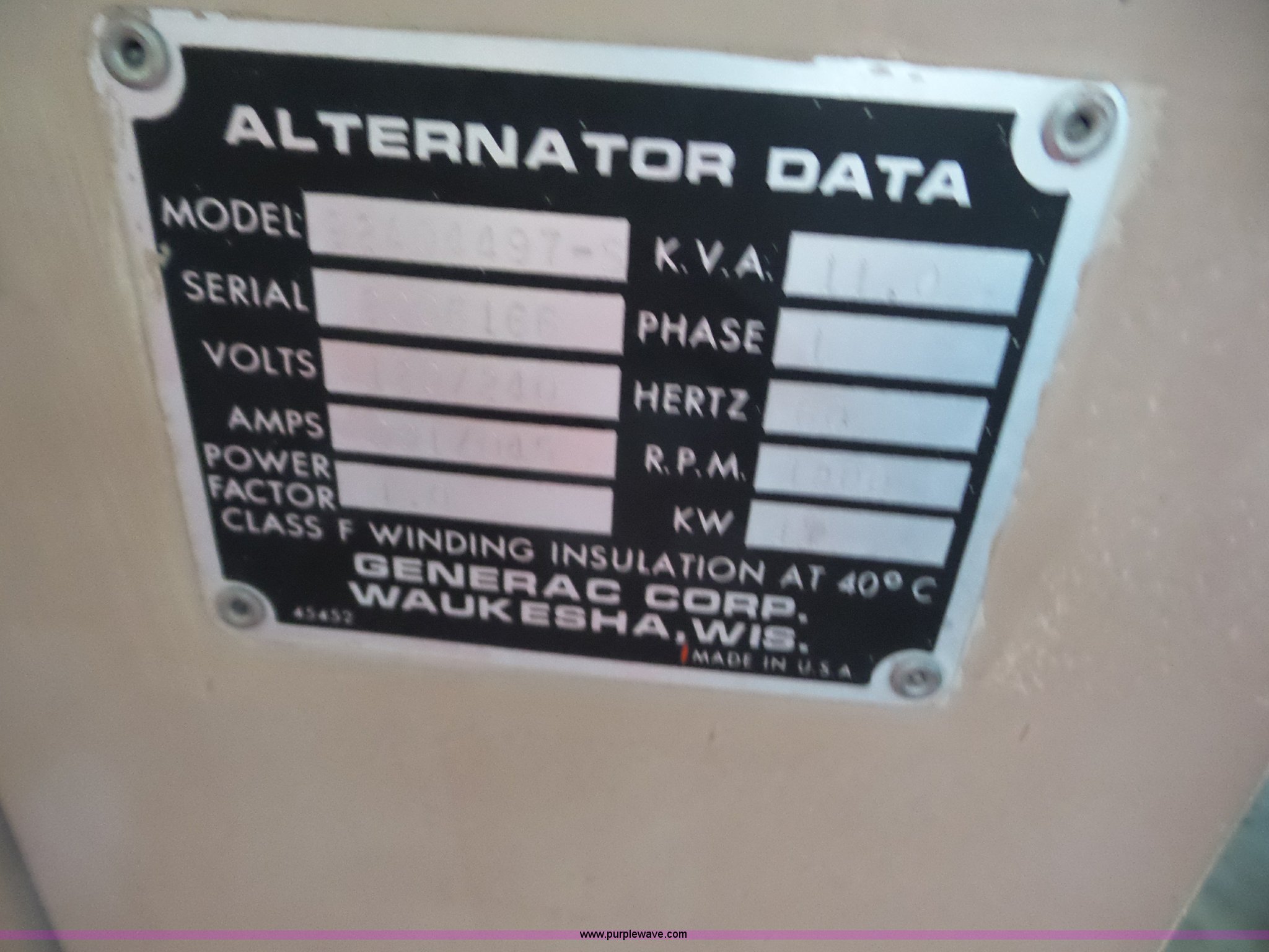 Purple Wave is selling a used Generator Set in Kansas. This item is a Generac generator with the following: Model 92A04497-S, 1.2L four cylinder natural gas engine, 11 kVA, Operational when removed from service two years ago, Serial 2006166