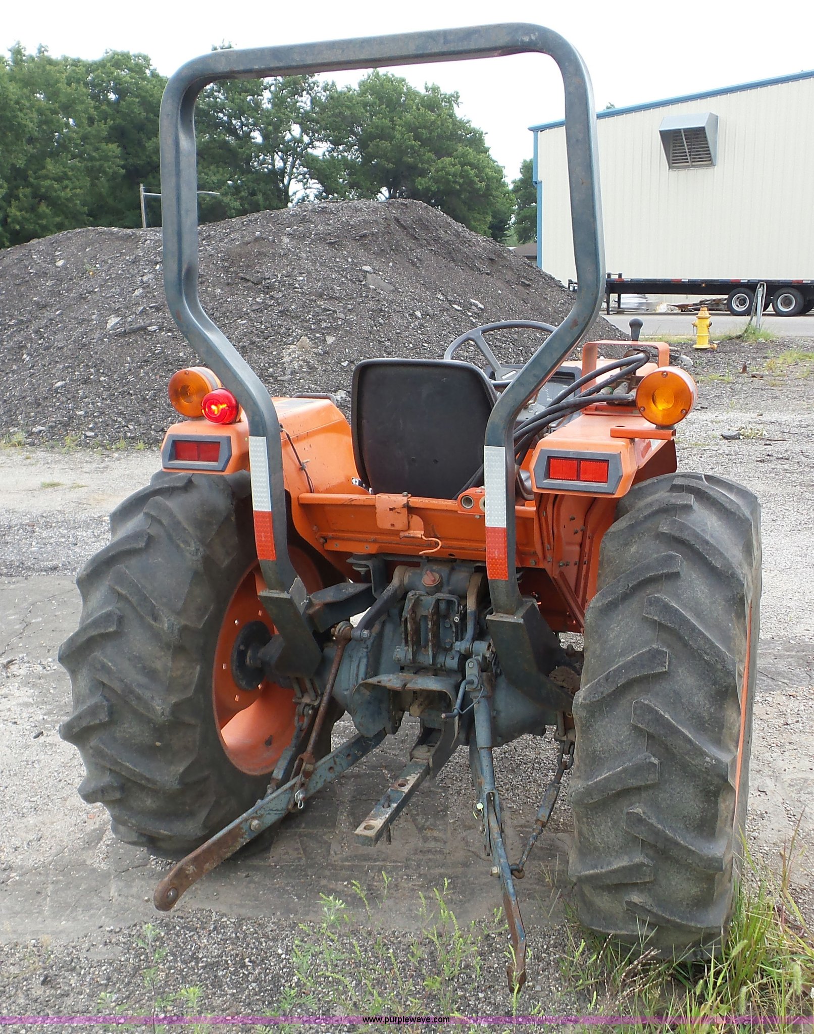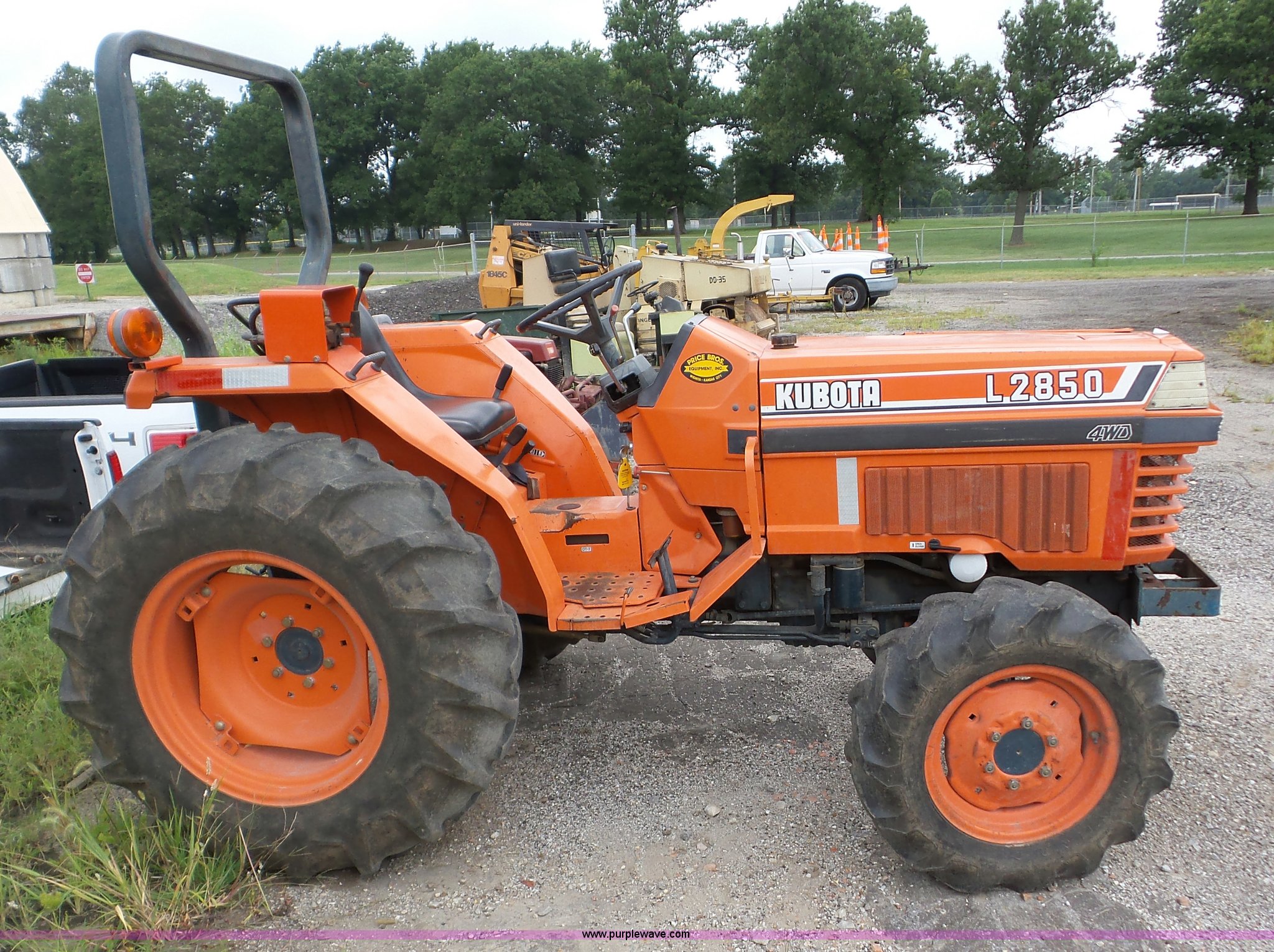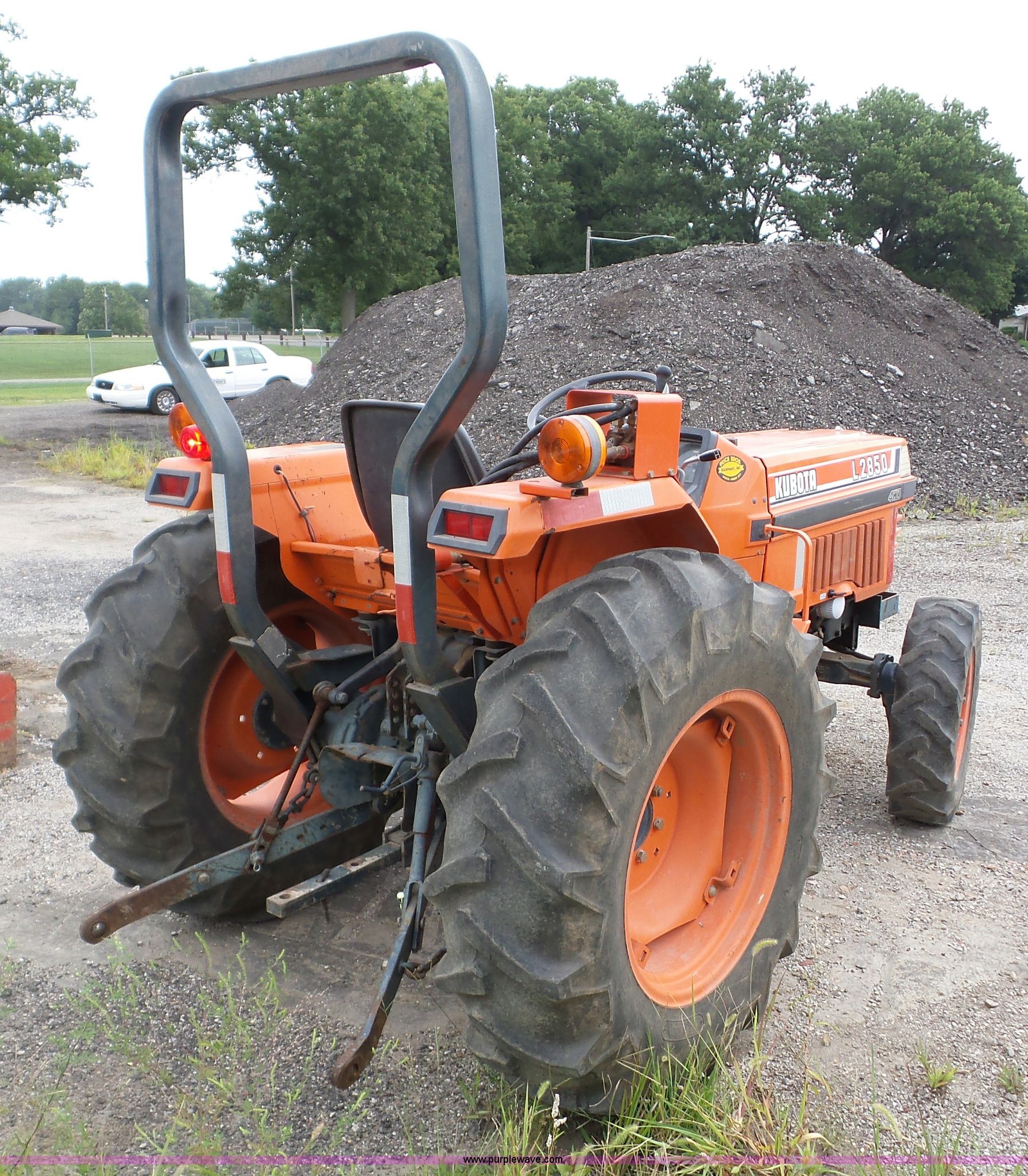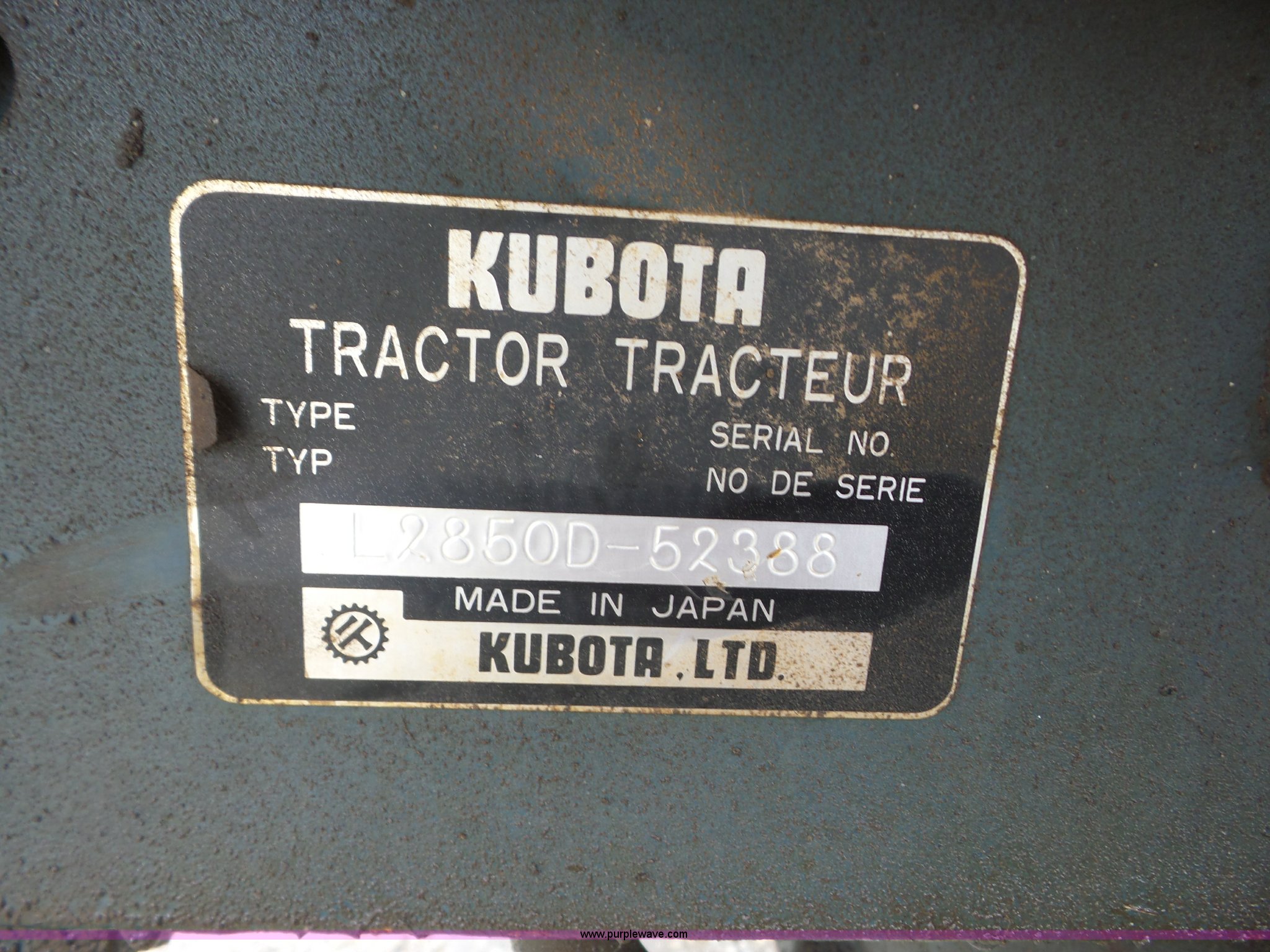 Purple Wave is selling a used Tractor in Kansas. This item is a 1988 Kubota L2850 tractor with the following: 427 hours on meter, Kubota 1.7L four cylinder diesel engine, Shuttle shift transmission, 8F-7R gears, Differential lock, Suspension seat, Three point, 540/1000 PTO, Rear hydraulic remote set, 8.3-16 front tires, 13.6-24 rear tires, Dead battery, Serial L28500-52338
