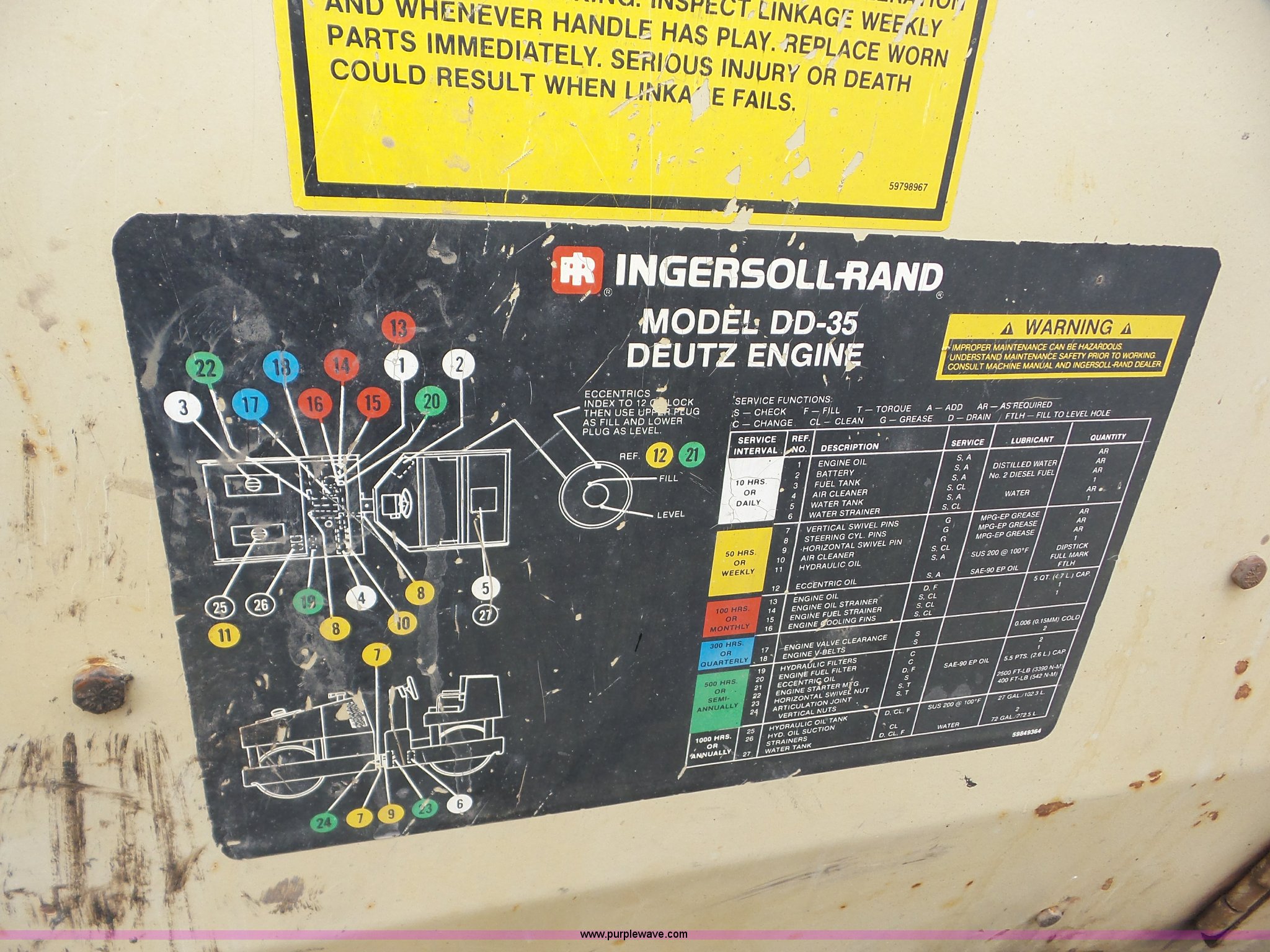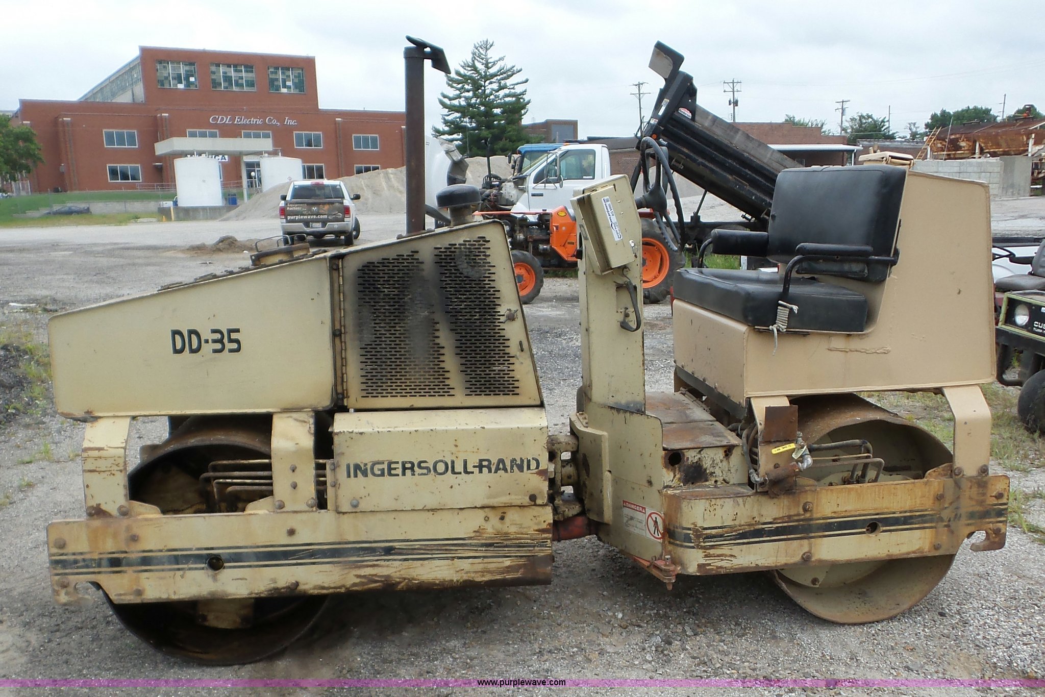 Purple Wave is selling a used Double Drum Roller Compactor in Kansas. This item is a Ingersoll Rand DD-35 single drum roller with the following: 6,933 hours on meter, Deutz two cylinder diesel engine, Hydrostatic transmission, Suspension seat, Vandal cover, 39"W x 40" diameter smooth drum, Double vibratory system, Front and rear water spray applicator, Front drum drive motor leak